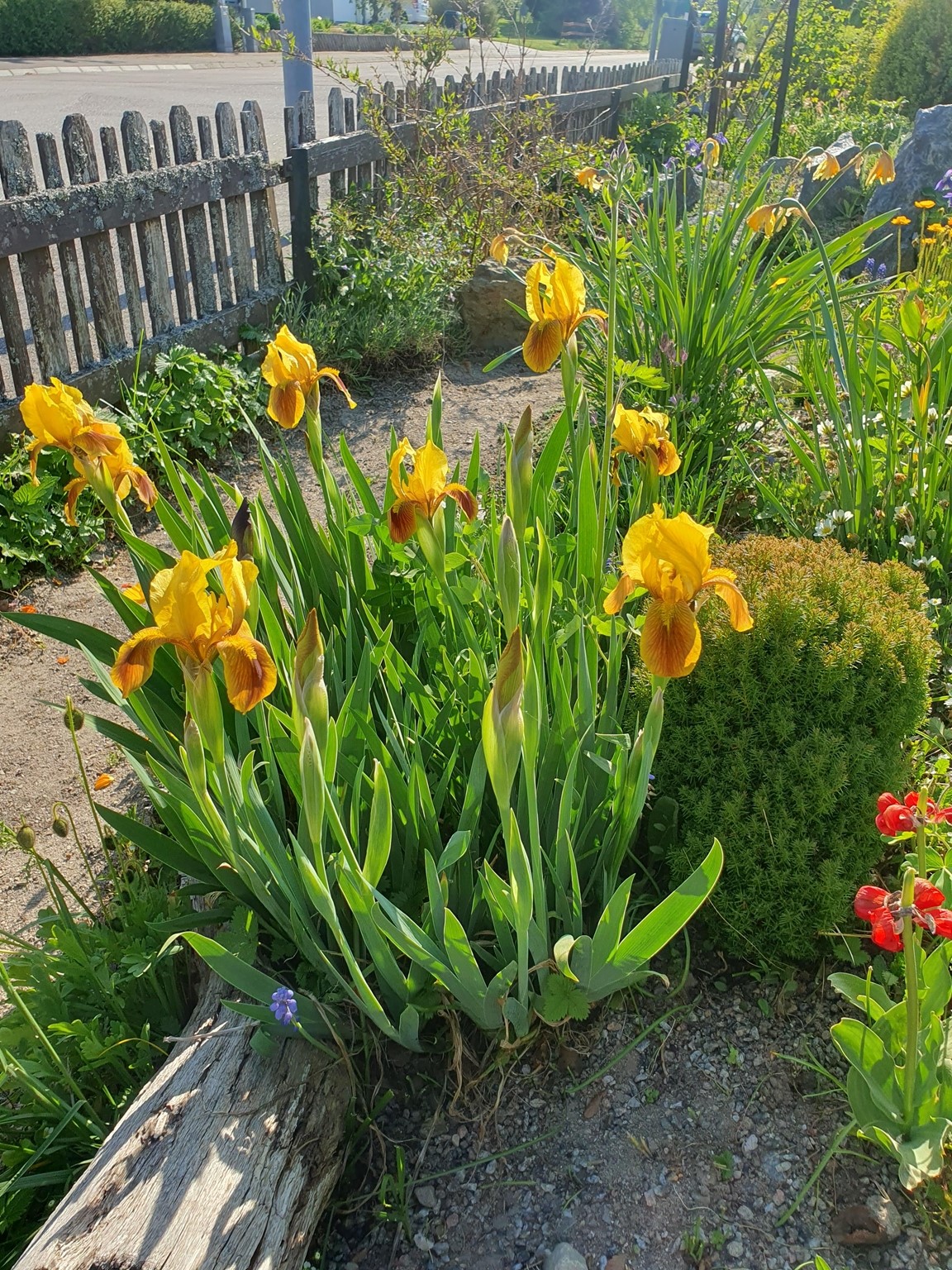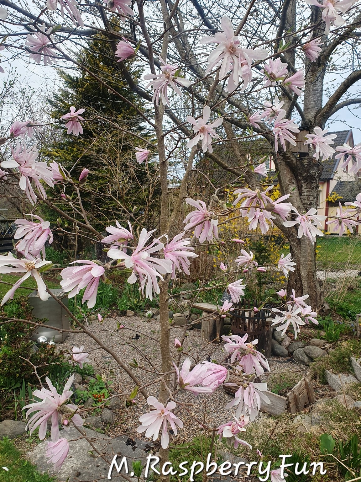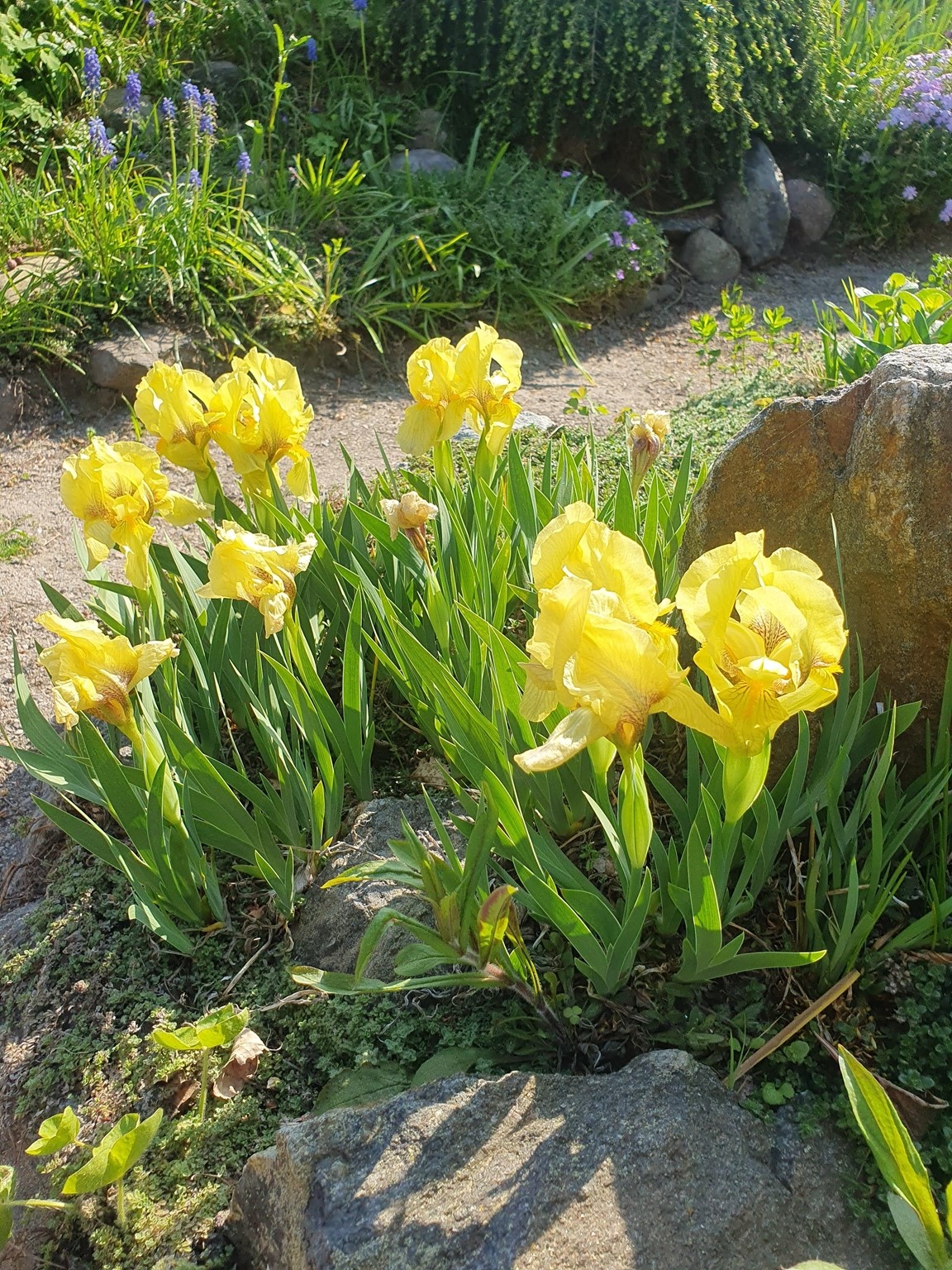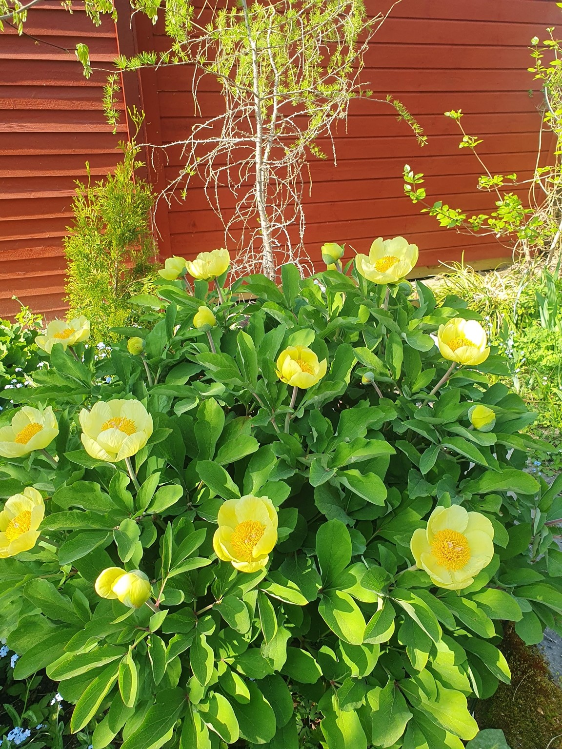 Vårträdgård mycket lökar och lundväxter. Flera gammaldags rosor och flox mm. Kaffe och perenner till försäljning