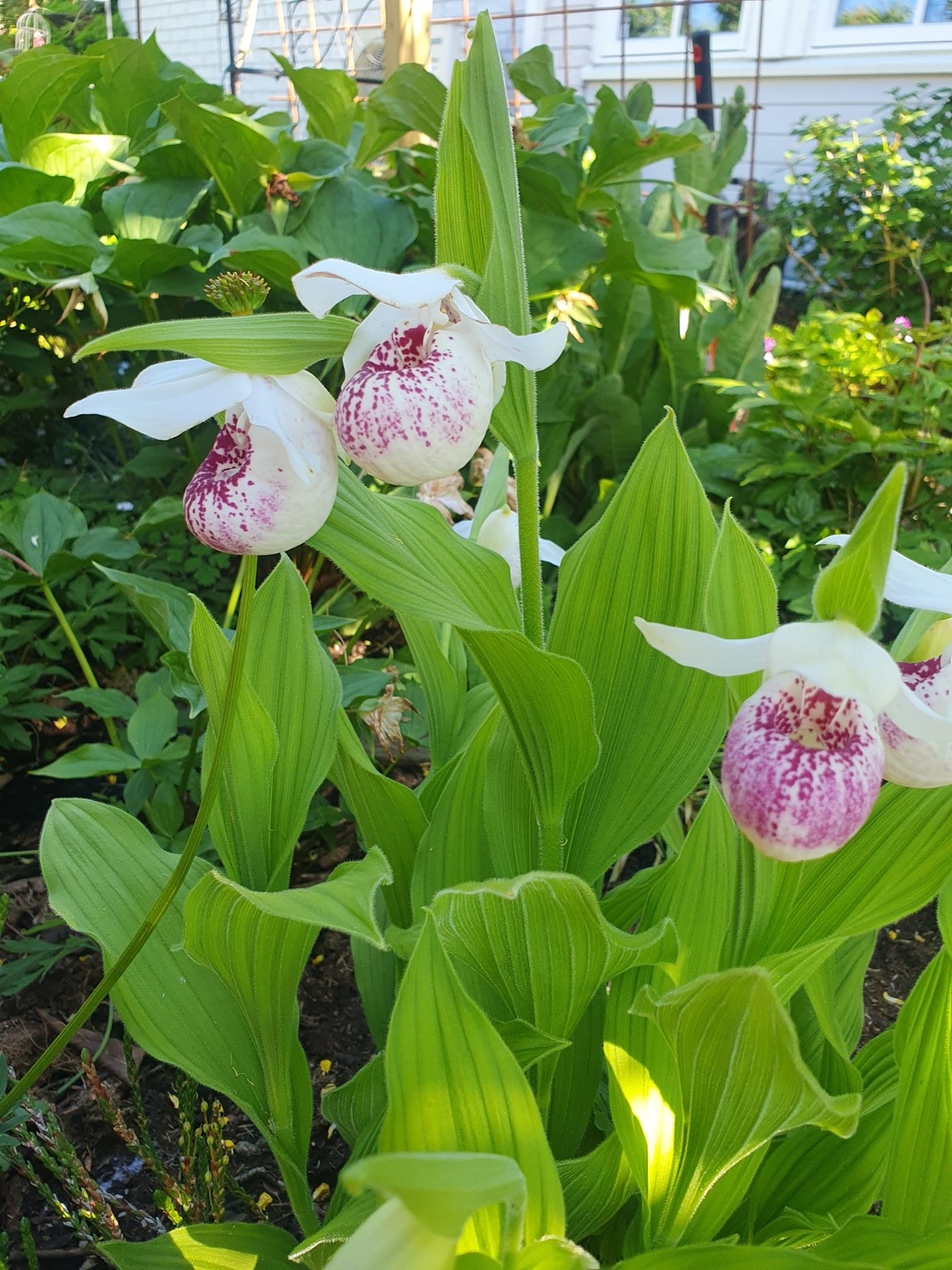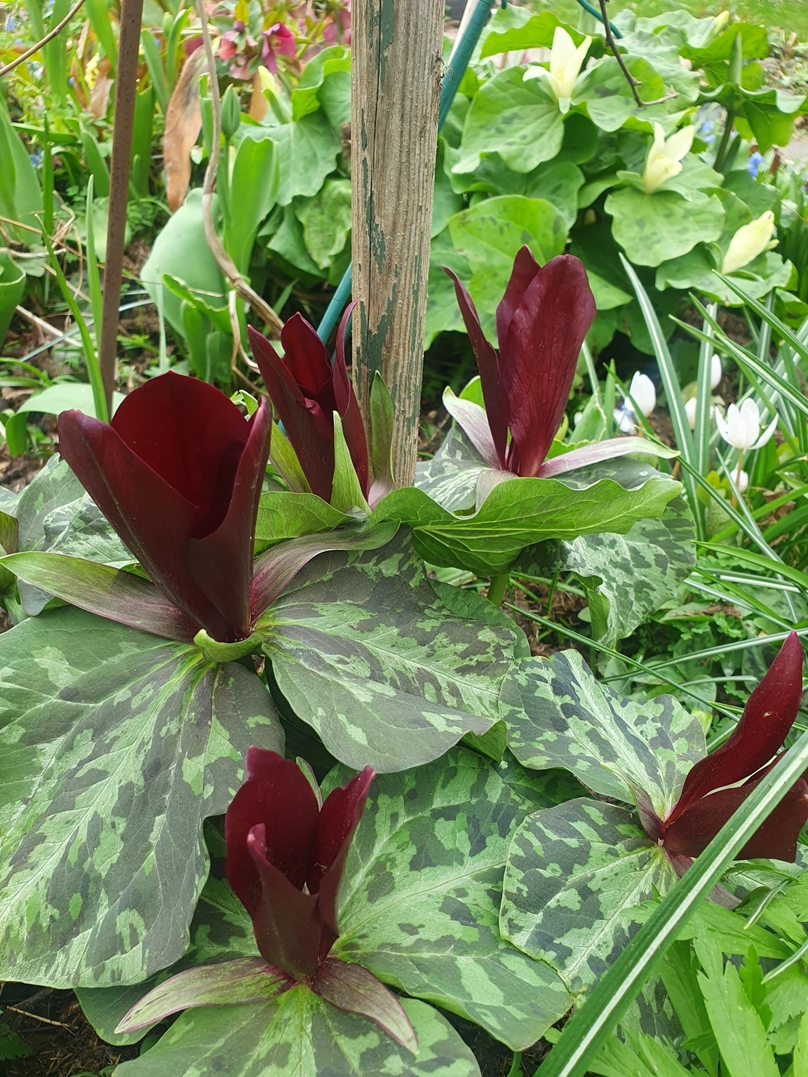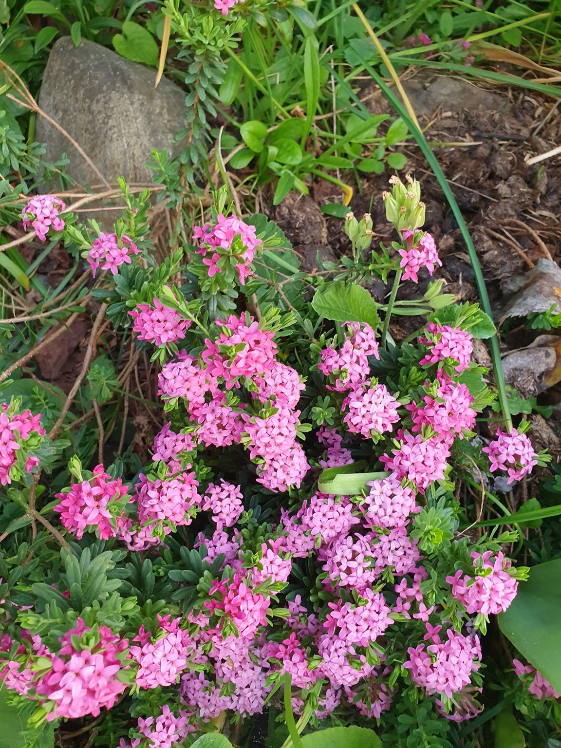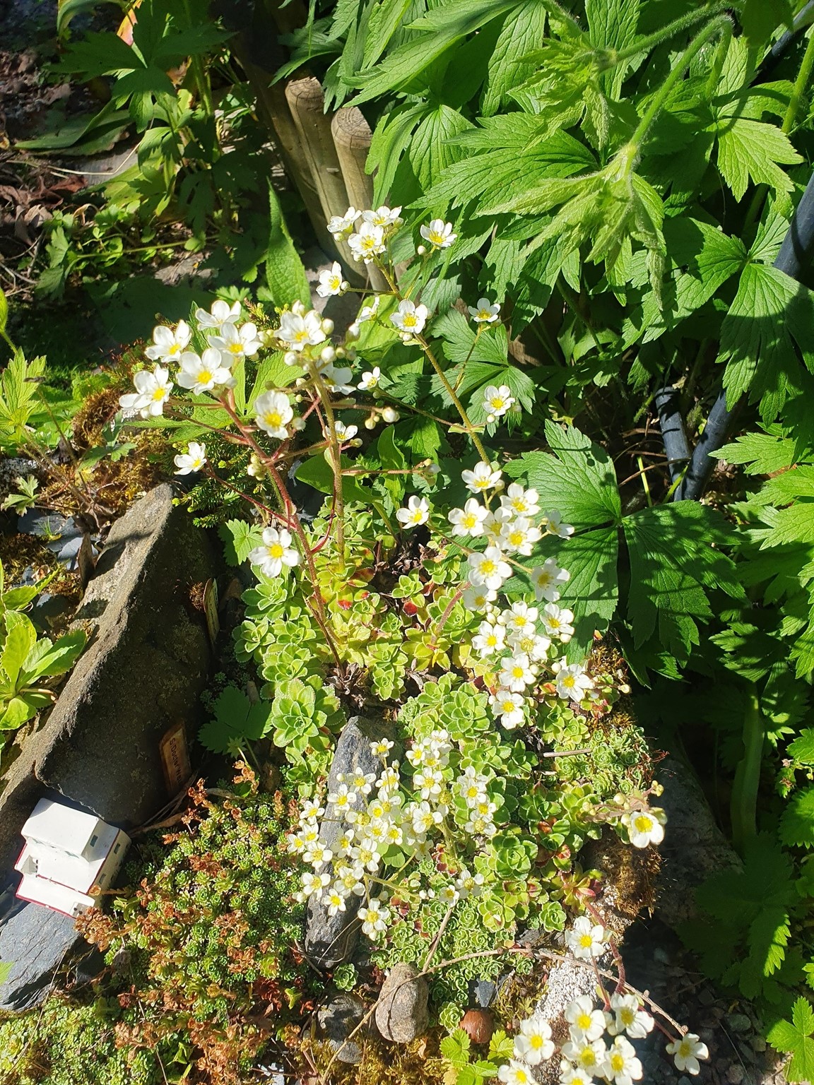 Vårträdgård mycket lökar och lundväxter. Flera gammaldags rosor och flox mm. Kaffe och perenner till försäljning
