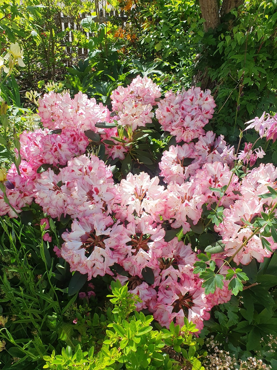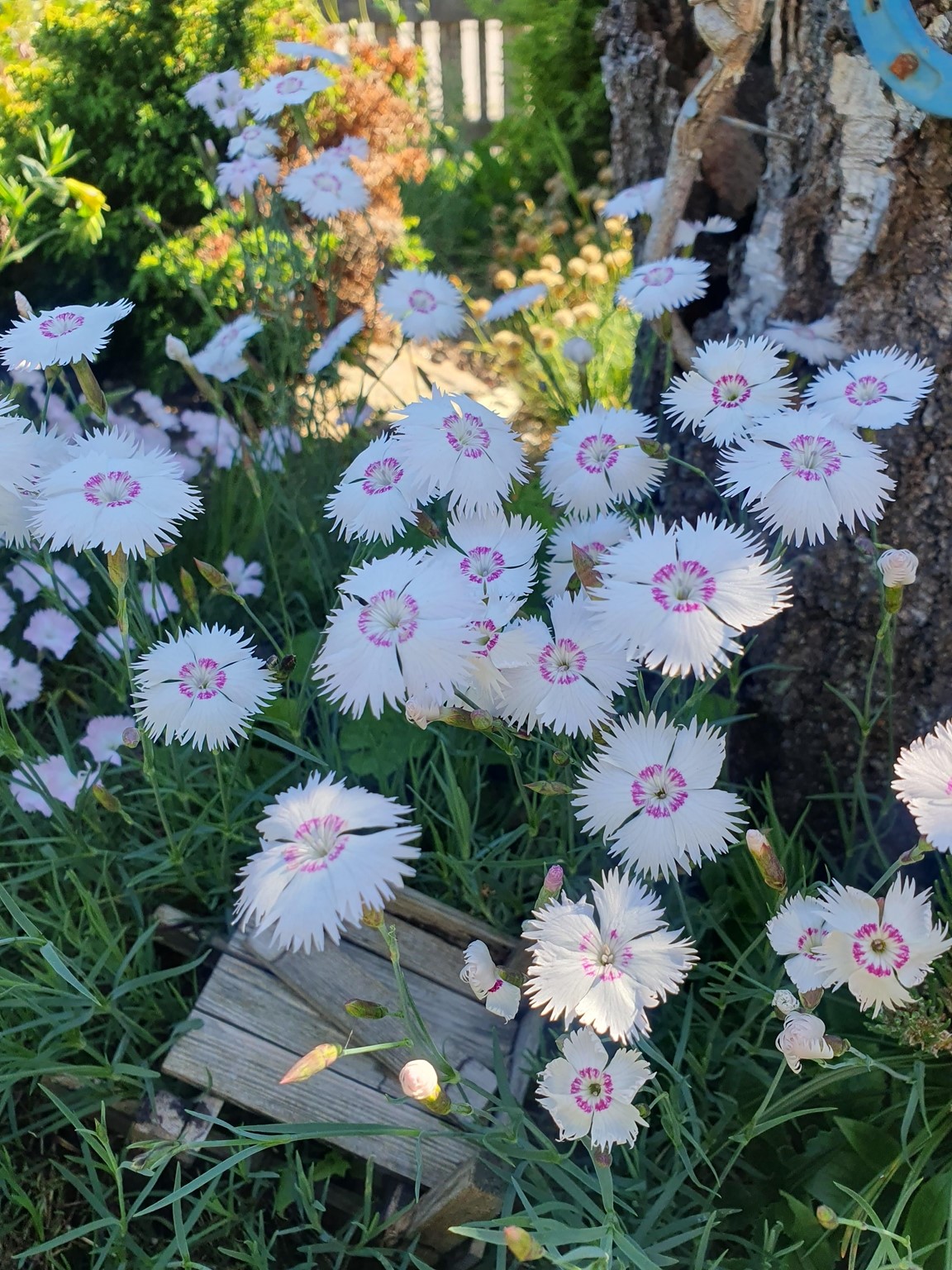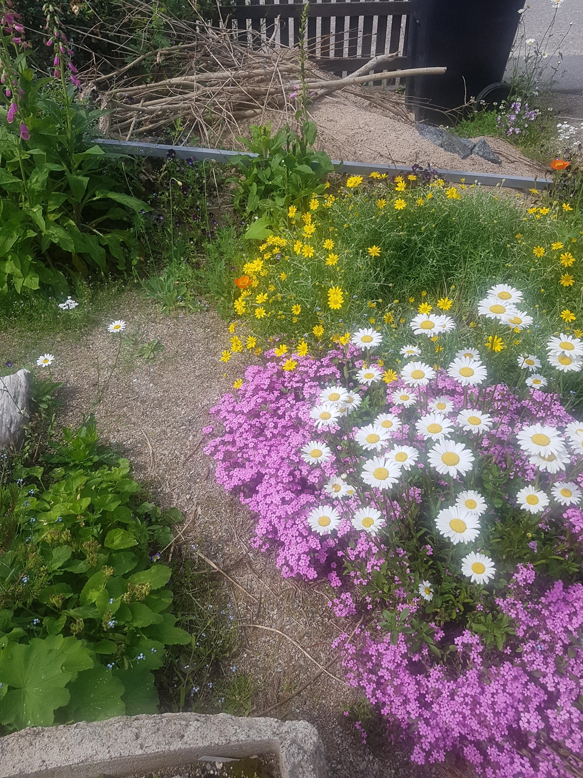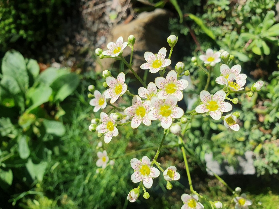 Vårträdgård mycket lökar och lundväxter. Flera gammaldags rosor och flox mm. Kaffe och perenner till försäljning