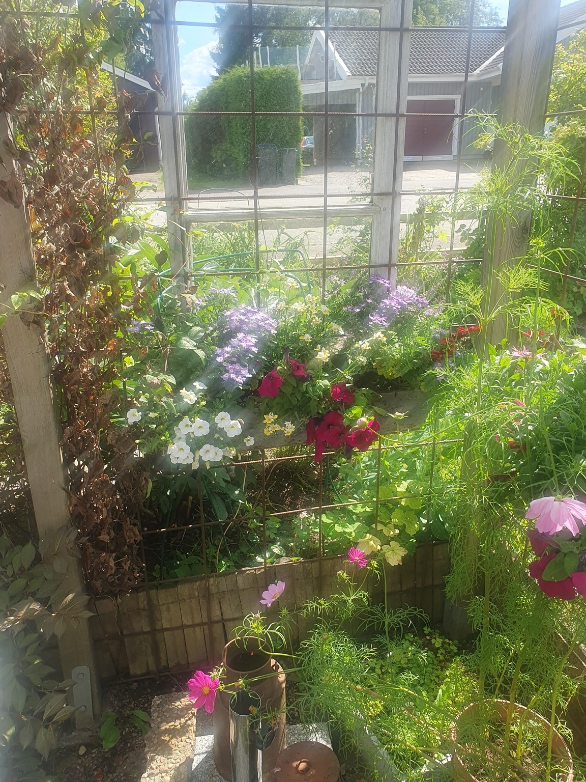 Blandad samlarträdgård med olika teman. Lund, stenparti, damm och gammaldags rosor. Trädgård under uppbyggnad och ombyggnad. Tråg och fantasiinslag. Hörntomt på 800m2 med ständigt minskad gräsmatta.