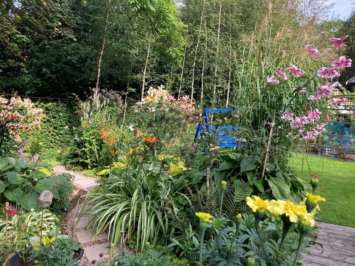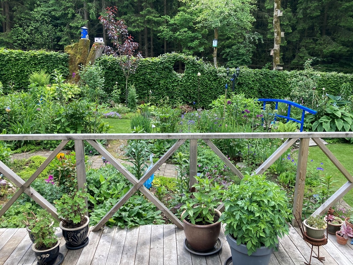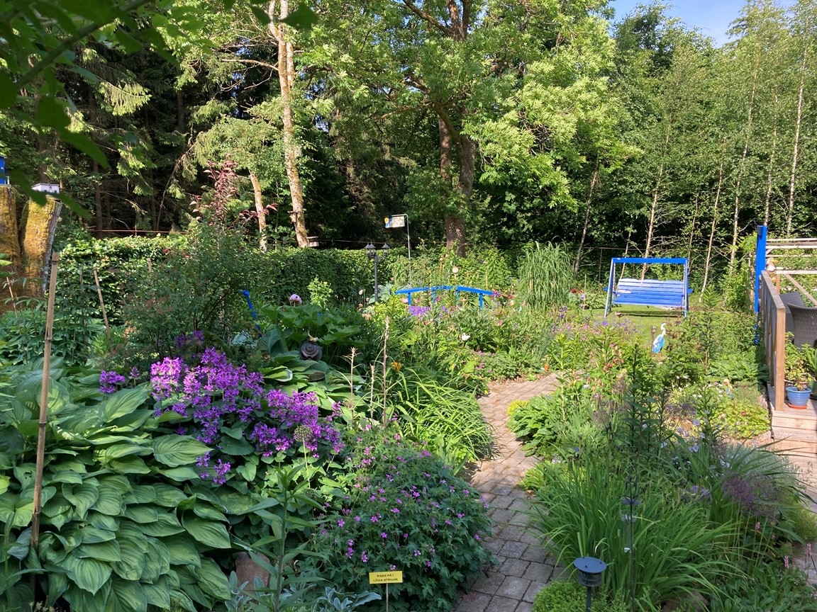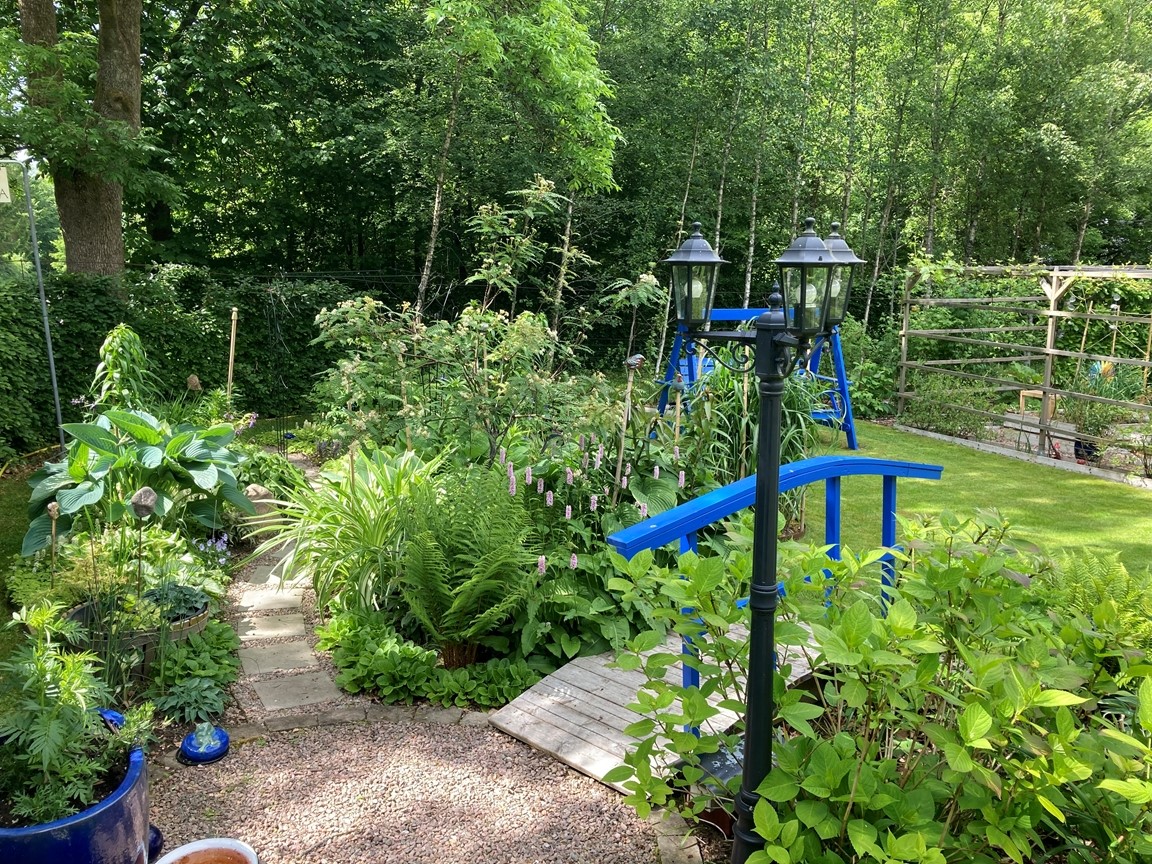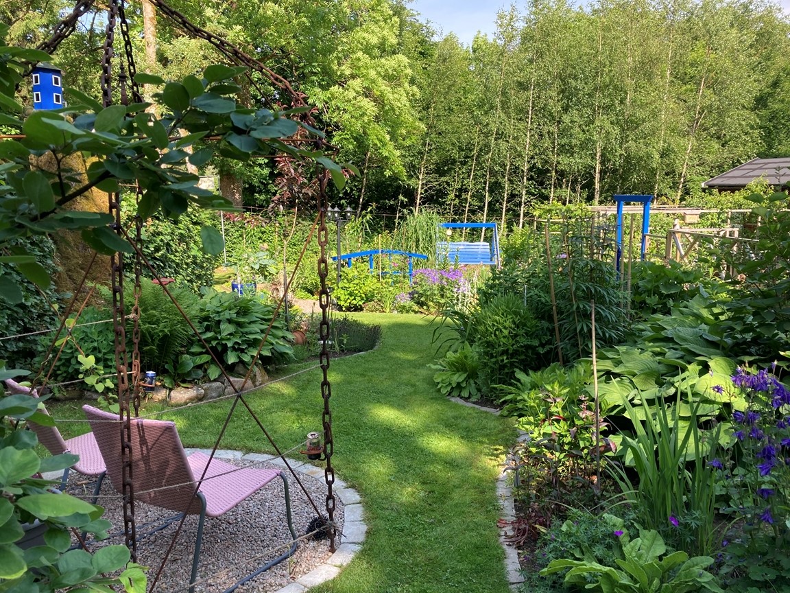 Stora, prunkande perennrabatter med vindlande stråk med olika sittplatser samsas med finurliga utsmyckningar.