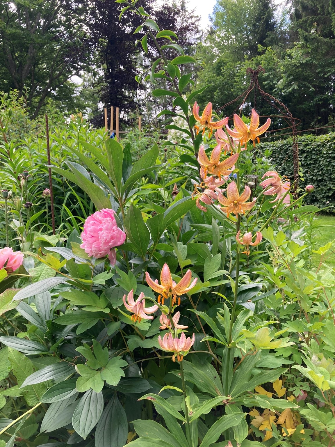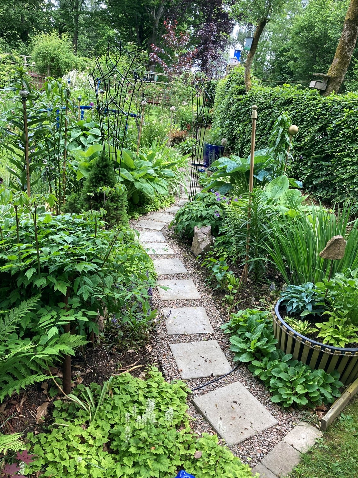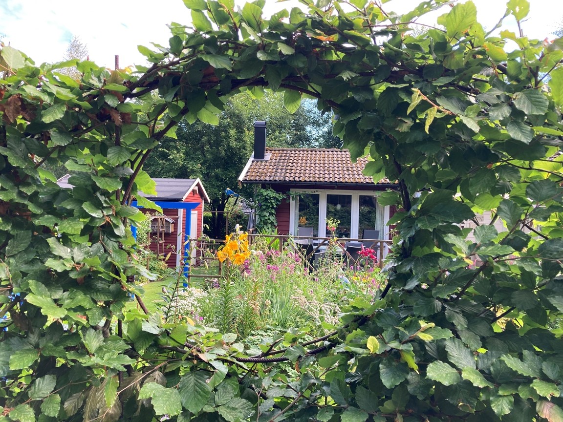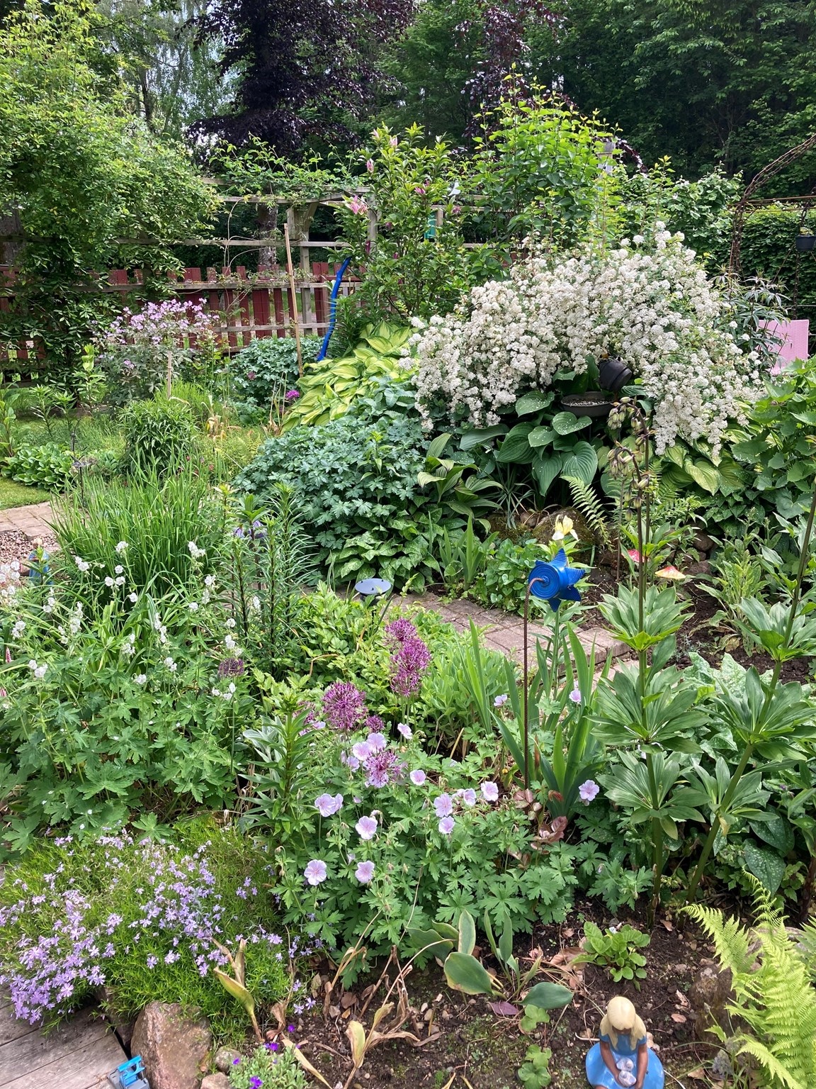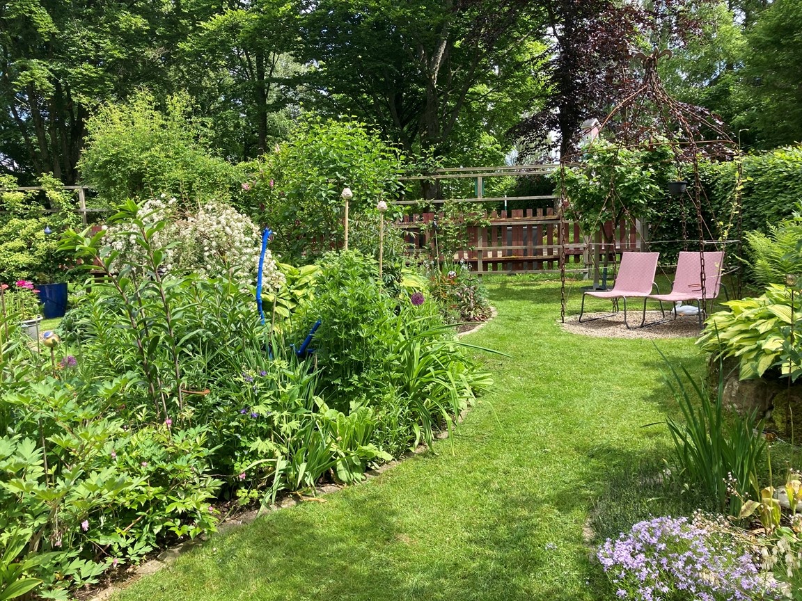 Stora, prunkande perennrabatter med vindlande stråk med olika sittplatser samsas med finurliga utsmyckningar.