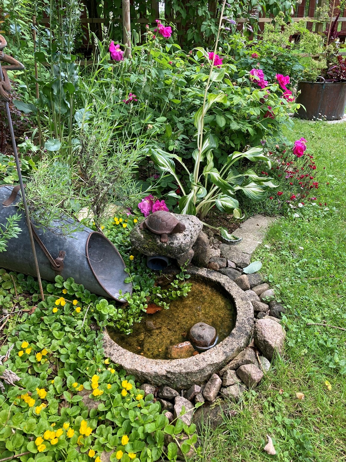 Här tas allt regnvatten omhand i snillrika konstruktioner som matar bevattningssystem och självpåfyllande fågelbad.
