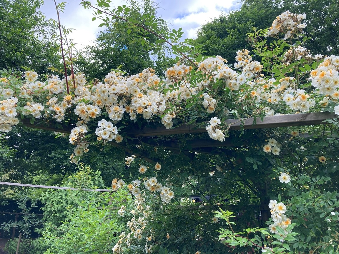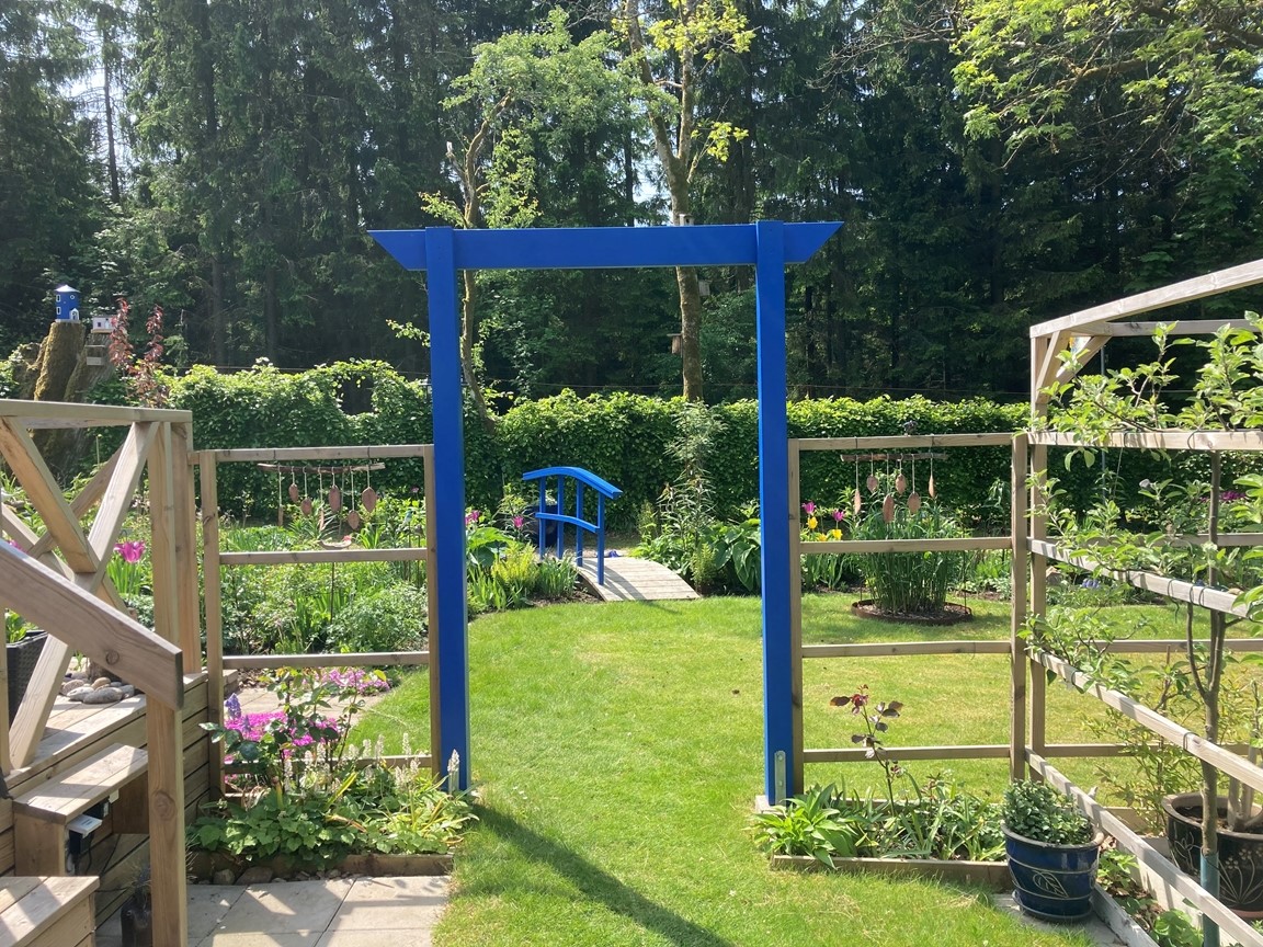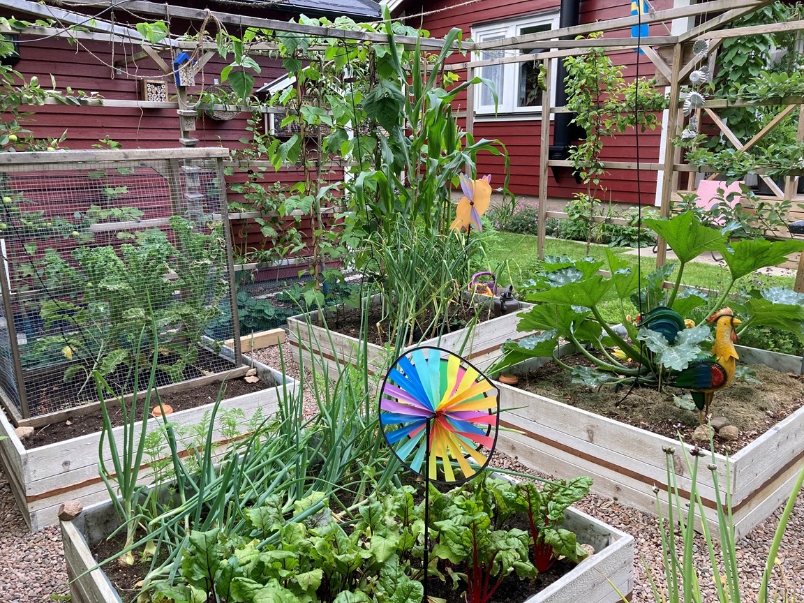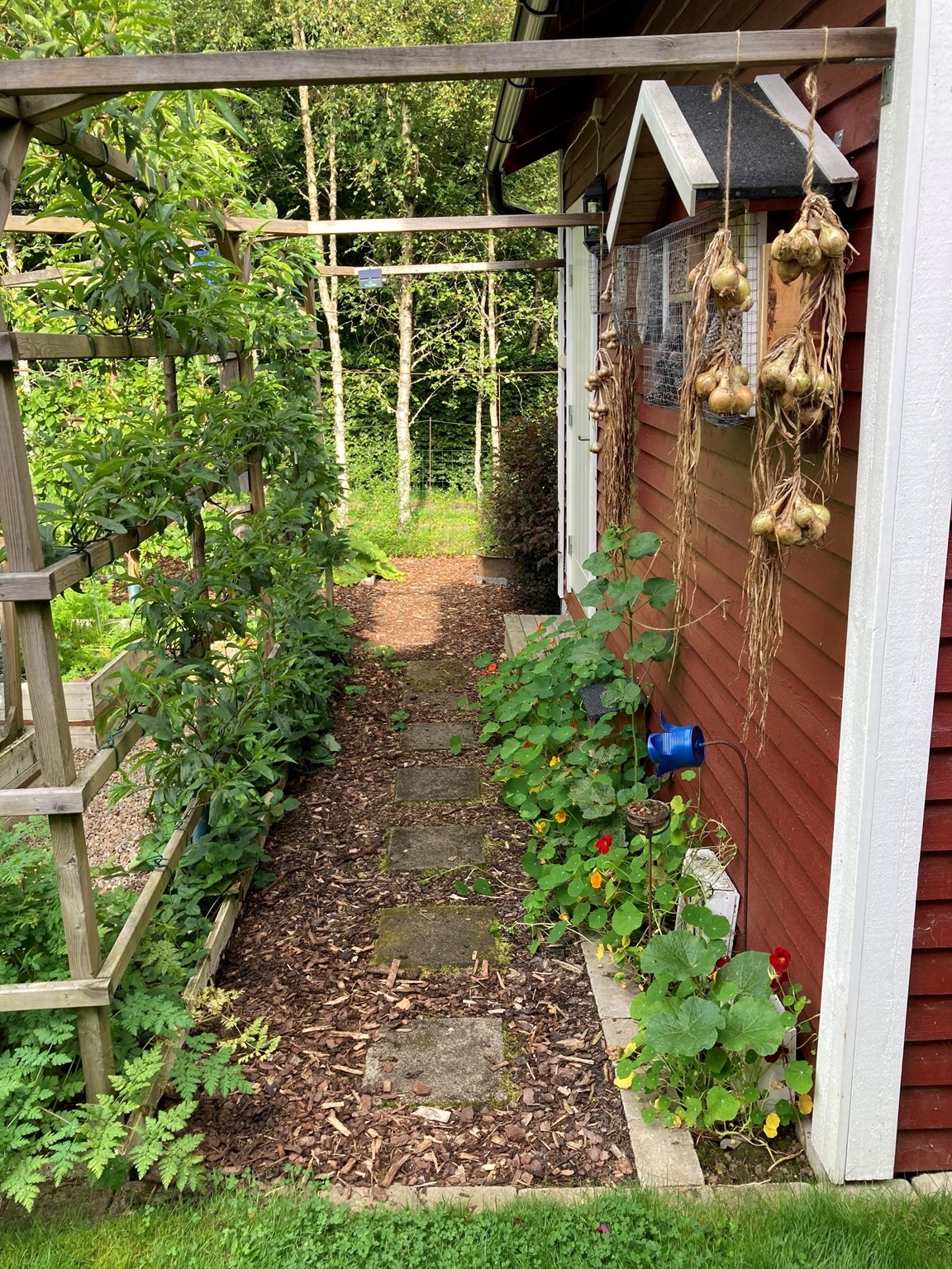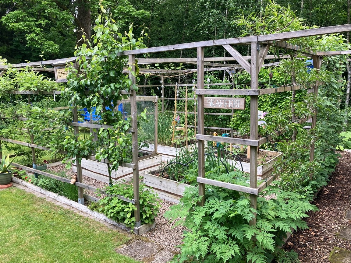 Köksträdgården är kringgärdad med spaljéade fruktträd och bärbuskar och full med ätbara grödor.