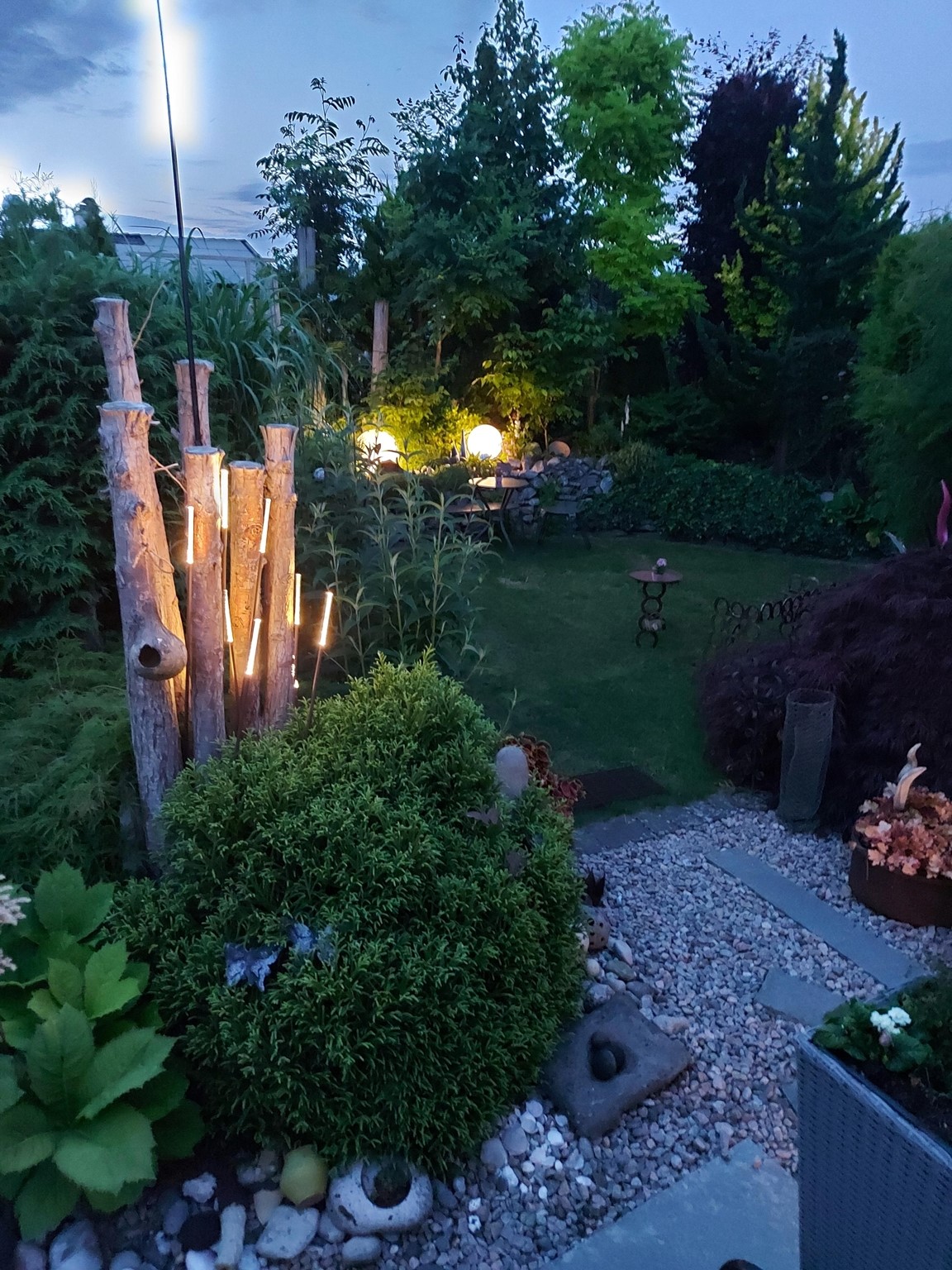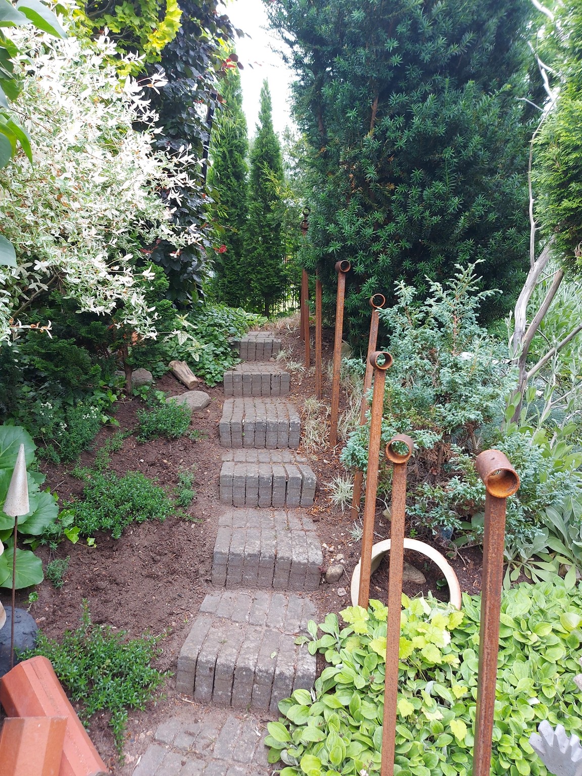 Vi flyttade in i december 1995 och då bestod trädgården i stort sett av en stor gräsmatta. De första åren hände inte så mycket, först 2003 började det hända en del. Liten villaträdgård på 785 kvm med lite nivåskillnader. Mycket sten, natursten både liten och stor, skiffer och byasten. Vintergröna växter, perenner och träd som t ex sydbok och näsduksträd (som ännu ej blommat). Damm med litet vattenfall som porlar behagligt och ger ro. Armeringsmattor som bildar staket och växtstöd och även andra saker i rost. ”Skelett” av både tuijor och rostig plåt med klängväxter i. En del av Ann Margreths egentillverkade keramik (stengods) finns också lite varstans – även till försäljning. Det finns även lite betong och ”svetsade saker” till försäljning.