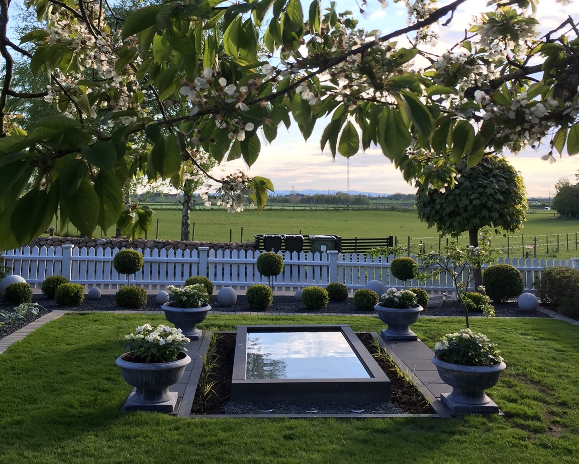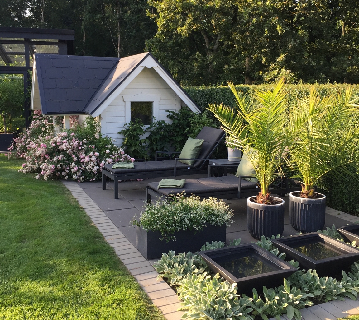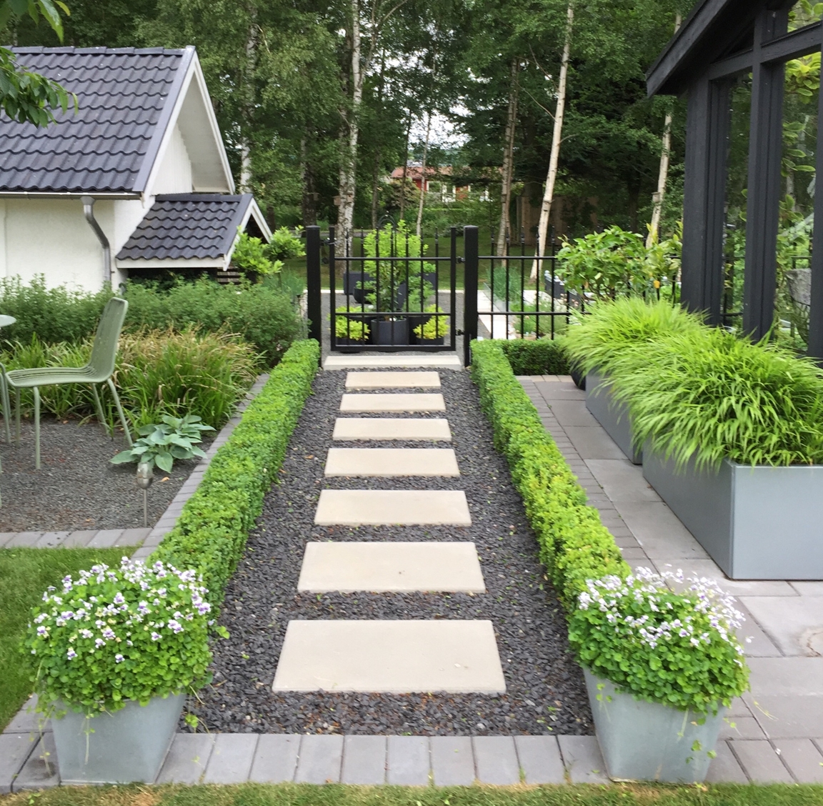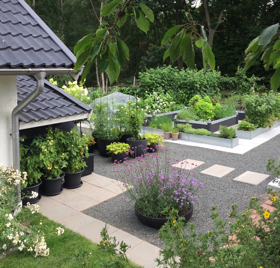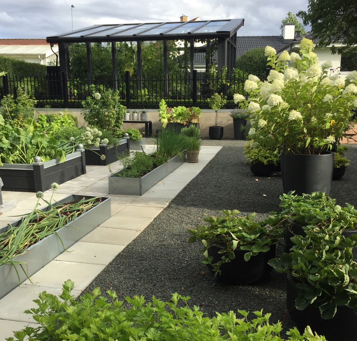 Villaträdgård på drygt 1000 kvm under uppbyggnad + naturtomt på 2300 kvm som gränsar till en damm. Växthus i trä som vi byggt 2019 efter egen design där det odlas främst tomater, gurka, basilika, physalis, tomatillo m m. 2020 anlades en ny köksträdgård på naturtomten. Målet är att på den odlingsyta vi har bli så gott som självförsörjande på grönsaker, bär och frukt under odlingssäsongen. Huset är byggt 1982 men trädgården har efterhand förändrats och små projekt görs då och då. 2021 tillkom en liten trädgårdsdamm.