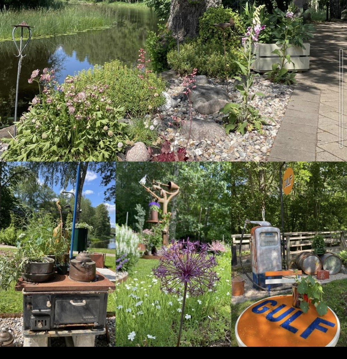 En relativt nyskapad trädgård där växter i rabatter och krukor möter gamla, gärna rostiga saker i en vacker bruksmiljö, trädgården är kantad med äldre höga träd och rinnande vatten.