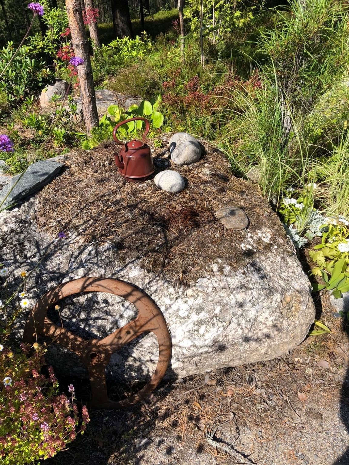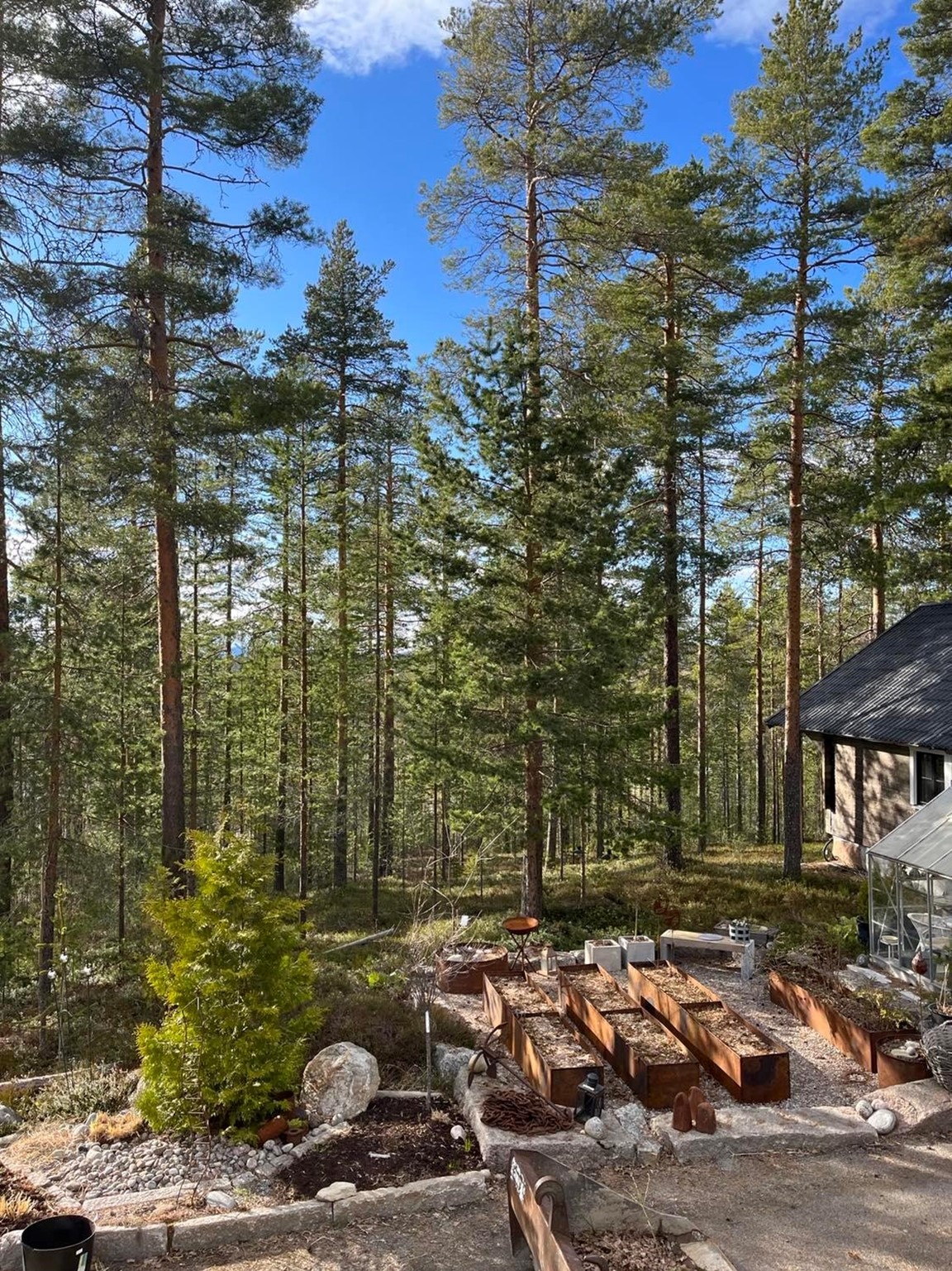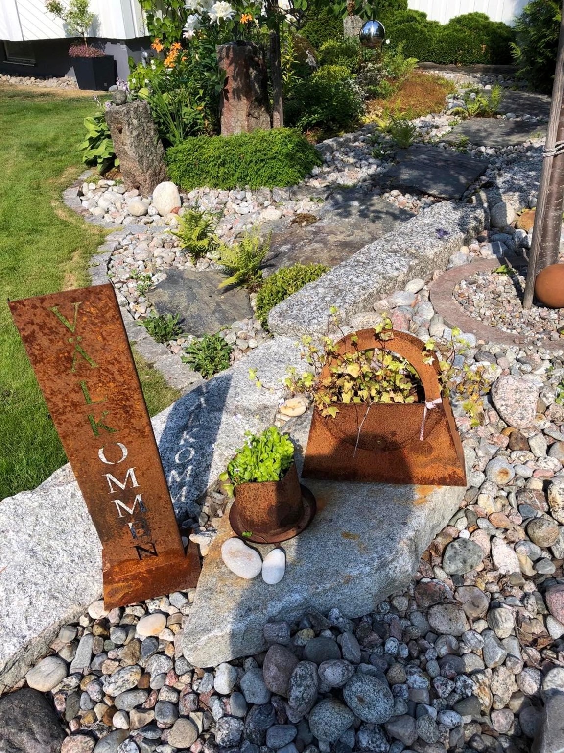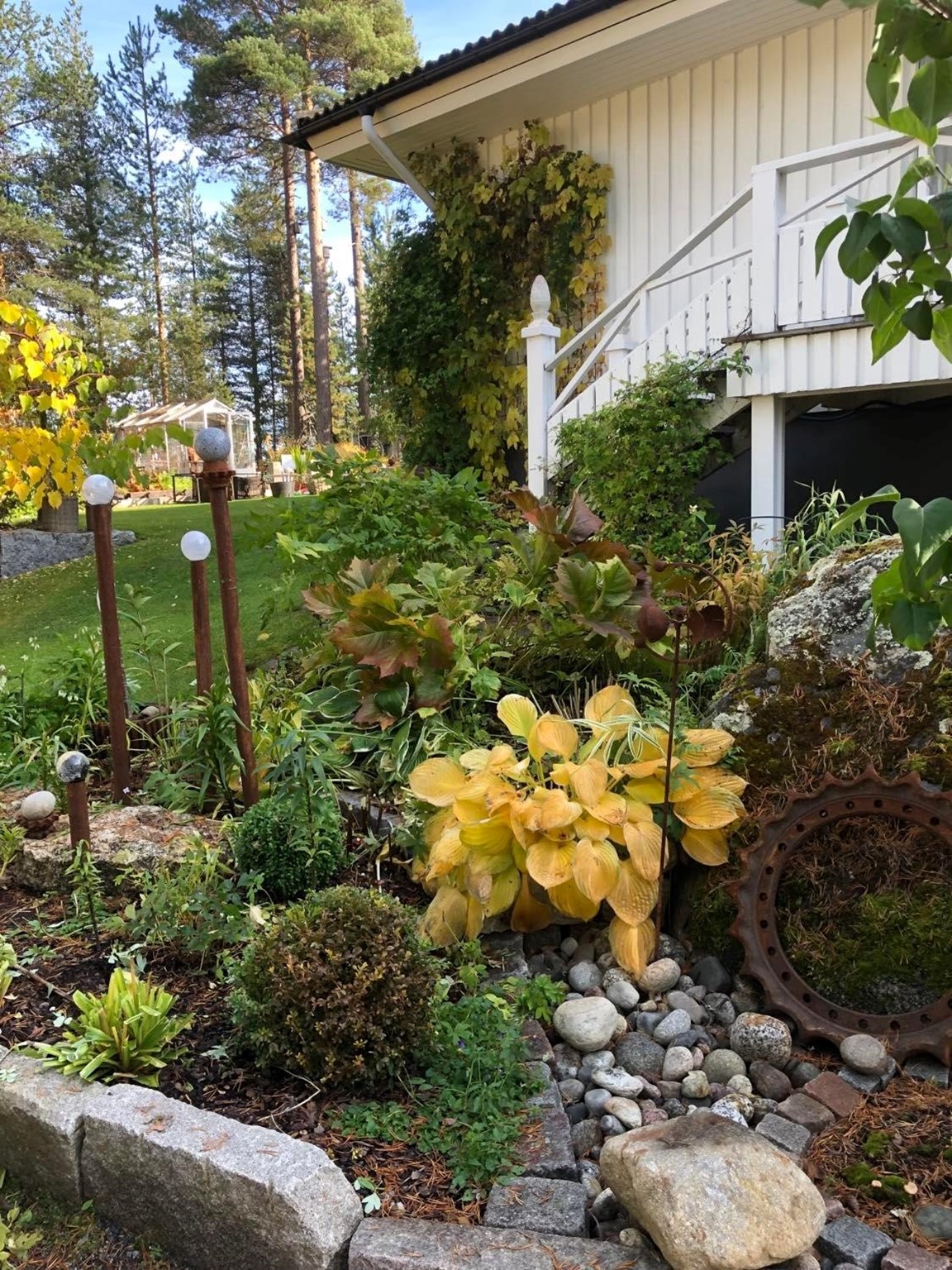 En trädgård med mycket sten, gröna växter och blommor. Halva trädgården är naturtomt som består av tallskog.