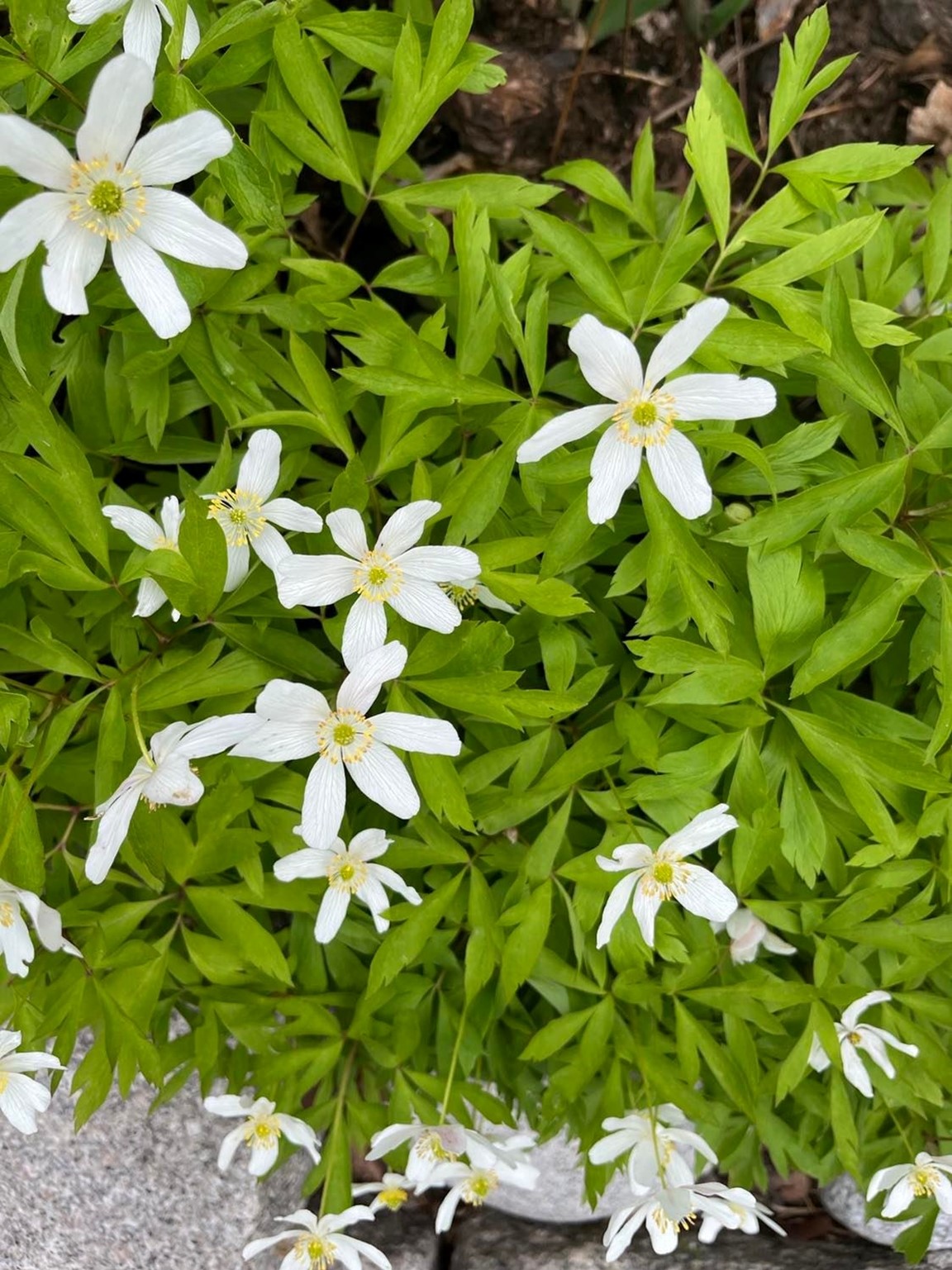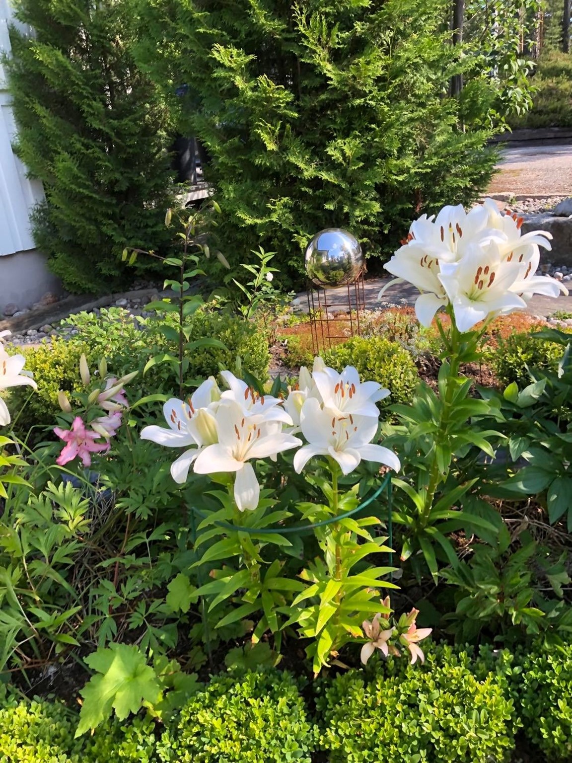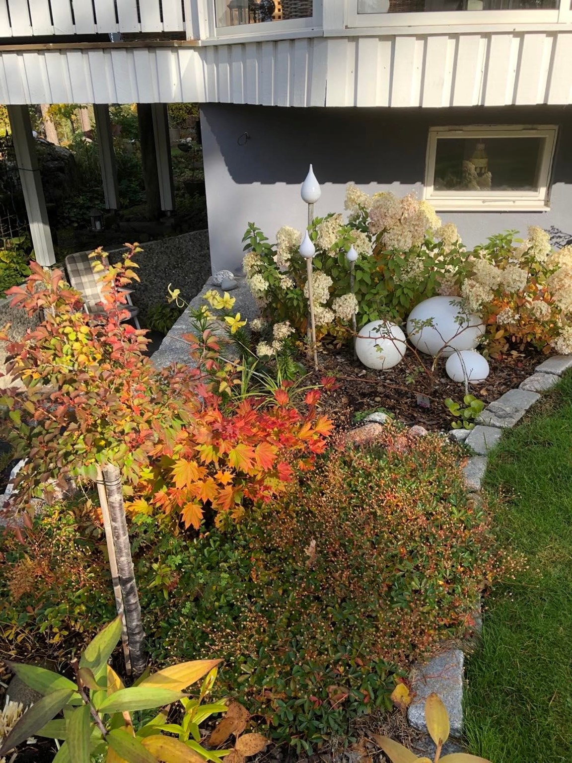 En trädgård med mycket sten, gröna växter och blommor. Halva trädgården är naturtomt som består av tallskog.