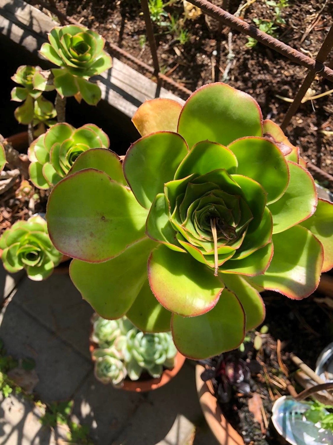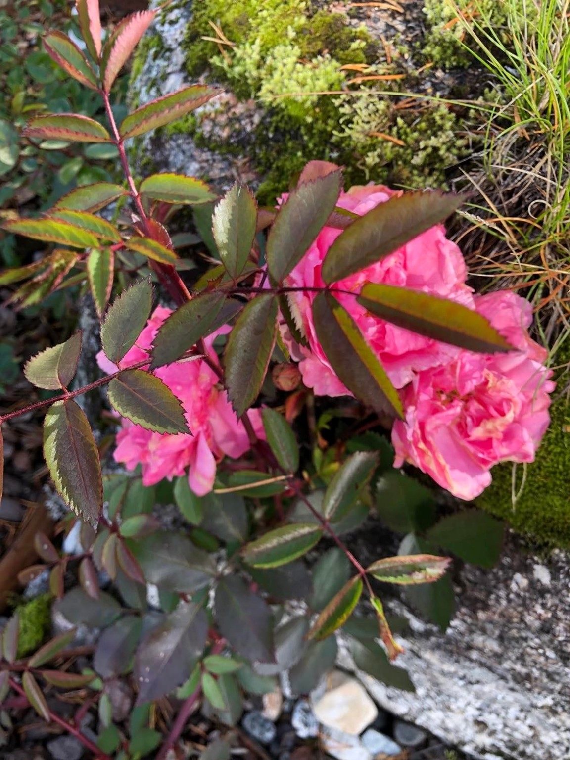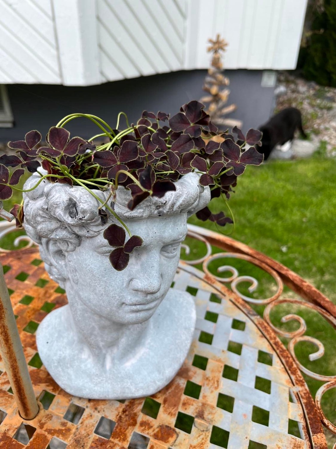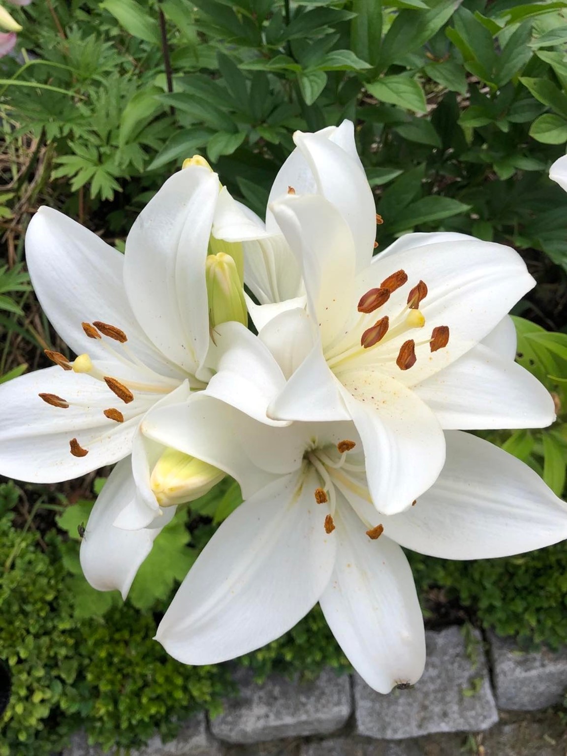 En trädgård med mycket sten, gröna växter och blommor. Halva trädgården är naturtomt som består av tallskog.