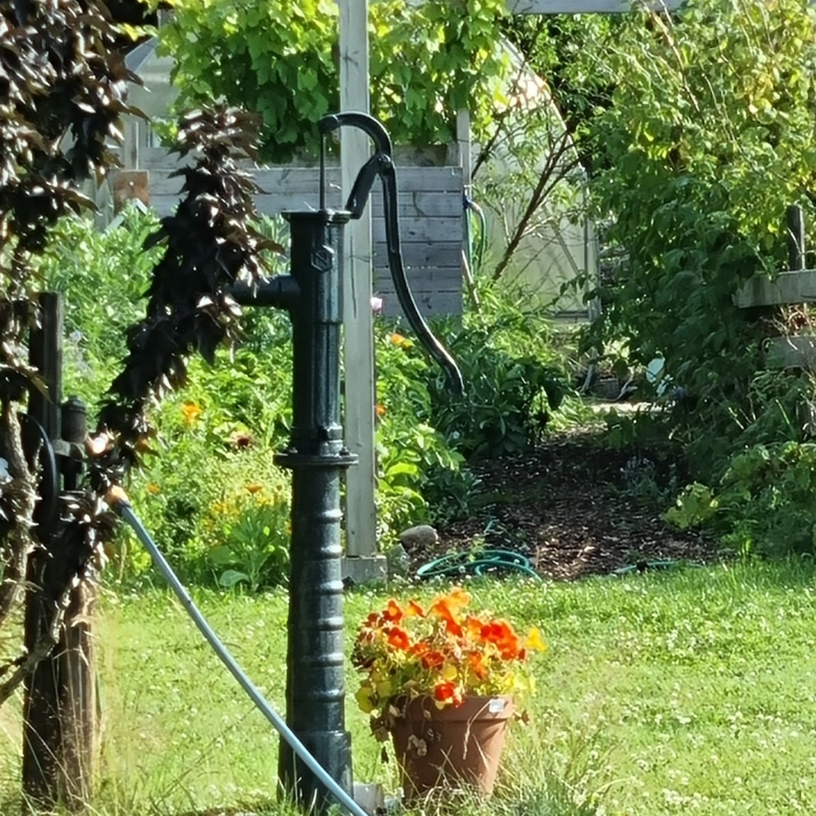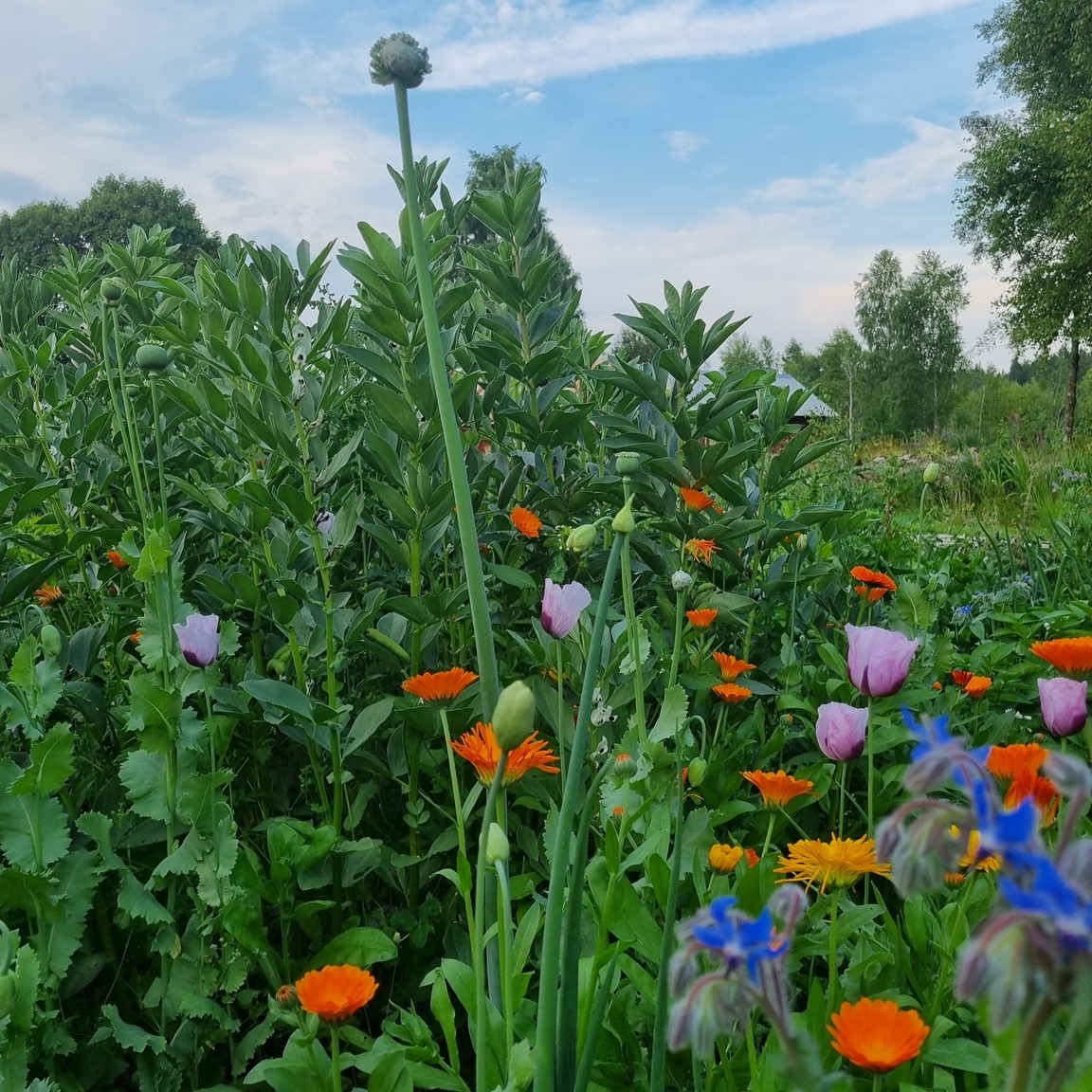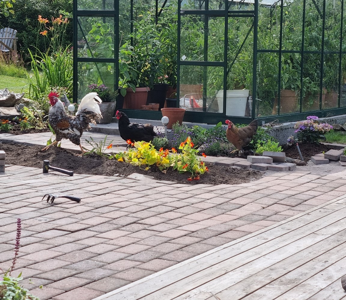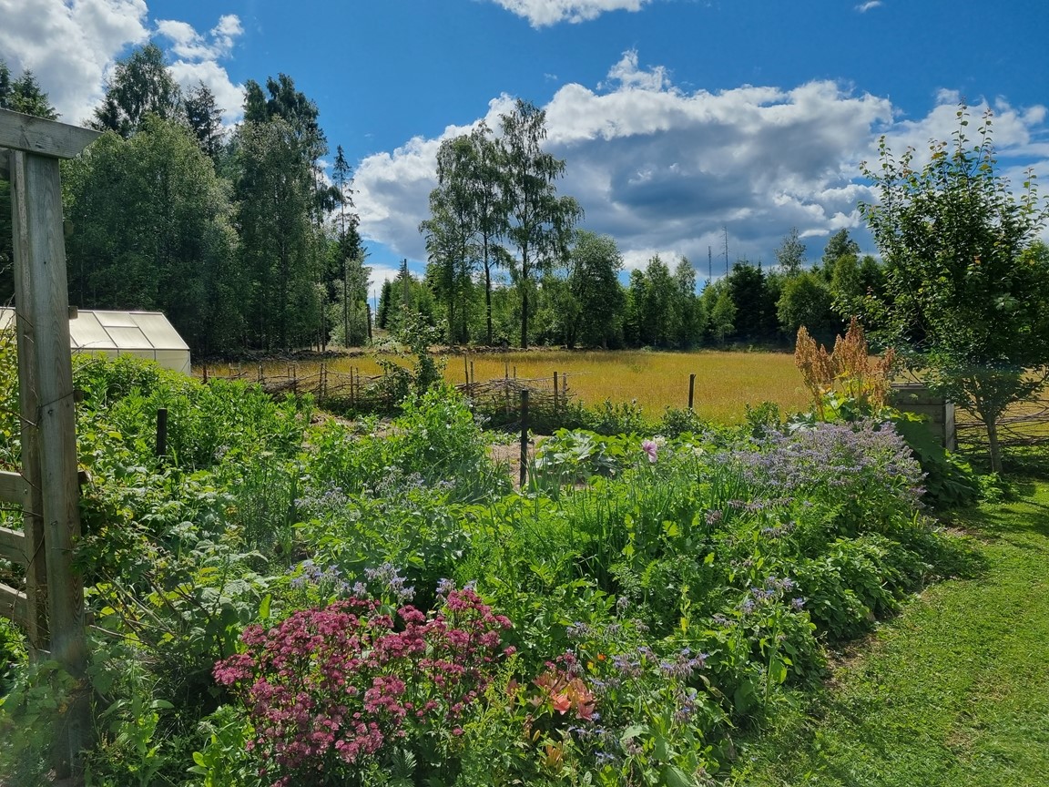 Grönsaksodling som är självförsörjande och platser formade av rabatter. Egen biodling höns och kaninuppfödning. Det är fortfarande i mindre skala men det är under uppbyggnad. Vi jobbar även i en matrabatt och växter som ska gynna våra bin
