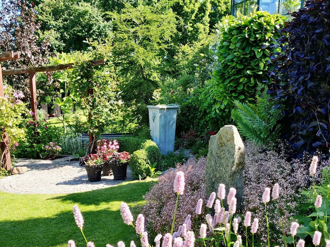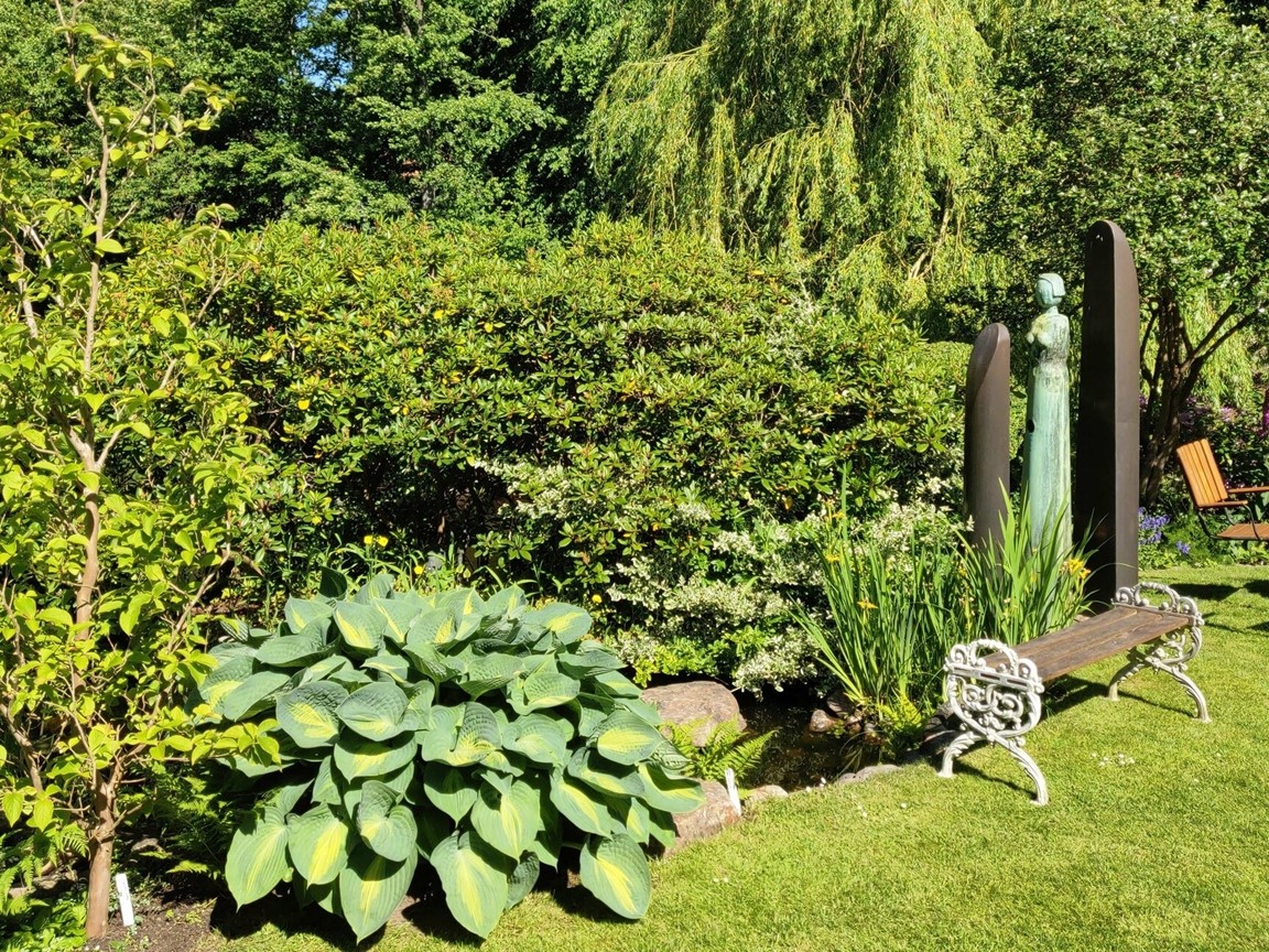 Välkommen till en oas vid Rönne å. En spännande artrik trädgård på cirka 850kvm. Trädgården rymmer många ovanliga växter och installationer. Upplev vår etagerika trädgård med bland annat slingrande gångar, damm med vattenfall och orangeri.