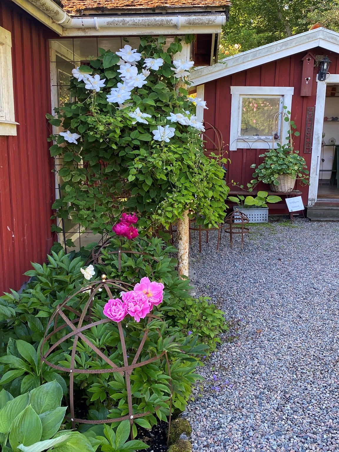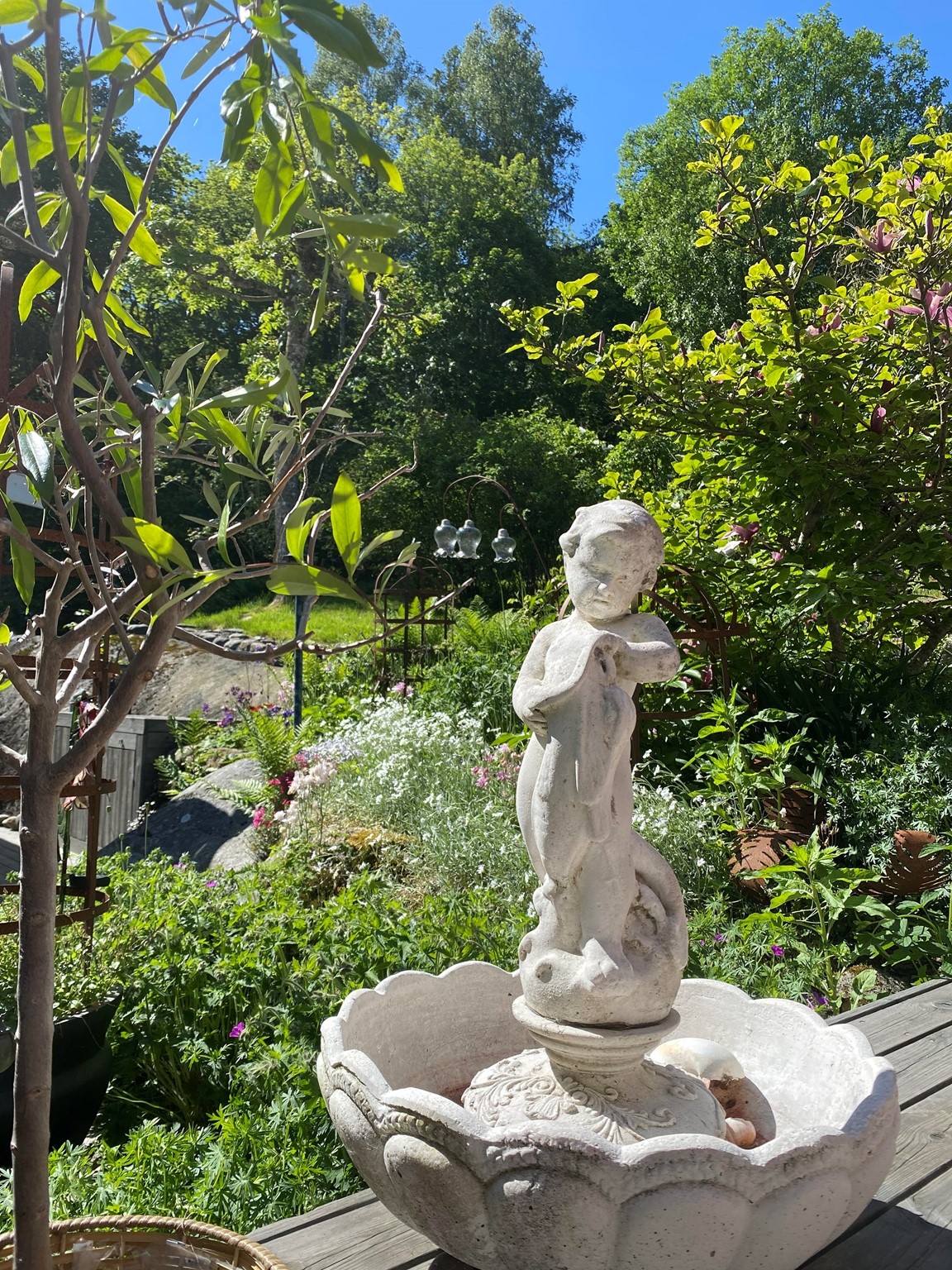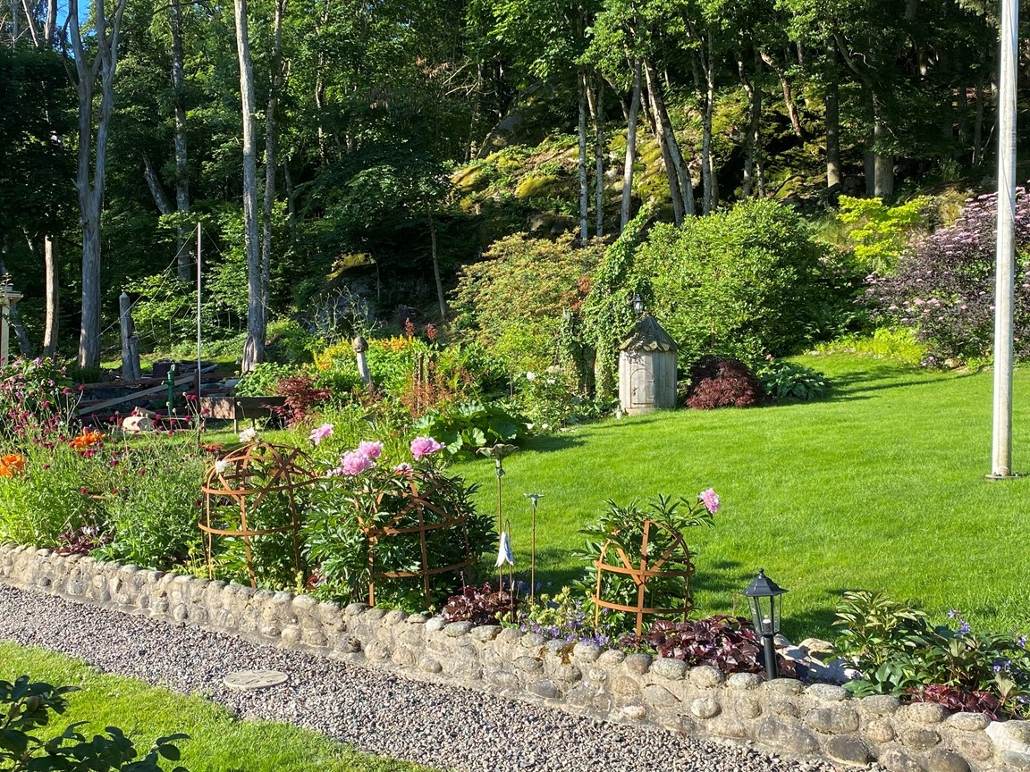 En ljuvlig blandning av engelsk cottage, lite saga och vanlig svensk villaträdgård. Några utvalda växter och planerade områden samsas med många spontana inköp och experimenterande! Jag gillar att arbeta i keramik, metall, sten och trä i murar, dammar, blomsterstöd och olika trädgårdsdekorationer. 38 sorters rosor och ca 12 sorters pioner doftar underbart bland alla övriga blommor och växter på våra 1894kvm.