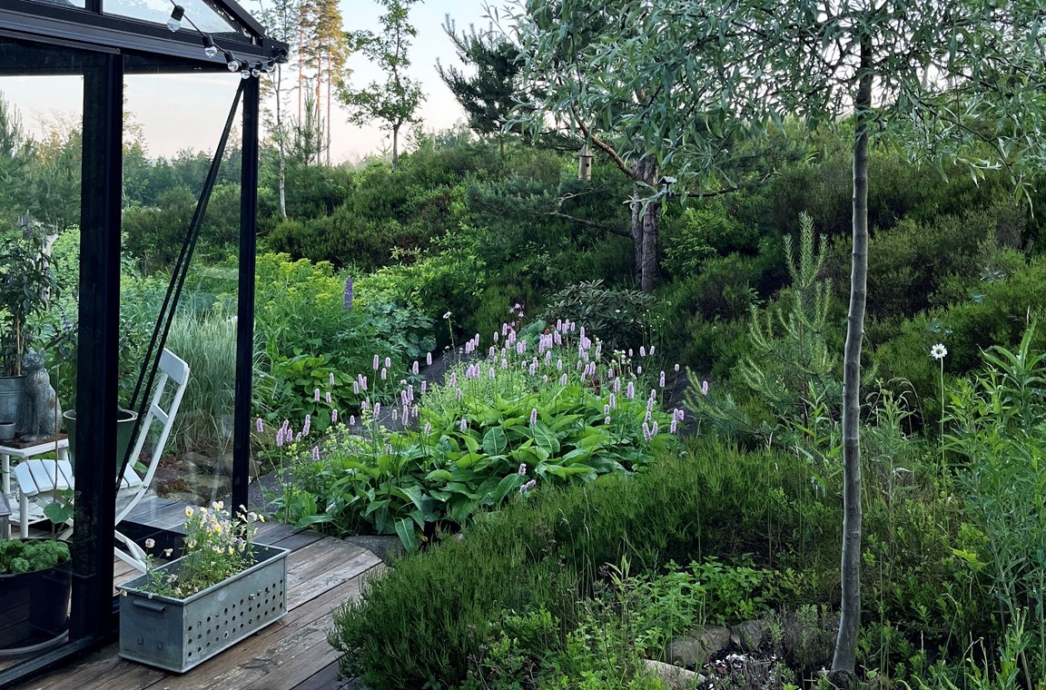 Perennrabatterna är mina canvas och hämtar inspiration från Piet Oudolf och engelsk trädgårdsestetik. Odlar under 2026 snittblommor för egenhushållning, tillsammans med favoritgrönsaker i min terrasserade portager. I växthuset odlas förutom givna tomater och slanggurka alltid någon ny liten annorlunda sort eller spännande grönsak.