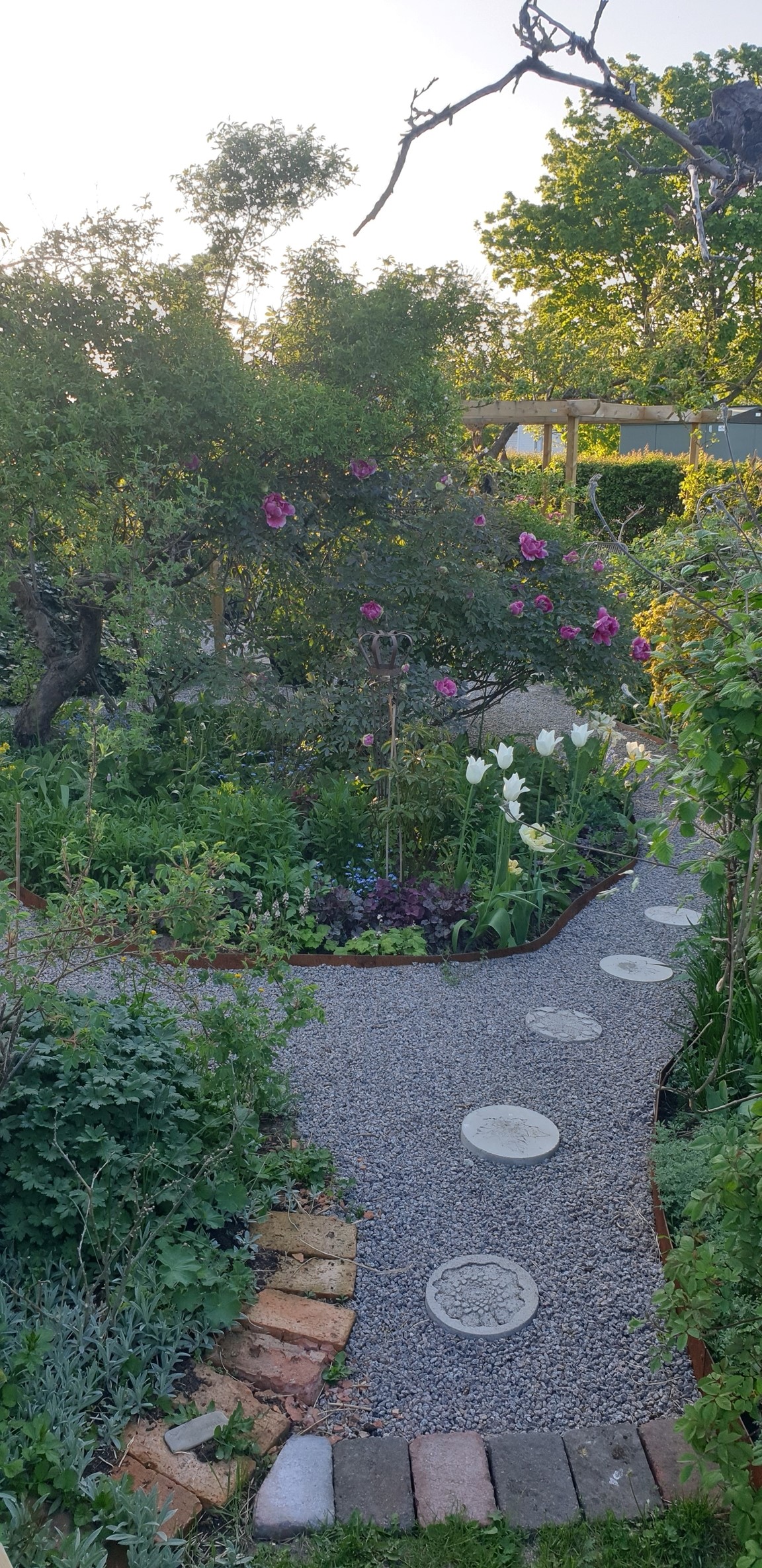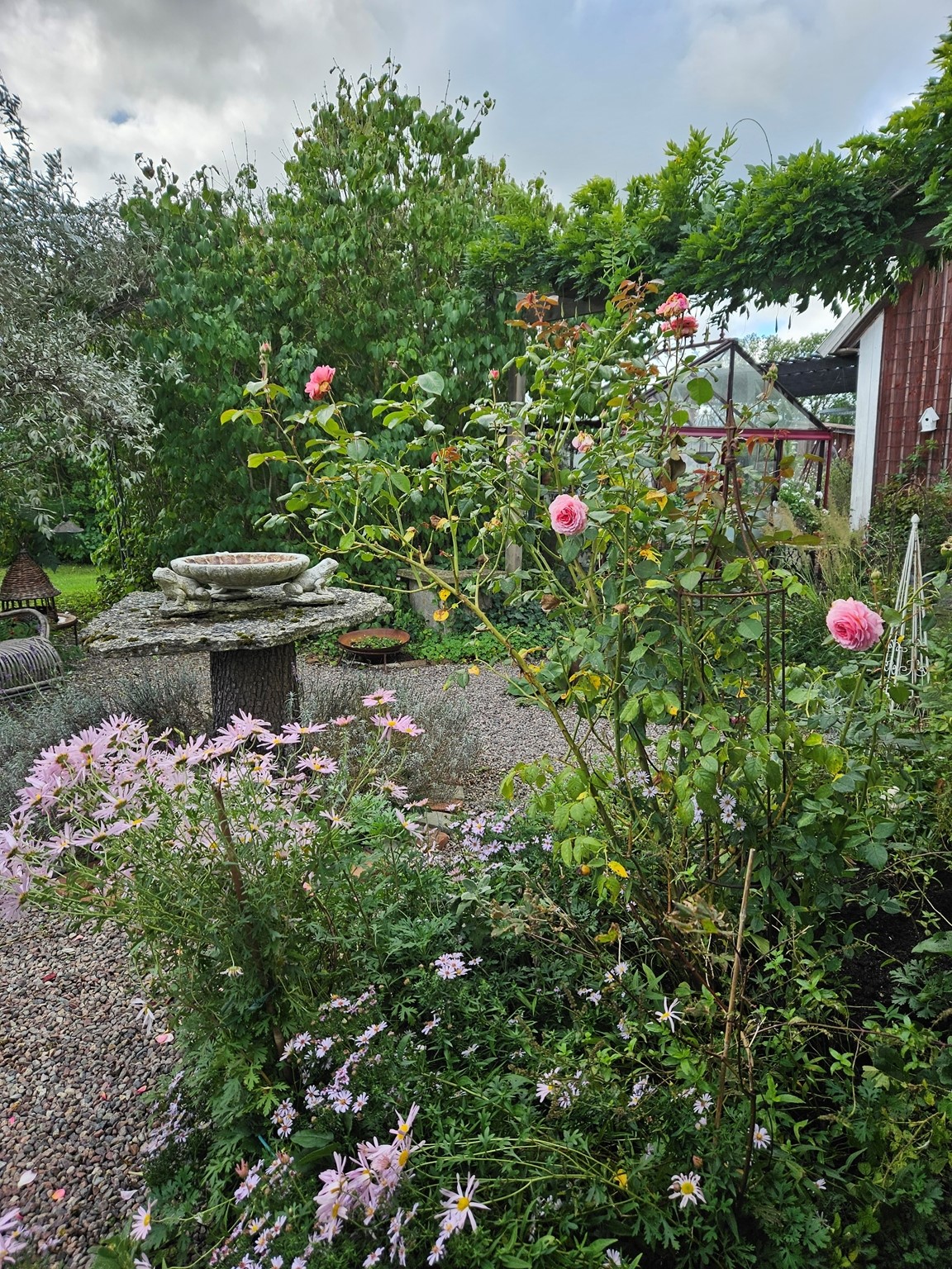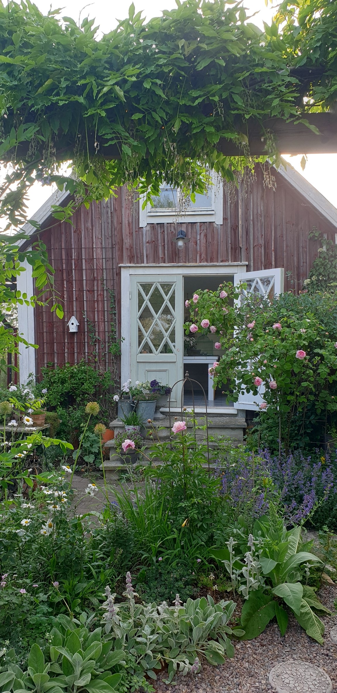 Kringbyggd ölandsgård med lantlig atmosfär. Jag har jobbat med att få en lummig och ombonad känsla med många olika trädgårdsrum. Gångar, häckar och rosenportaler leder dig runt i trädgården. Många rosor och gammeldags växter som trivs i den sandiga jorden här på Ölands östra sida . Växthus med pelargoner, gårdsgrus och en liten damm. Jag gillar den lantliga och lite romantiska stilen och tycker om stilleben med rost och zink som får möta de lite rufsiga rabatterna med rosor och lavendel.