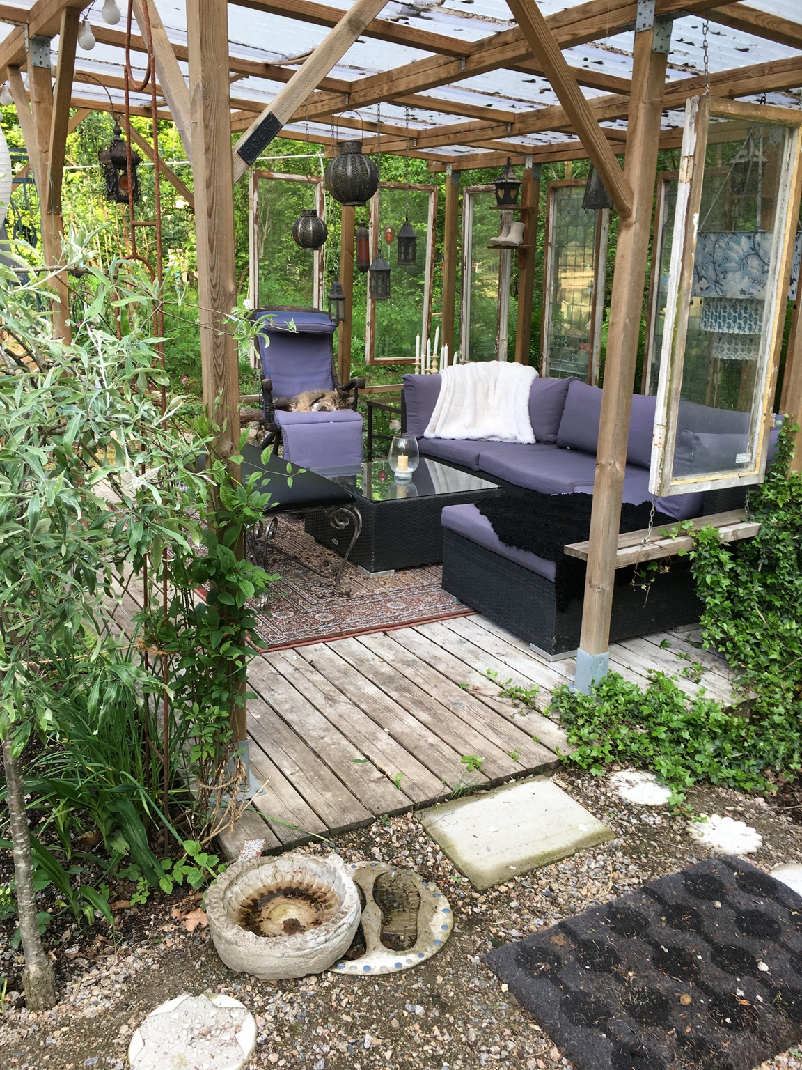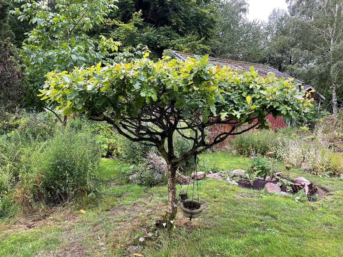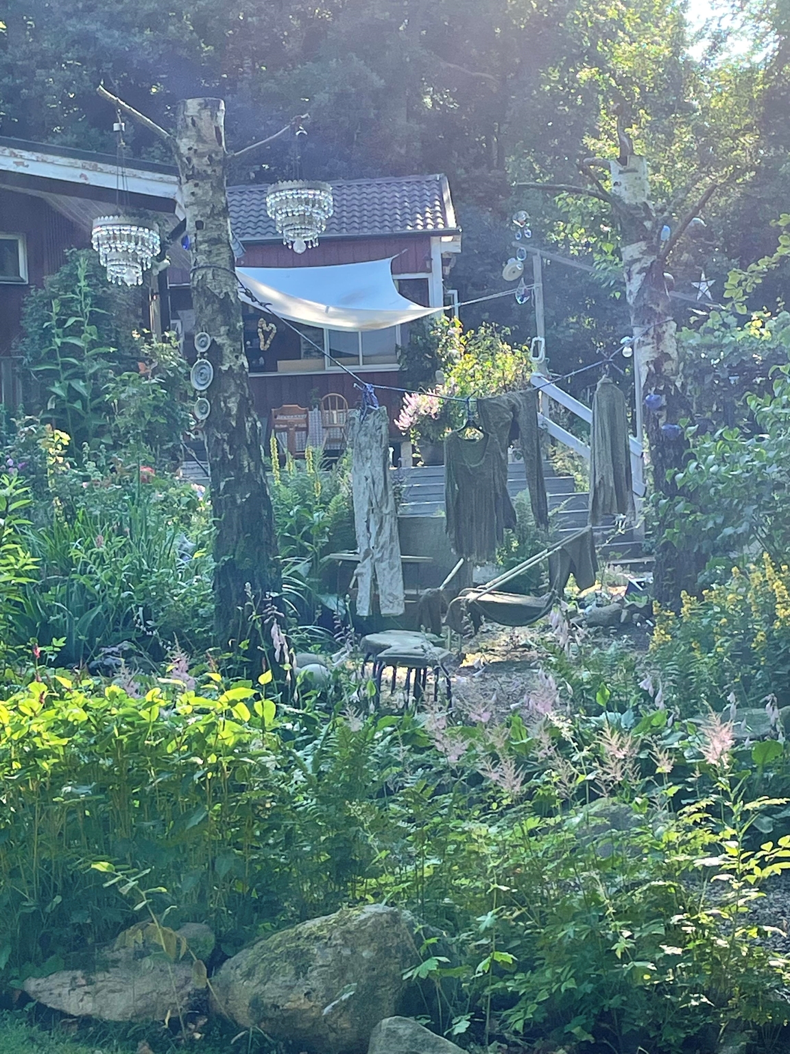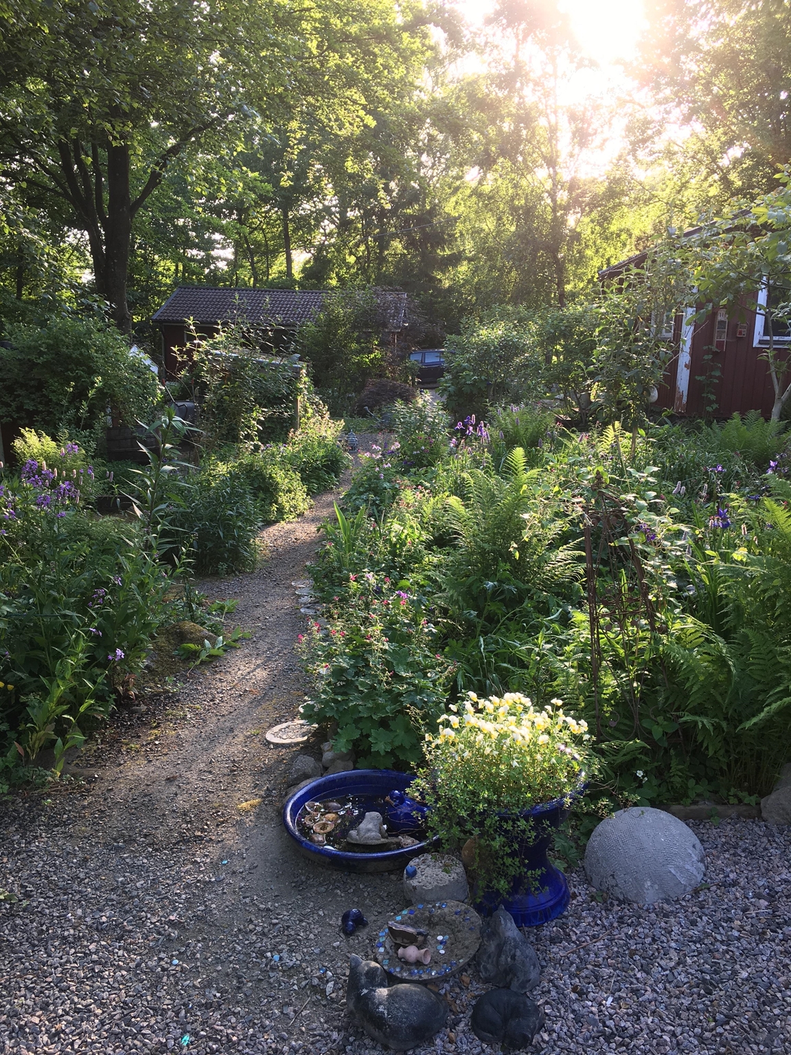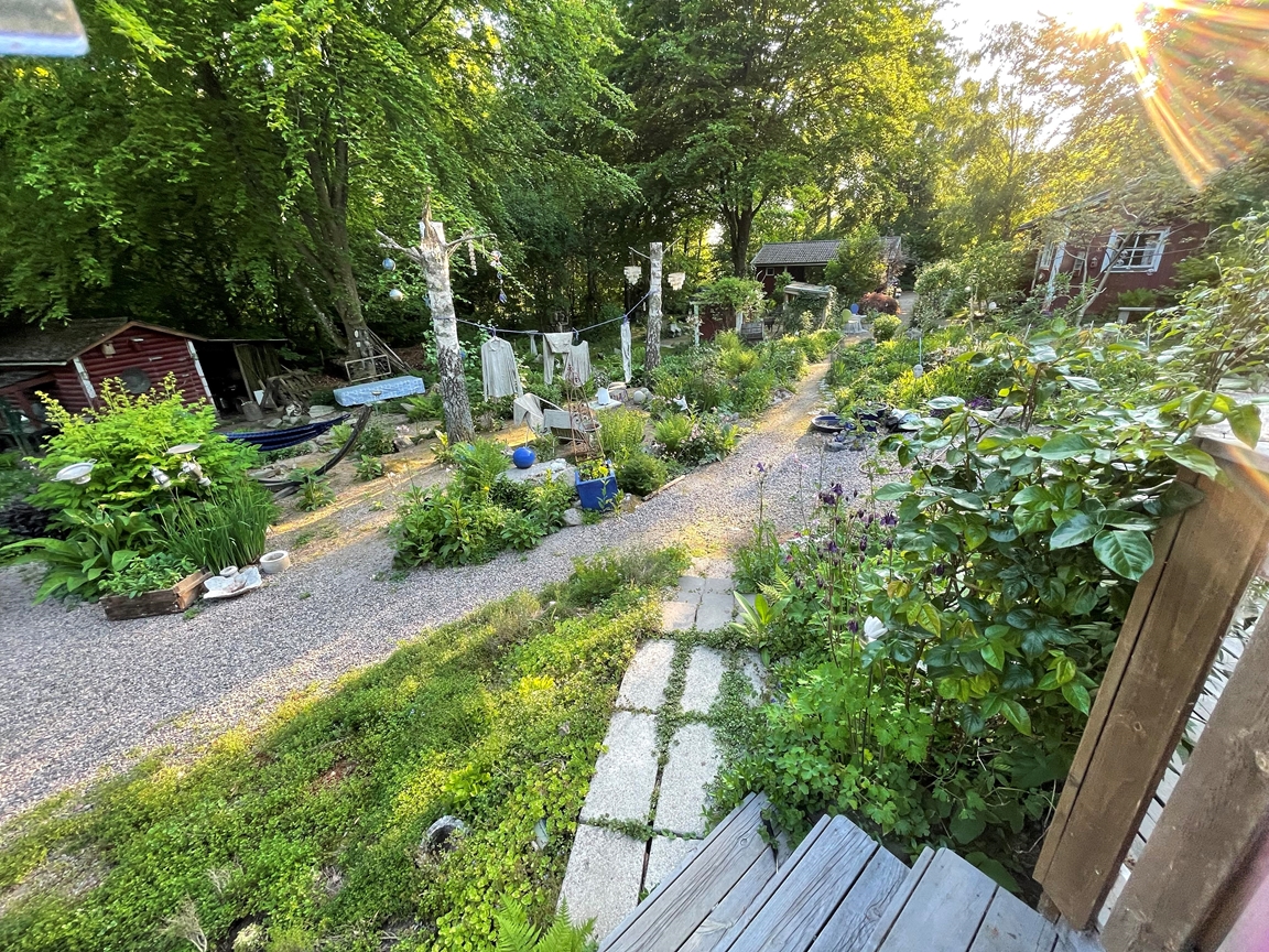 2010 köpte jag mitt drömhus utanför Höör. Nästan 4000 kvm naturtomt. Sedan dess har jag anlagt rabatter och grusgångar, grävt damm och planterat buskar. Allt är gjort med spade, spett och skottkärra för hand av mig. Bl.a. har jag kört ut mer än 50 ton bergkross och gjutit åtskilliga betongplattor och annat i betong. Jag försöker samarbeta med naturen. Biologisk mångfald, lite vilt och lite rufsigt. Ogräs på sina ställen. Inga raka linjer. Det kan aldrig bli för många blommor. En del blommor har en tendens att "rymma" från rabatterna, men det är ok. Trädgården blommar från tidigt till sent på säsongen. Hönor och katter spankulerar fritt. Betongkonst och grusgångar med timjan. Porlande vatten. Bin, humlor och fjärilar trivs här. Olika ”rum” med sittplatser för vila och kontemplation eller bara en fika. Mycket att upptäcka och titta på för barn. Sandlåda, rutchkana och gungor där barnen kan leka. Nära till badplats med möjlighet att låna kanot och flytväst.