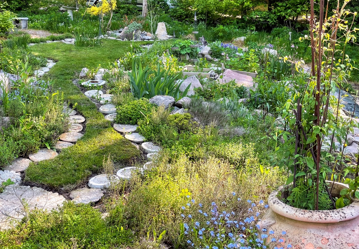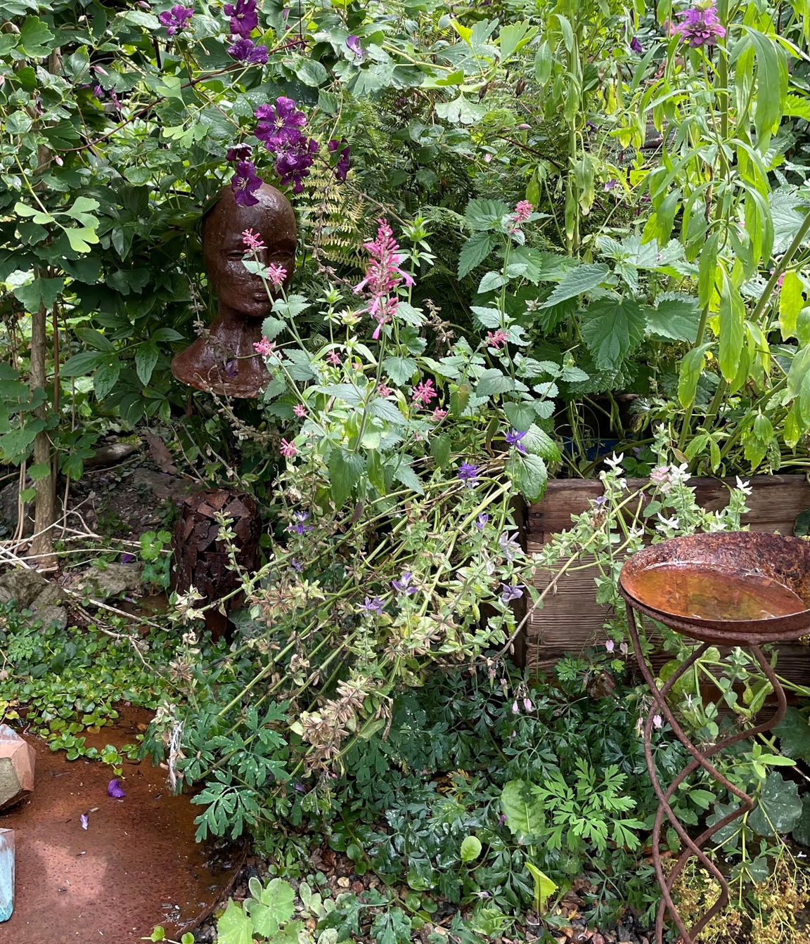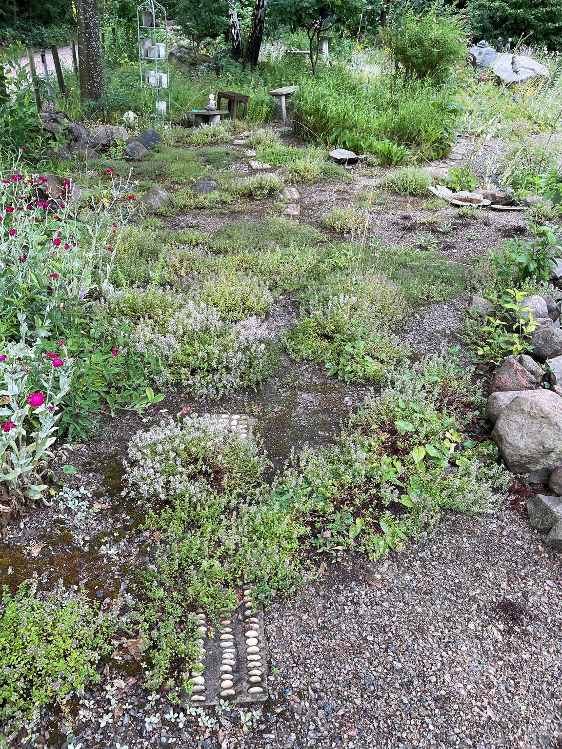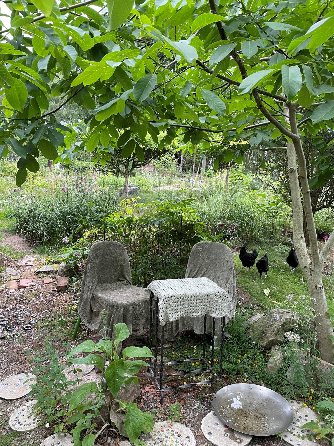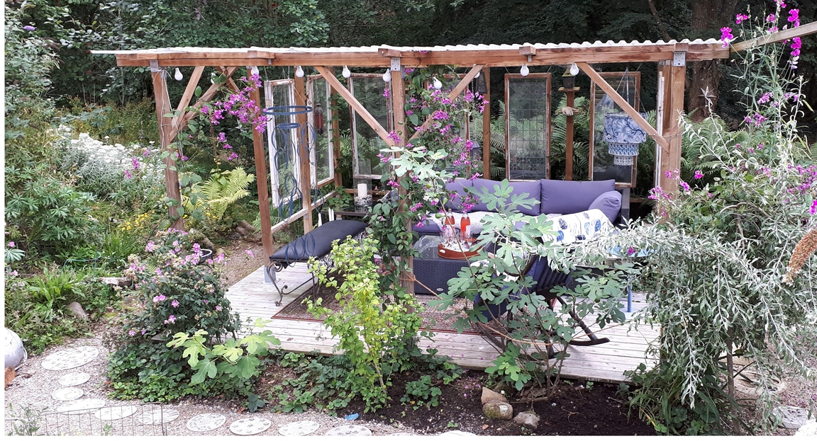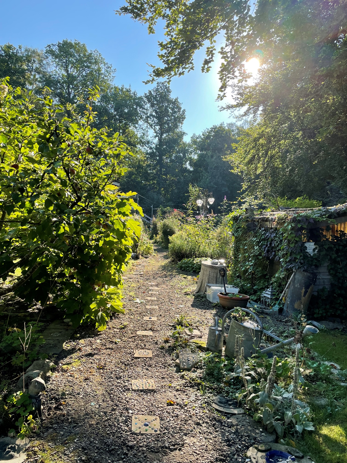 2010 köpte jag mitt drömhus utanför Höör. Nästan 4000 kvm naturtomt. Sedan dess har jag anlagt rabatter och grusgångar, grävt damm och planterat buskar. Allt är gjort med spade, spett och skottkärra för hand av mig. Bl.a. har jag kört ut mer än 50 ton bergkross och gjutit åtskilliga betongplattor och annat i betong. Jag försöker samarbeta med naturen. Biologisk mångfald, lite vilt och lite rufsigt. Ogräs på sina ställen. Inga raka linjer. Det kan aldrig bli för många blommor. En del blommor har en tendens att "rymma" från rabatterna, men det är ok. Trädgården blommar från tidigt till sent på säsongen. Hönor och katter spankulerar fritt. Betongkonst och grusgångar med timjan. Porlande vatten. Bin, humlor och fjärilar trivs här. Olika ”rum” med sittplatser för vila och kontemplation eller bara en fika. Mycket att upptäcka och titta på för barn. Sandlåda, rutchkana och gungor där barnen kan leka. Nära till badplats med möjlighet att låna kanot och flytväst.