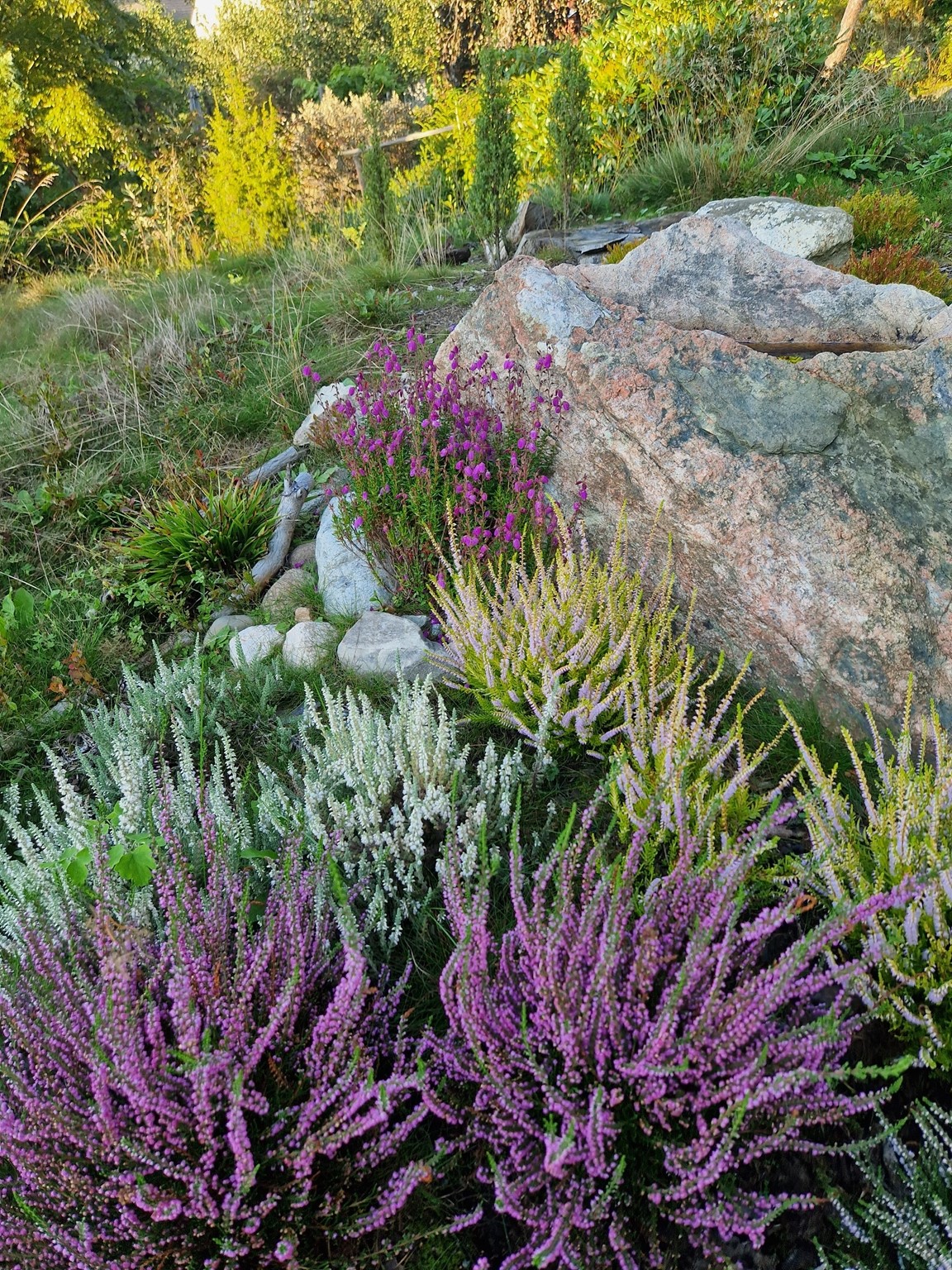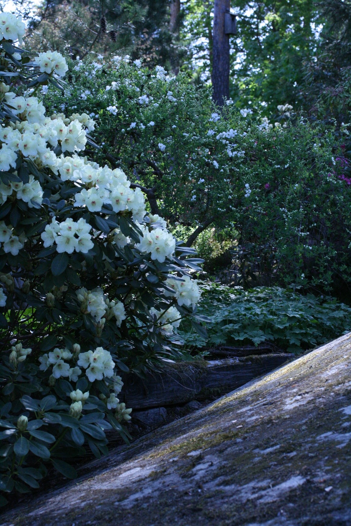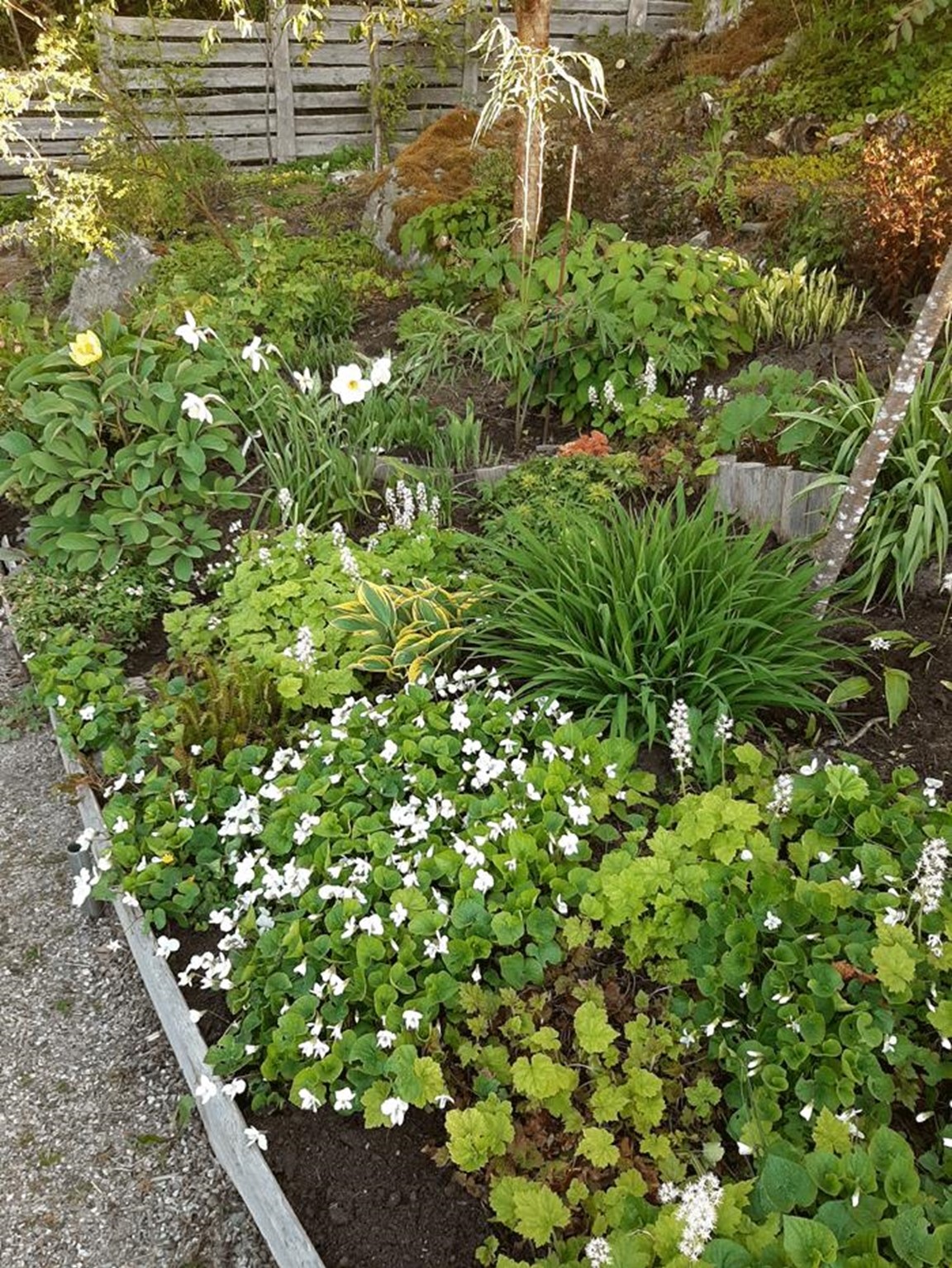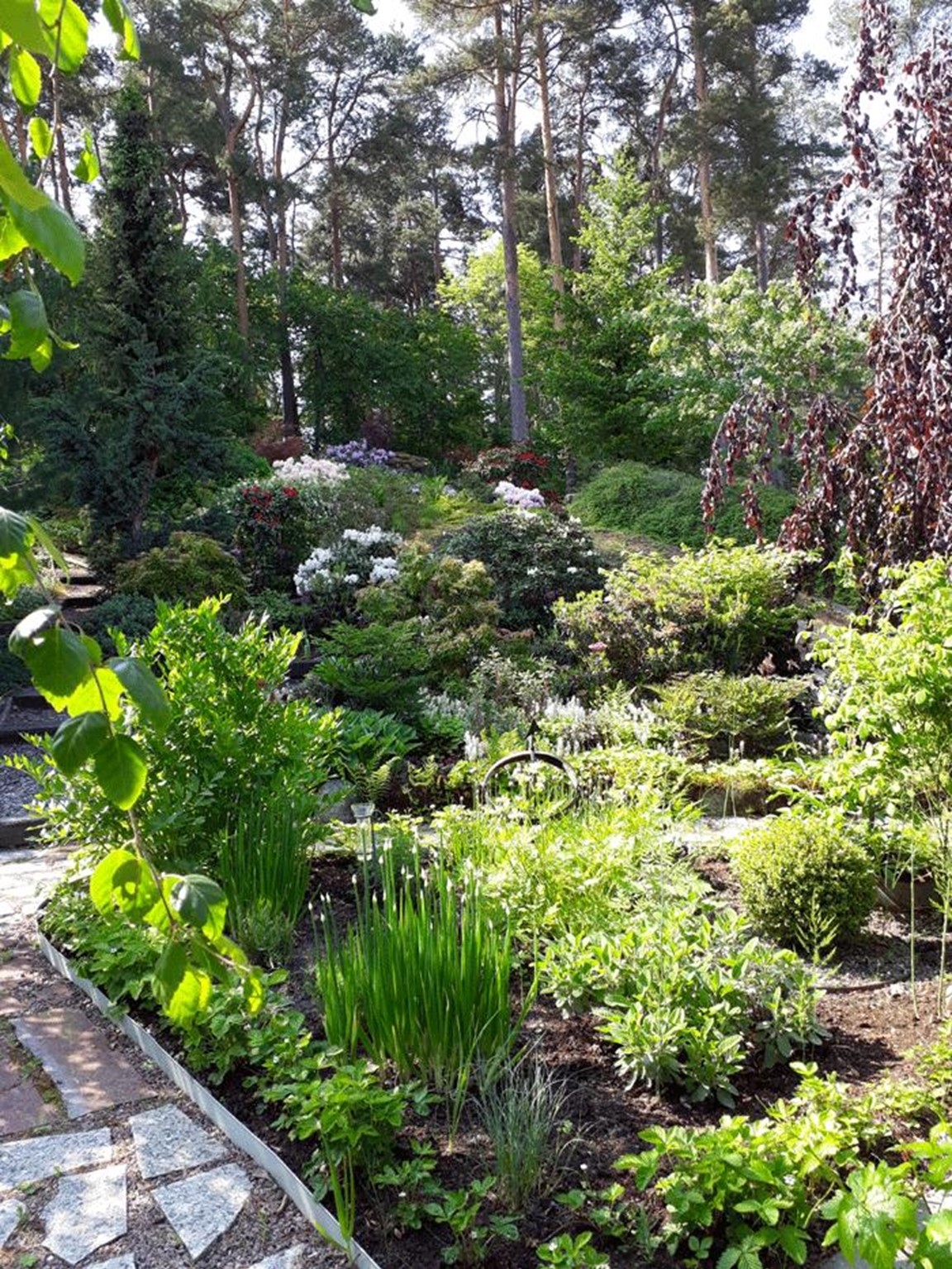Trädgården består av två delar varav den största delen är en skogsbacke med vintergröna surjordsväxter som rododendron, barrväxter, ljung, kalmia, häxal,zenobia och kalmia, på tomten finns det gott om vilda blåbär men även den odlade formen. Här vindlar stigar och trappor fram mellan mycket stenar och stenblock