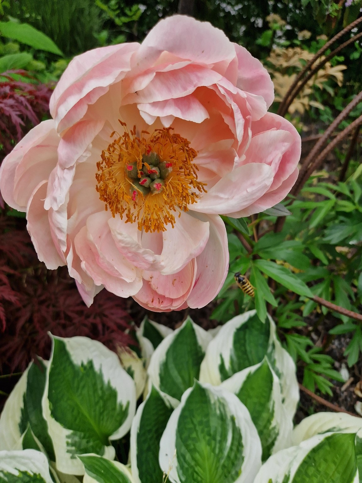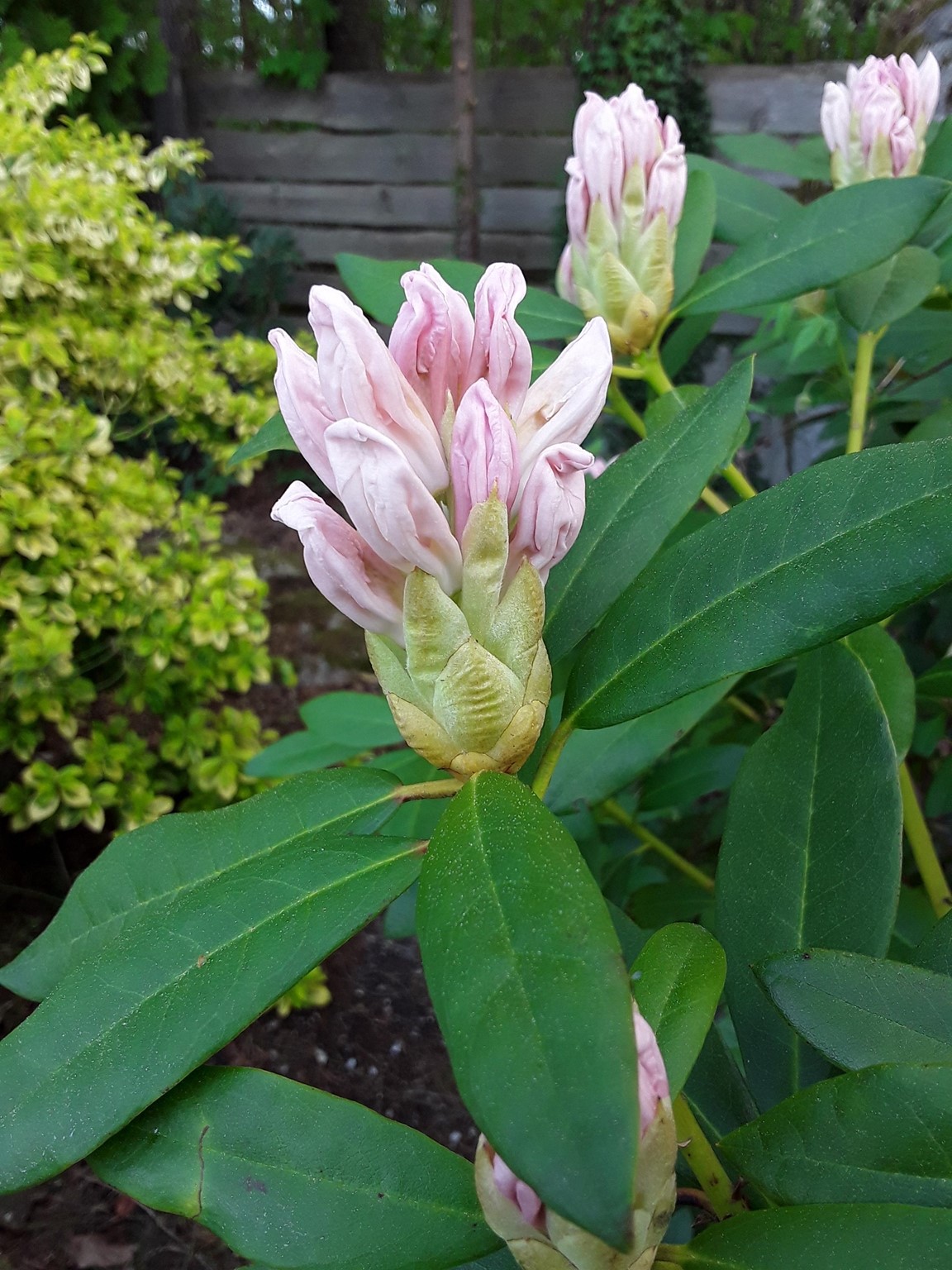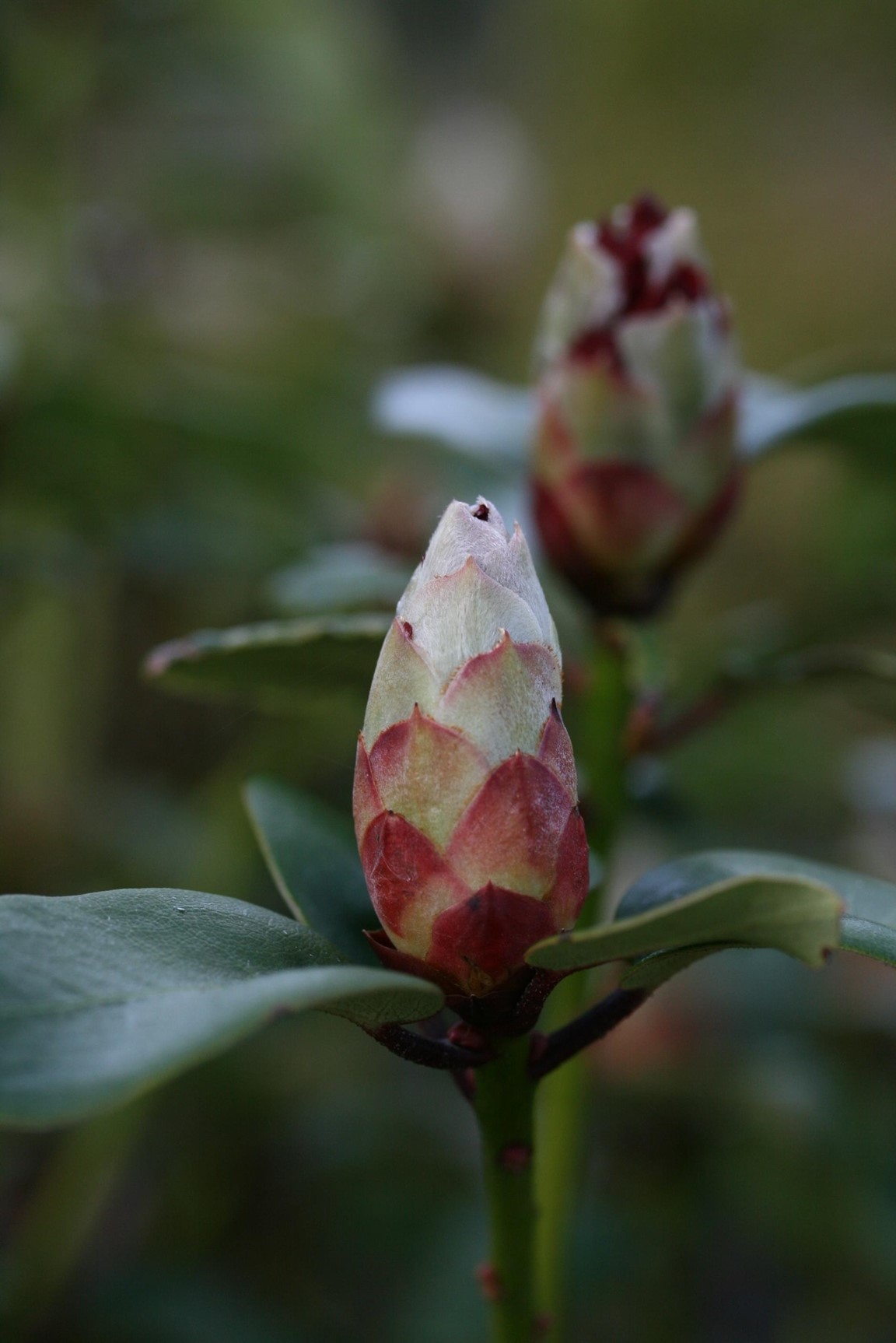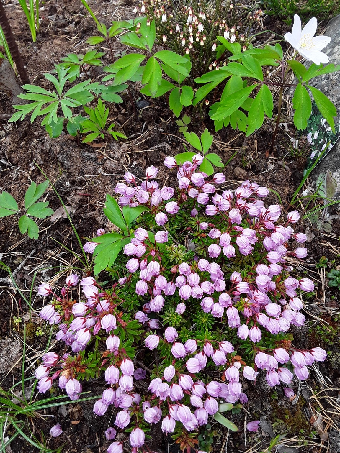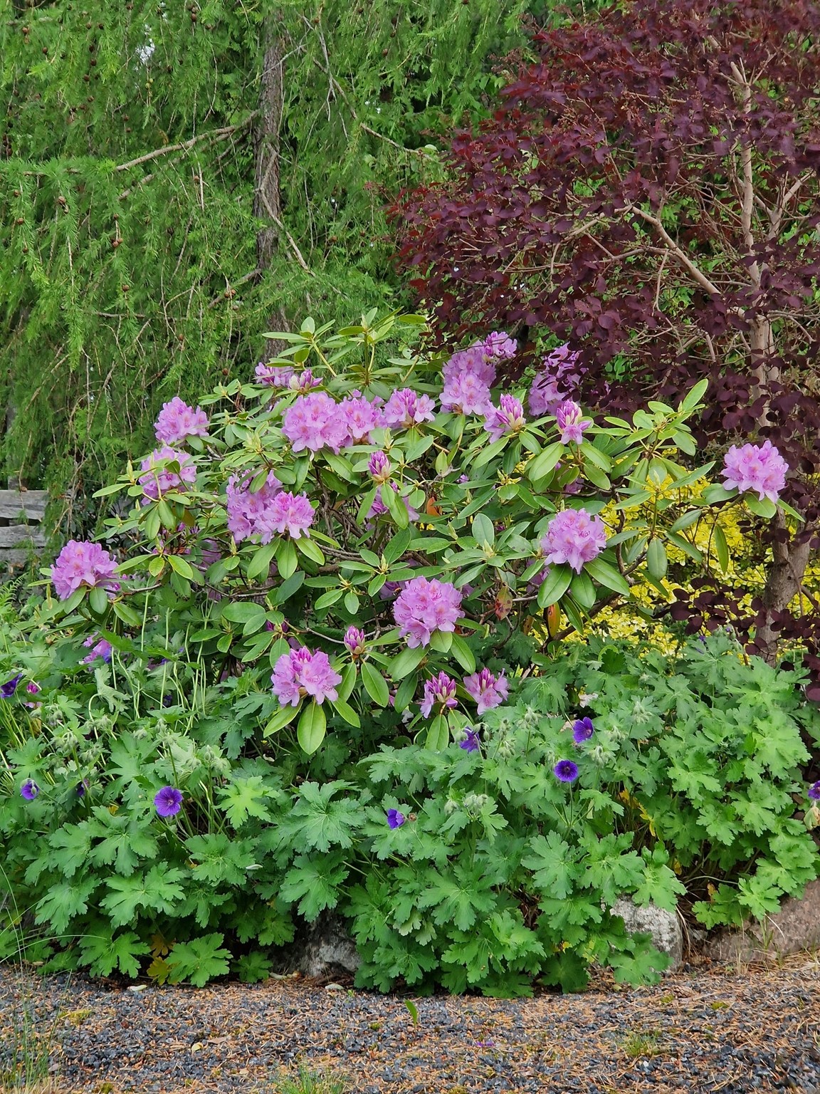 Trädgården består av två delar varav den största delen är en skogsbacke med vintergröna surjordsväxter som rododendron, barrväxter, ljung, kalmia, häxal,zenobia och kalmia, på tomten finns det gott om vilda blåbär men även den odlade formen. Här vindlar stigar och trappor fram mellan mycket stenar och stenblock