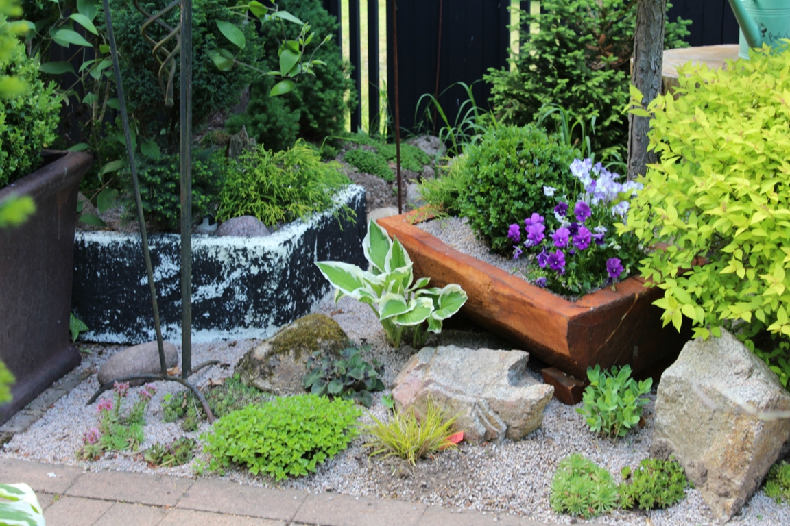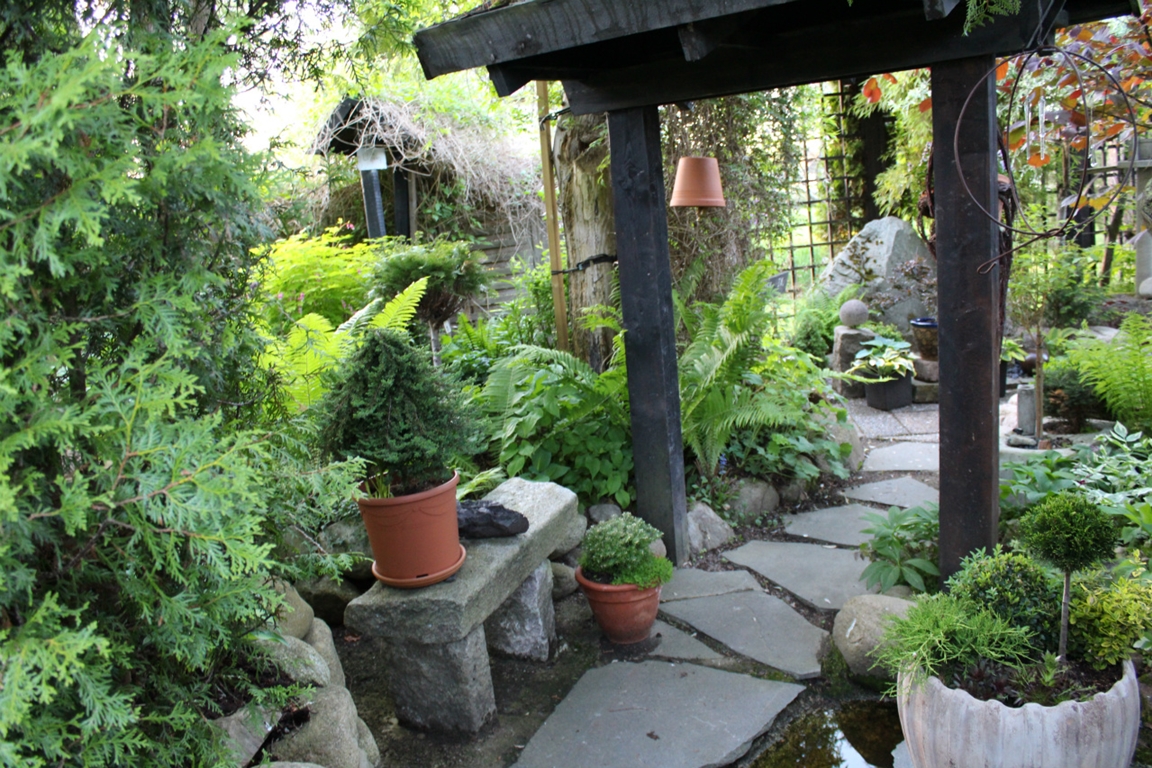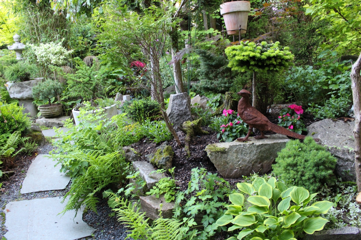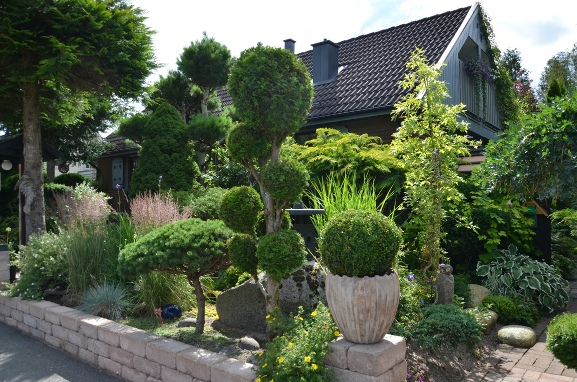 Trädgård på 1000 m2 med dammar, vattenfall och springvatten. Har barrväxter, lövträd, rhododendron, buskar, klematis, perenner och 1-åriga växter.