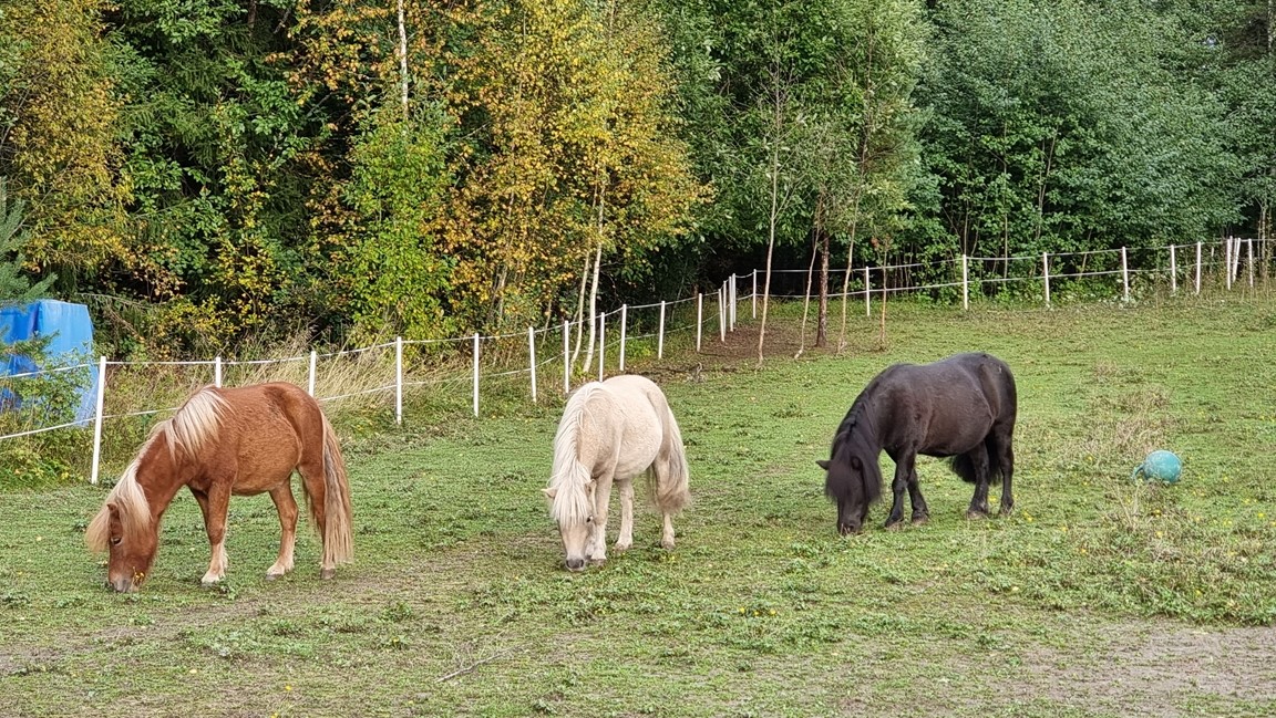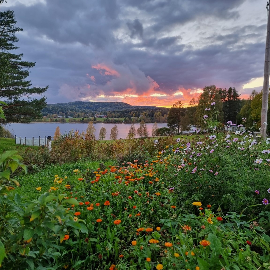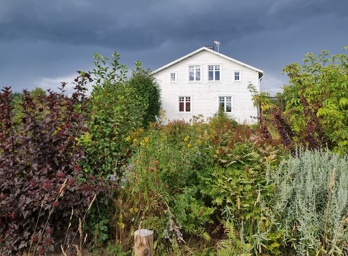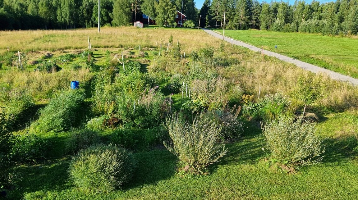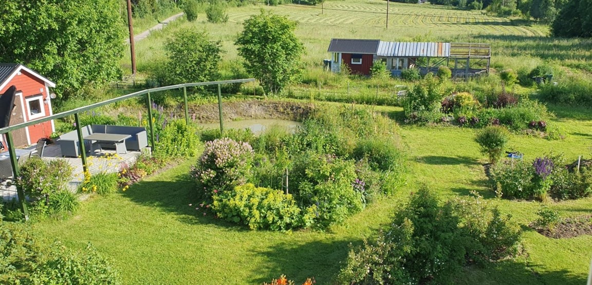 Permakulturinriktad trädgård under uppbyggnad. Fruktträd, bärbuskar, pyrdnadsväxter, damm, höns, hästar mm