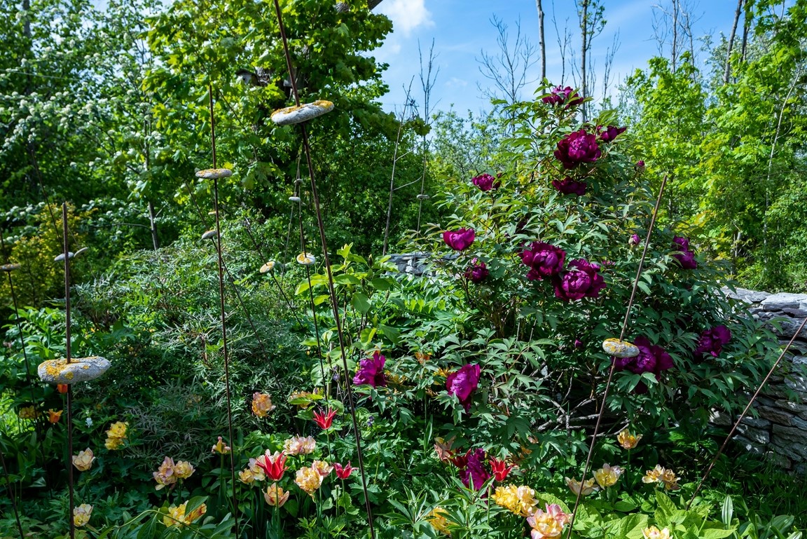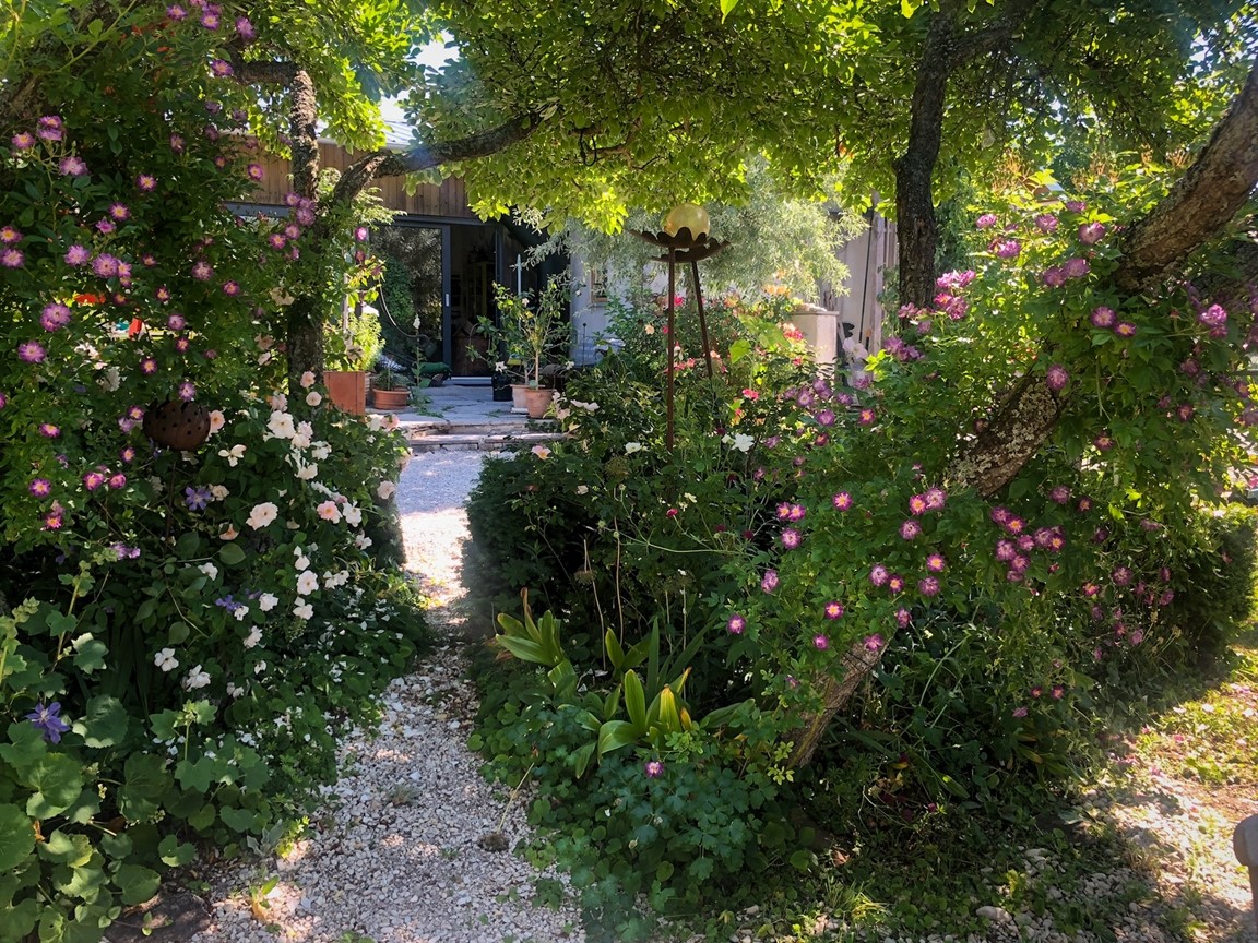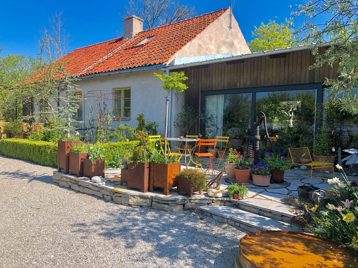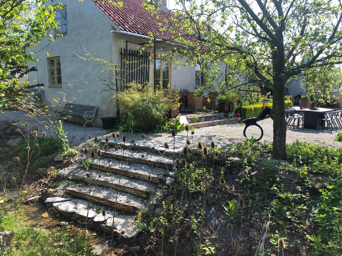 Vi har under 15 år skapat vår trädgård från nära nog ingenting. Den har en framsida med ett stort valnötsträd, en mängd lökväxter, buskpioner, småträd, buskar, clematis. På baksidan finns olika rabatter med pioner, rosor, liljor och andra perenner, flera platser för avkoppling och fika, fikon, blåregn, näsduksträd mm. En annan del av gården har grönsaksodlingar, växthus, fruktspaljéer, hönsgård och bikupor. Det finns ängsmark med spridda exotiska träd såsom tulpanträd, platan, gingko, koranskt biträd, humlebok, äkta kastanj, pagodträd, mullbär. Längs tomten flyter en bäck som medger obegränsad bevattning. Se gärna "Rum Ute" nr 4/23 och "Trädgårdsliv" nr 1/24.