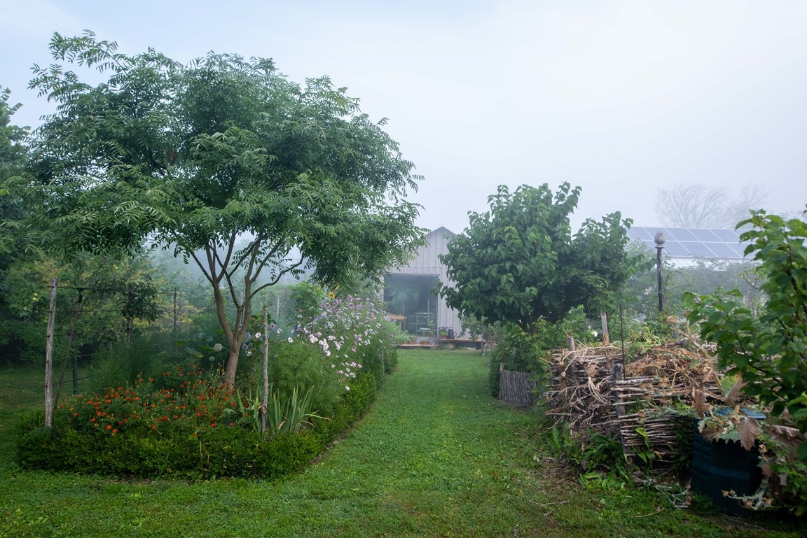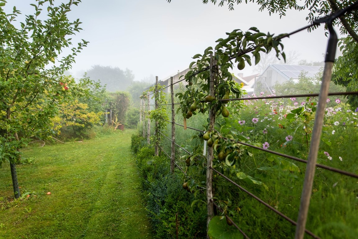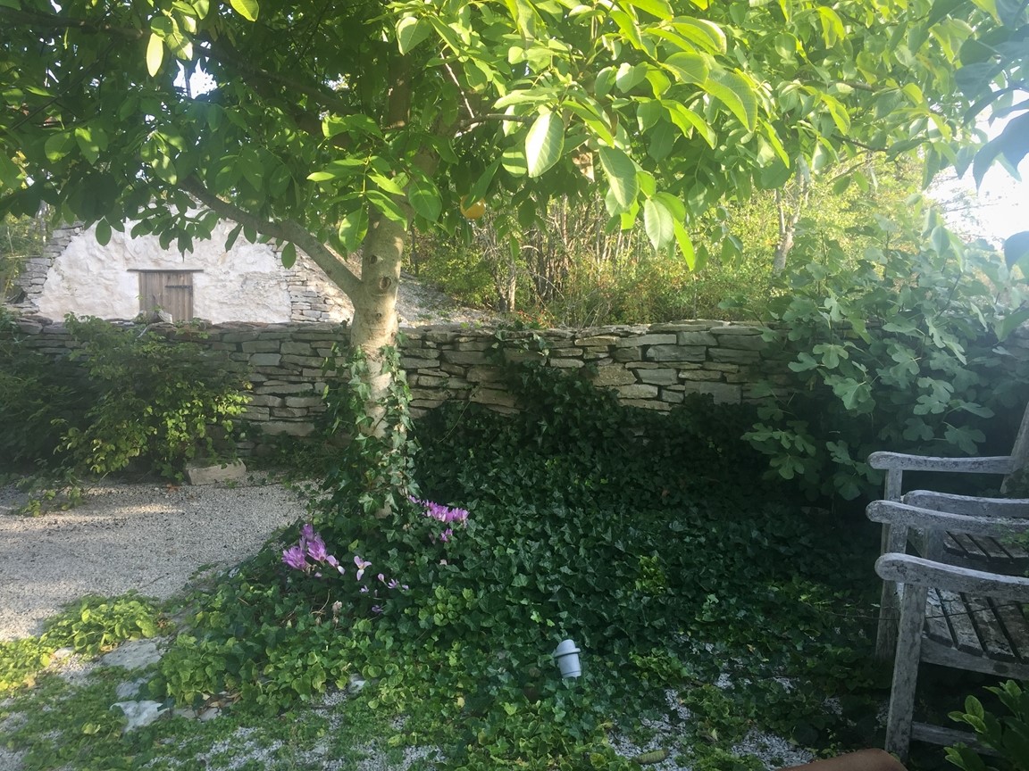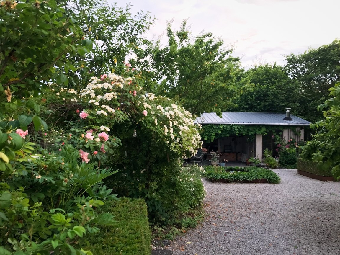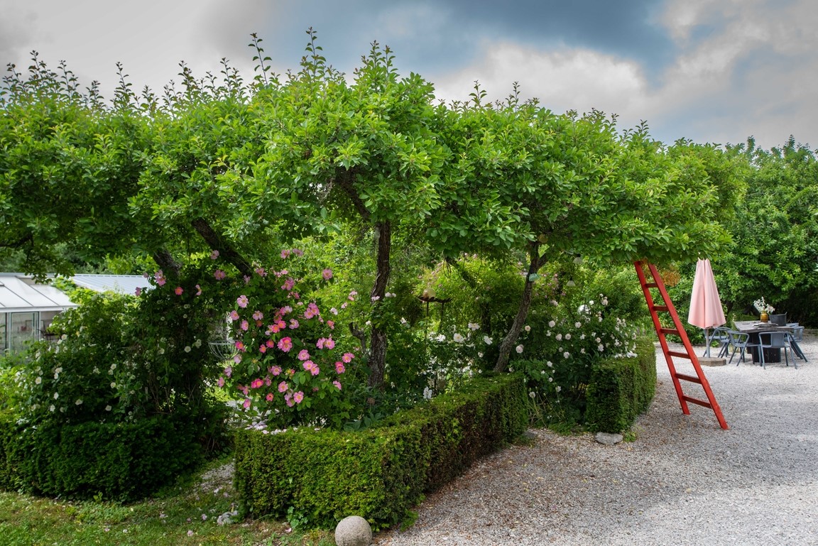 Vi har under 15 år skapat vår trädgård från nära nog ingenting. Den har en framsida med ett stort valnötsträd, en mängd lökväxter, buskpioner, småträd, buskar, clematis. På baksidan finns olika rabatter med pioner, rosor, liljor och andra perenner, flera platser för avkoppling och fika, fikon, blåregn, näsduksträd mm. En annan del av gården har grönsaksodlingar, växthus, fruktspaljéer, hönsgård och bikupor. Det finns ängsmark med spridda exotiska träd såsom tulpanträd, platan, gingko, koranskt biträd, humlebok, äkta kastanj, pagodträd, mullbär. Längs tomten flyter en bäck som medger obegränsad bevattning. Se gärna "Rum Ute" nr 4/23 och "Trädgårdsliv" nr 1/24.