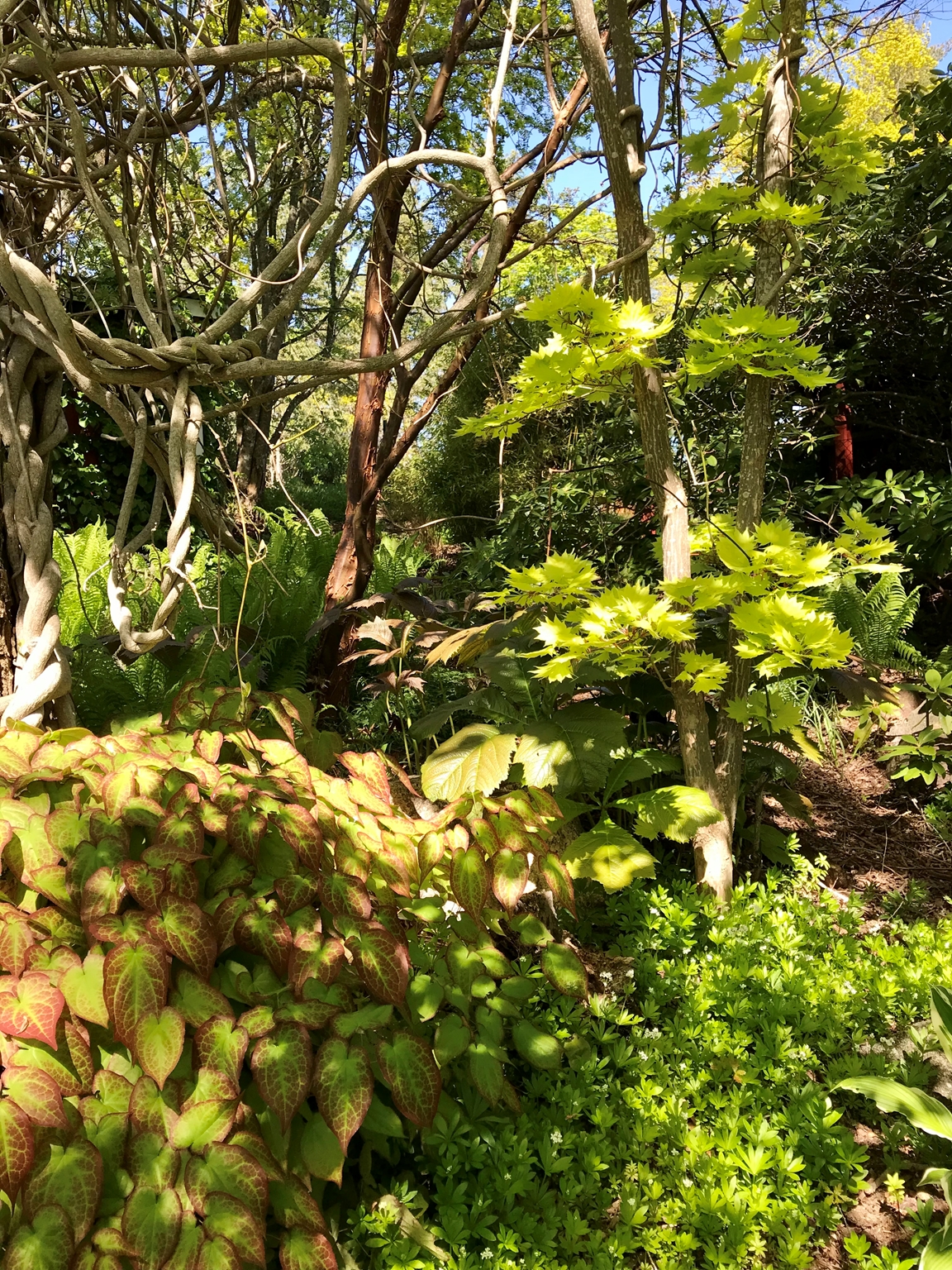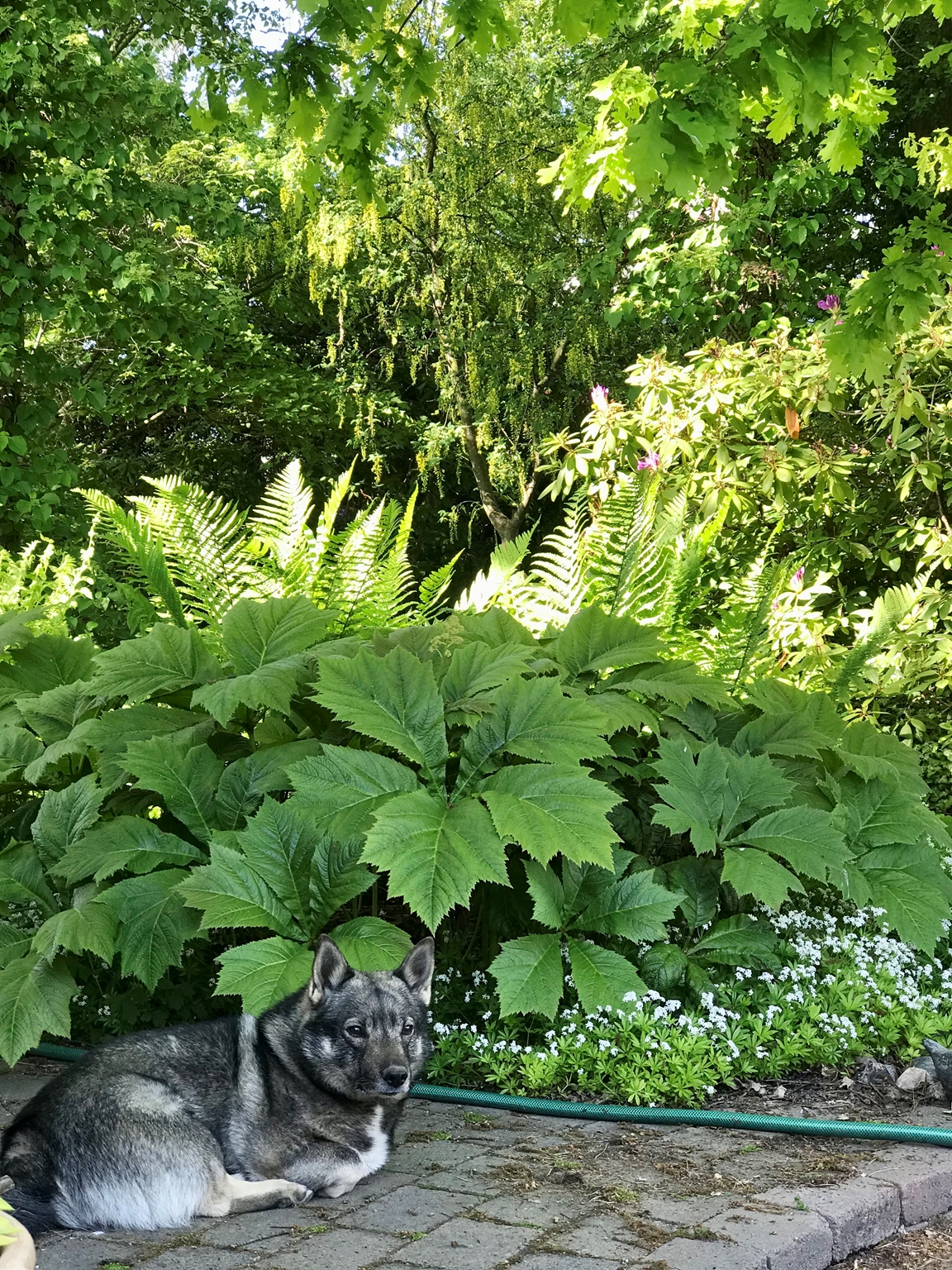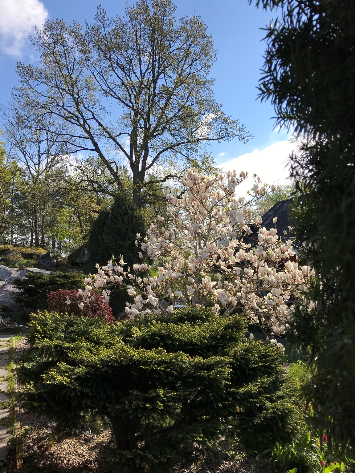 Vår trädgård är anlagd på 2204 kvm i en villaträdgård nära Mälaren. I trädgården finns en äng, berg, liten damm, rosarium, växthus, köksland, fruktträd och woodland. Trädgården har under 40 år varit i ständig förändring. Vår strävan har varit att skapa olika rum av frodig grönska högt och lågt.