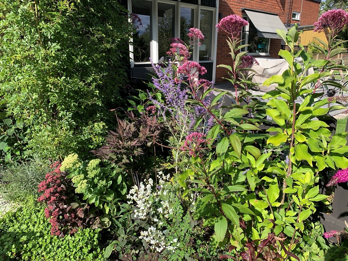 Kedjehusets trädgård på höjden är inte stor, men familjen har skapat en trädgård som trots sin storlek har plats för många funktioner och hela familjens behov. Perennrabatt med favoriter, ett poolområde för bad och umgänge med vänner och barnens kompisar, studsmatta och i skuggträdgården plats för lugn och ro. Finurliga lösningar gör att det finns plats för köksträdgård och fruktträd. I trädgården finns många olika perenner i sol och i skugga. Devisen är mer gott och blandat, än enhetligt och stilrent. I skuggträdgården en nivå ned finns både vanliga och mindre vanliga växter.