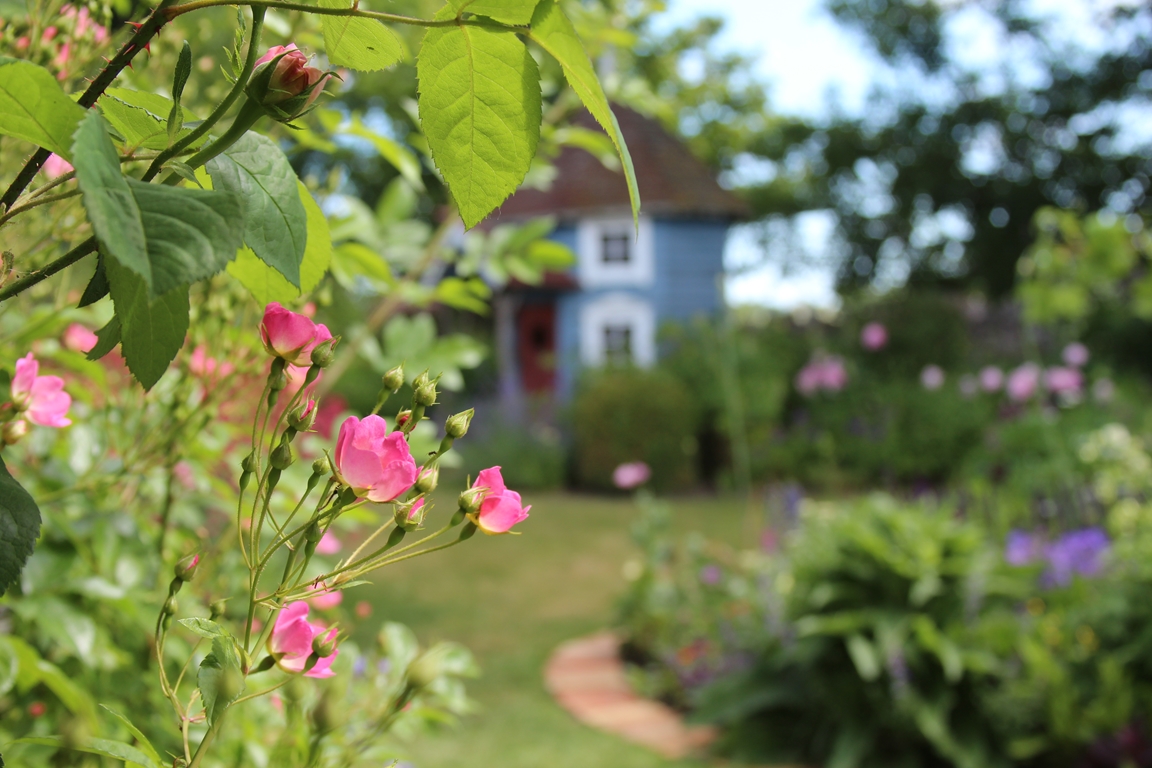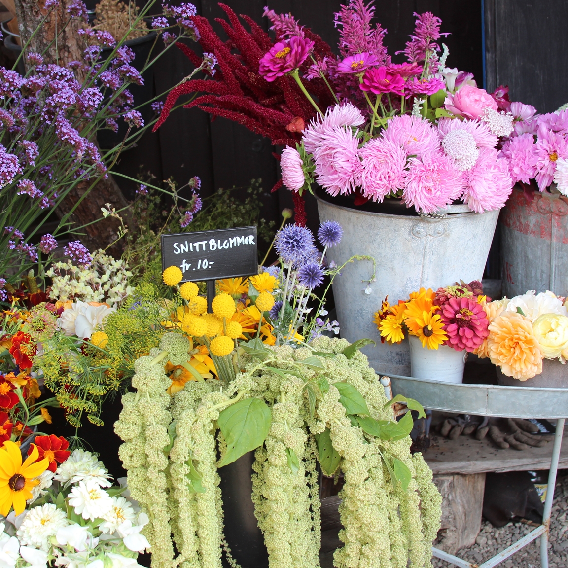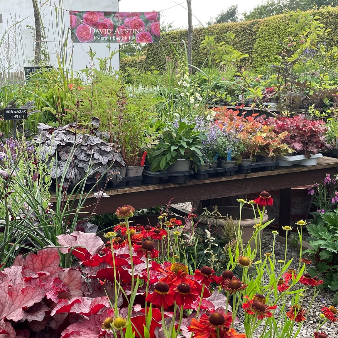 En specialitet är engelska Austinrosor som vi dels har planterat många olika sorter av i trädgården och dels har till salu i vår plantshop. I den och butiken hittar du även spännande och ovanliga perenner och inomhusväxter, vackra krukor och roliga prylar.