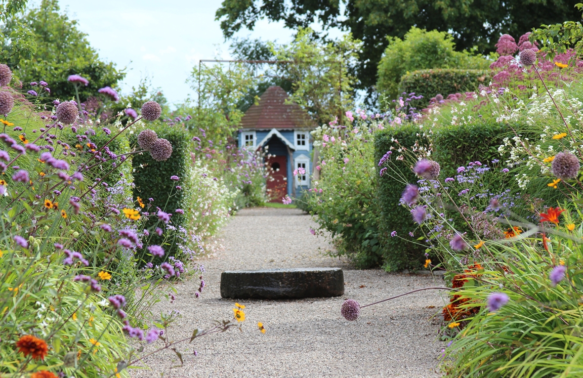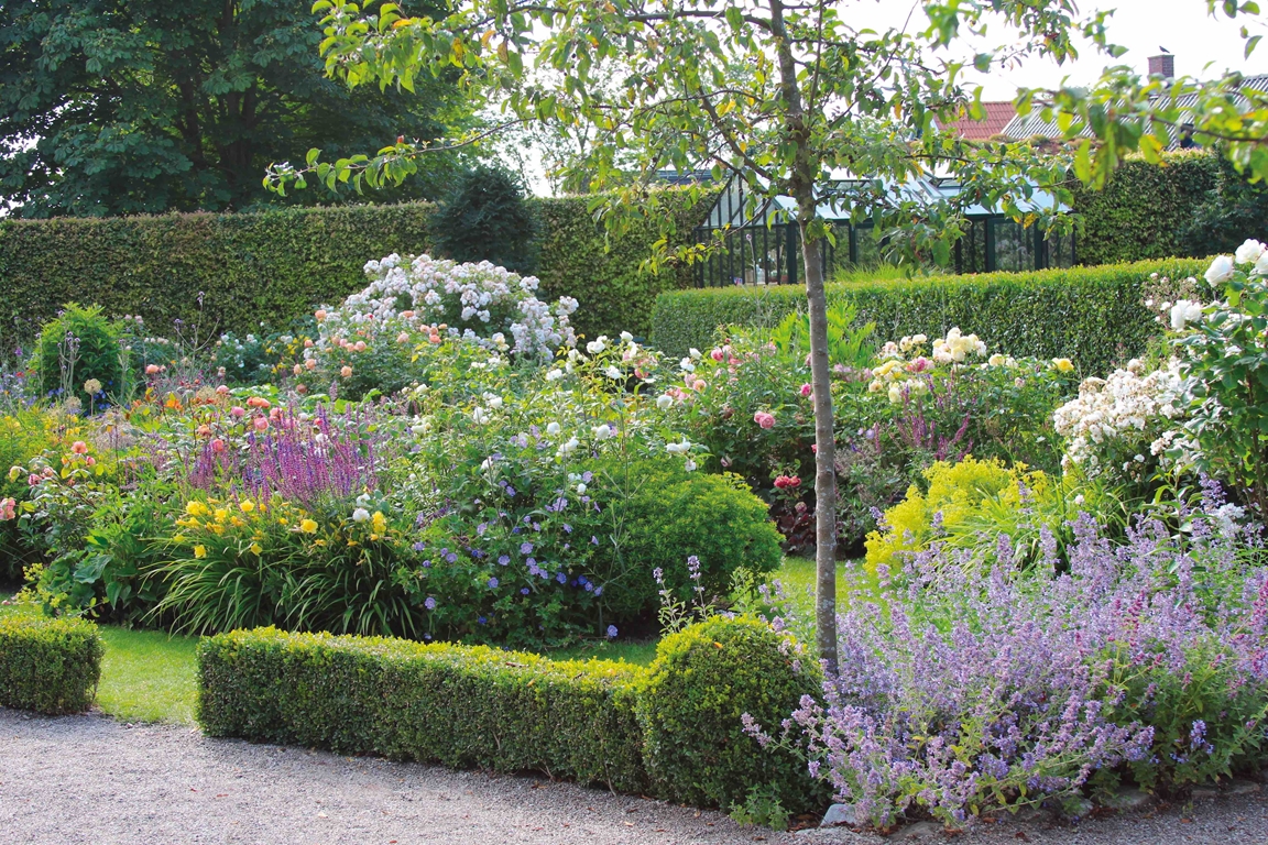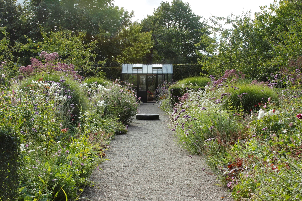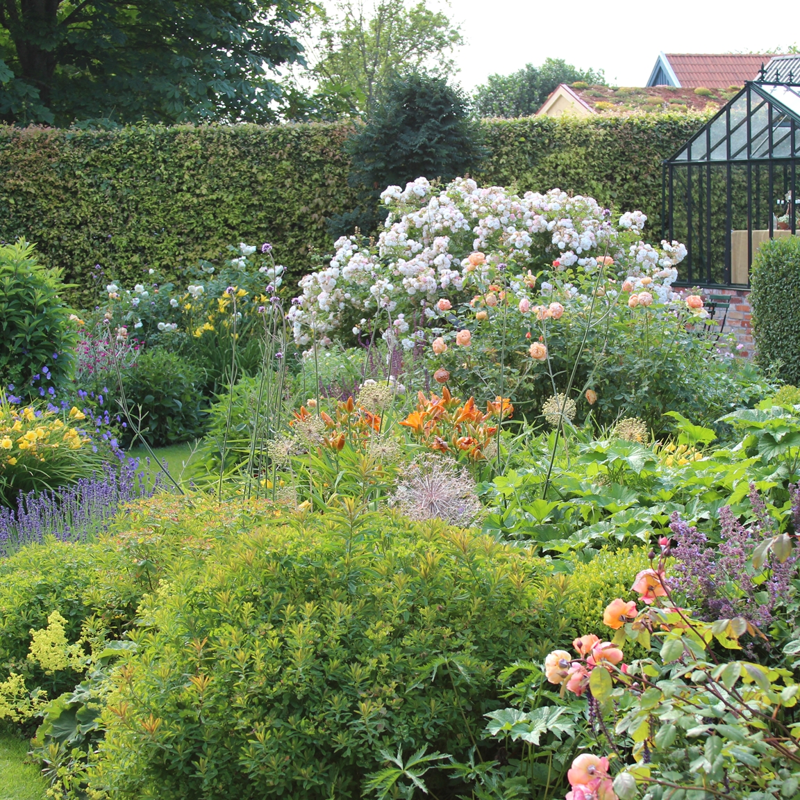 Trädgården är på ca 3000 kvm och är indelad i många olika rum: dubbla perennrabatter, rosenträdgårdar, woodland, ängar, allmogeträdgård, köksträdgård, damm, växthus, lusthus och skugghus.