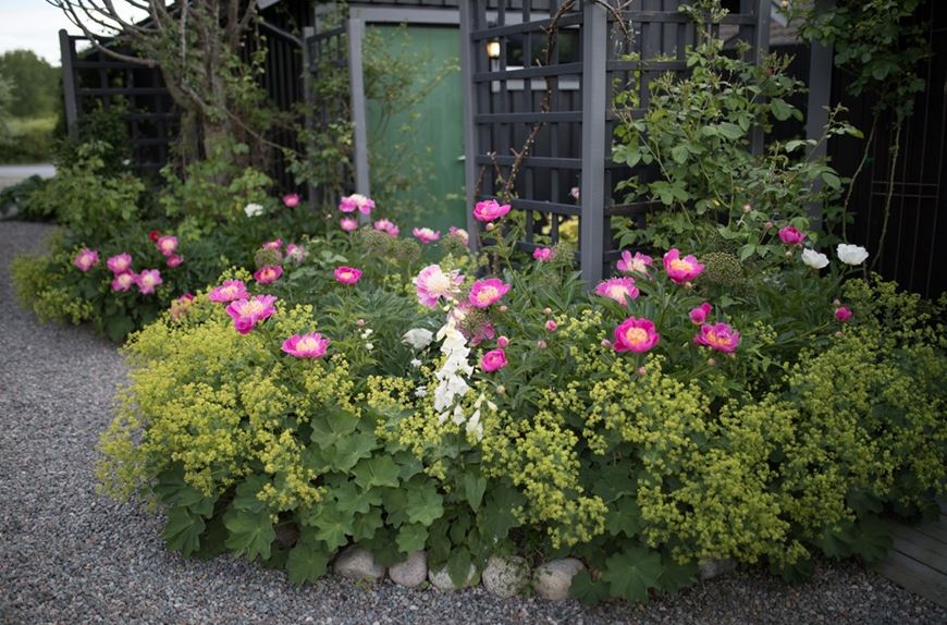 Vidare i trädgården finns rabatter med rosor, perenner och olika lökväxter såsom tulpaner, påskliljor och allium.