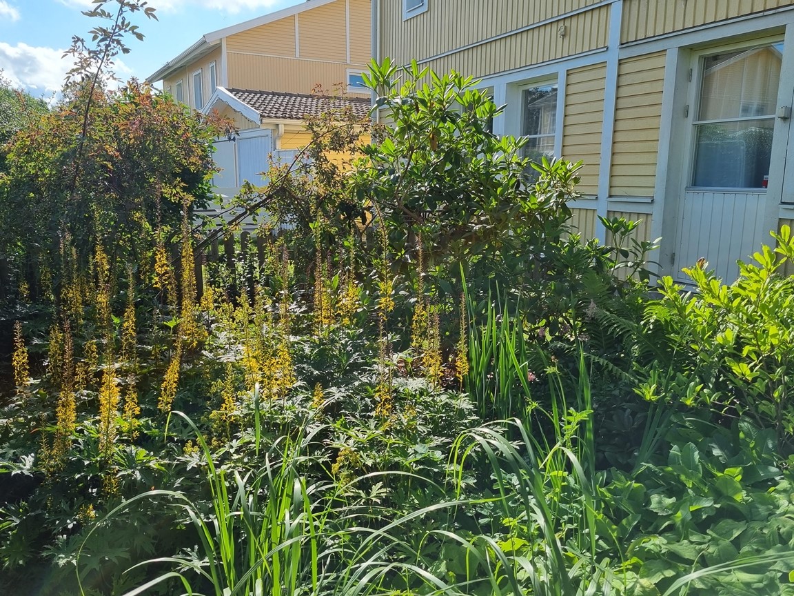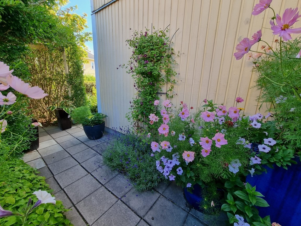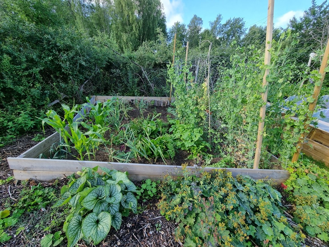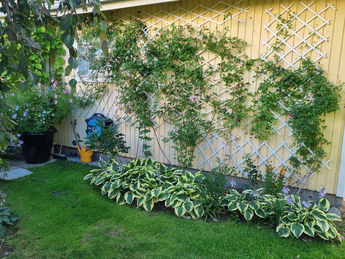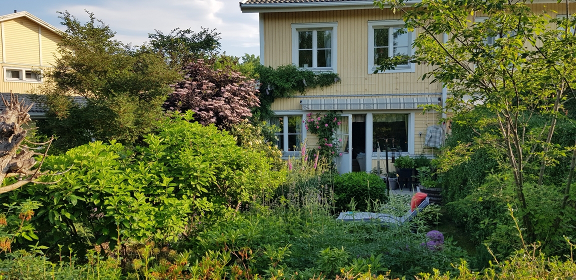 En liten trädgård på ca 300 kvm där det ständigt blir fler växter och skapas nya projekt. Allt med en minimal budget men med stor glädje. Allra färgstarkast är det i tulpantider. Har flera tusen tulpaner som lyser i många färger. Ett del av trädgården har röjts från massa pil och slån under ett par år. . Två grönsaksland har vi byggt. Stor vall av schacktmassor från husets byggande finns kvar. Där har jag planterat mycket bär och en del perenner