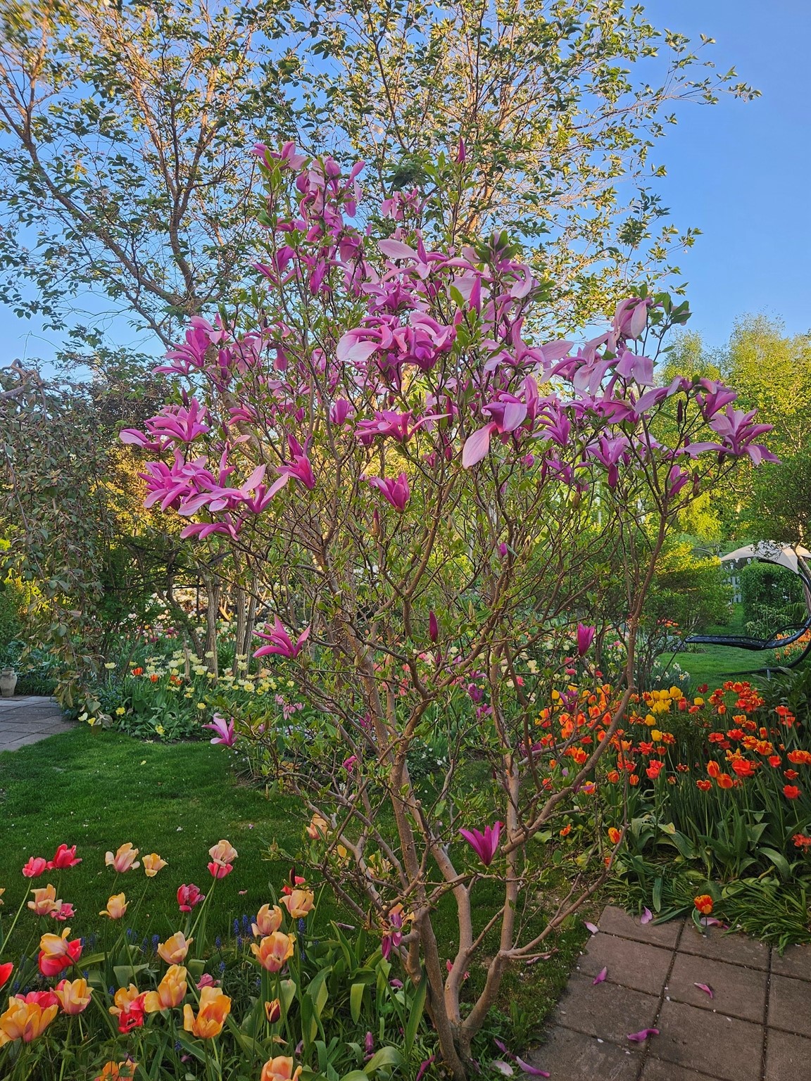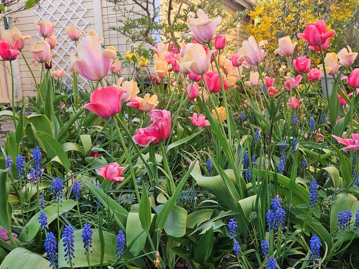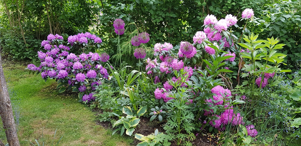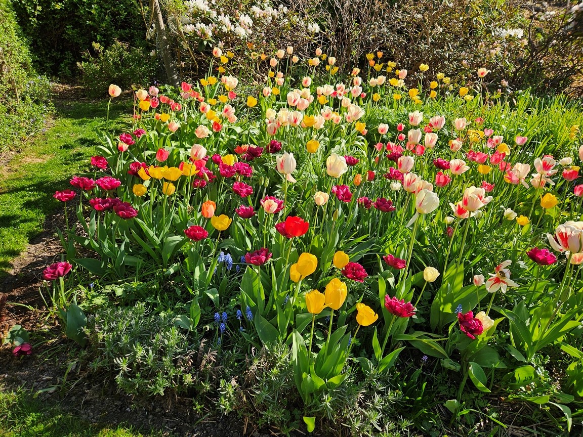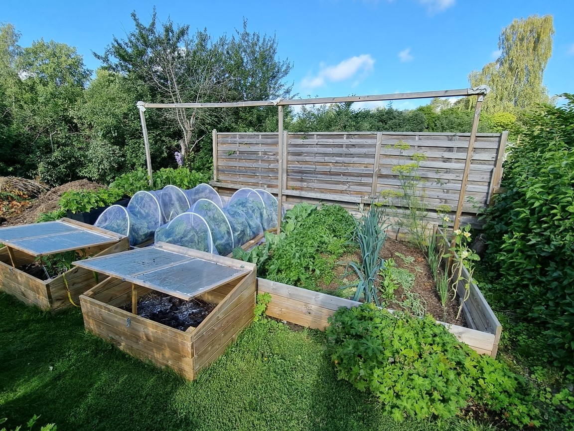 En liten trädgård på ca 300 kvm där det ständigt blir fler växter och skapas nya projekt. Allt med en minimal budget men med stor glädje. Allra färgstarkast är det i tulpantider. Har flera tusen tulpaner som lyser i många färger. Ett del av trädgården har röjts från massa pil och slån under ett par år. . Två grönsaksland har vi byggt. Stor vall av schacktmassor från husets byggande finns kvar. Där har jag planterat mycket bär och en del perenner
