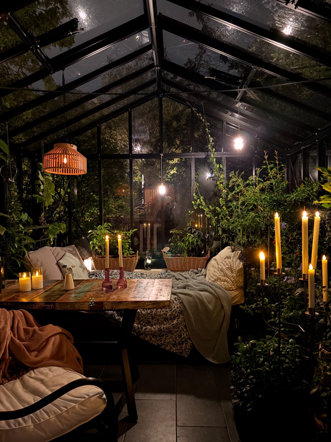 I vår lilla trädgård samsas hela familjen, hunden och fem dvärghönor. Vi odlar för både mage och ögon. Trots trädgårdens storlek finns det plats för alla och det odlas mycket på liten yta, tack vare våra smarta odlingsbyggen i form av upphöjda lådor i olika former och storlekar för både blommor och grönsaker. I trädgården finns även ett stort friväxande fikonträd, ett persikoträd (Riga) på friland som ger mycket frukt, fyra spaljerade äppelträd (Ingrid Marie), aprikos (Kioto), vindruvor, tio sorters blåbär, dvärgkörsbär, pelarplommon (Mirabelle Ruby), äpple med rött fruktkött (Baya Marisa). Det finns dessutom många olika sorters remonterande jordgubbar, lila och gula hallon, örtagård, köksträdgård med bland andra mikrodvärgtomater, dahlior, luktärt, lavendel och mycket annat - inklusive lite ogräs och en välanvänd gräsmatta. Vårt senaste projekt var ett orangeri/växthus fäst mot husfasaden där vi bl.a. har 6 sorters passionsfrukt, 3 sorters granatäpple och en massa anueller. Runt om i trädgården står även ca 19 sorters citrusträd i krukor, t.ex. Yuzu, fingerlime, bergamott, citron, grapefrukt och blodapelsin.