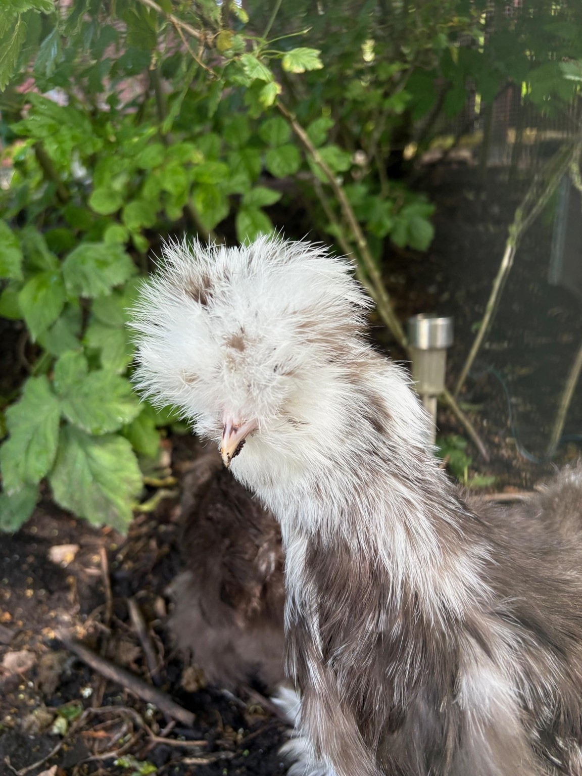 Liten trädgård med specialbyggda odlingsbänkar i olika utformning. Väggfäst orangeri/växthus. Dvärghöns.