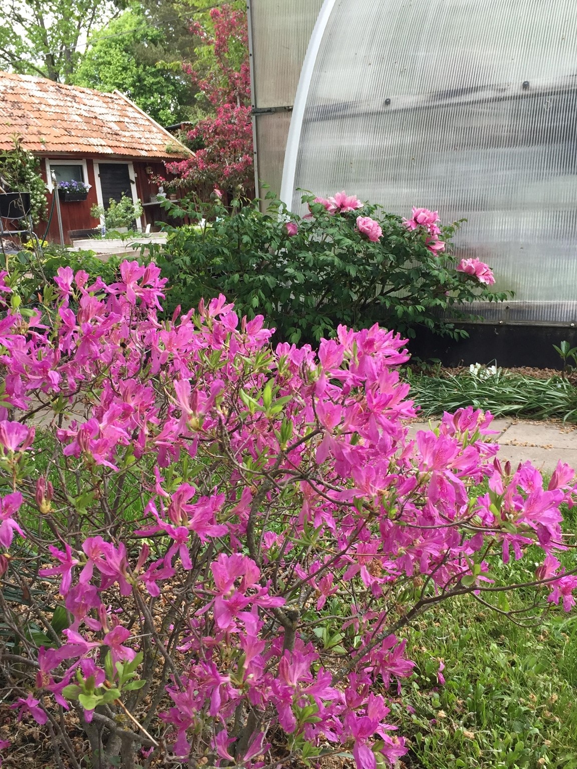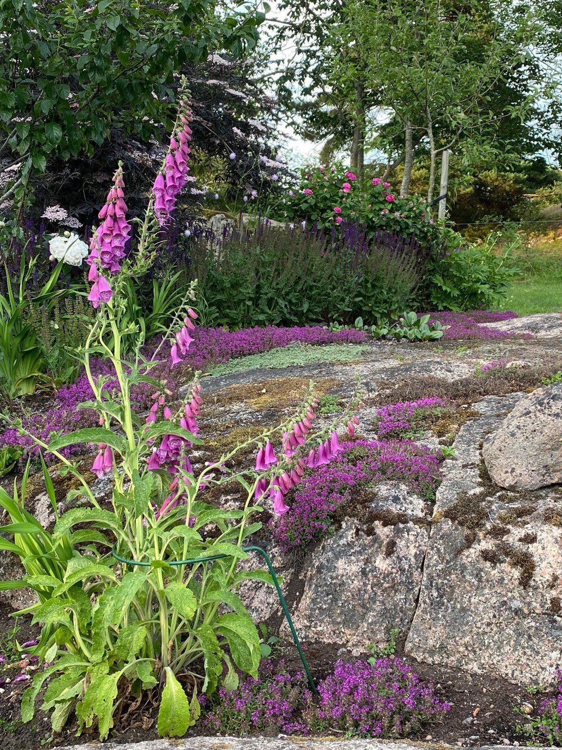 Vår trädgård ligger på landet i gränsen mellan östgötaslätten och smålandsskogen. Runt omkring finns betade ängar med stora ekar. Trädgården är kuperad med berg i dagen och är fortfarande under uppbyggnad. Här låg ett trädgårdsmästeri på 40-50-talet och många av de gamla perennerna finns fortfarande bevarade i rabatterna. Under våra år i trädgården har vi fyllt på med perenner ( bl a många sorters pioner), buskar, häckar och träd. Det finns även en del udda sorter planterade. En del av trädgården använder vi till odling och det finns både vanliga och ovanliga perenner till försäljning.