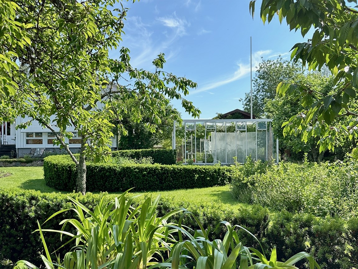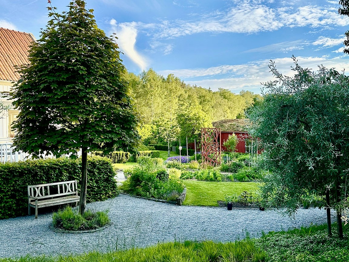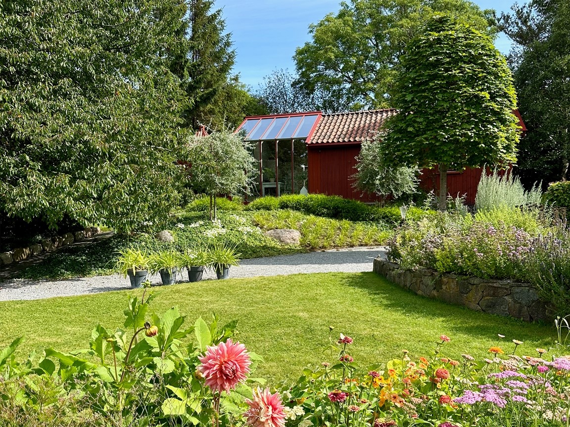 Vi slutar aldrig att fascineras av växtkraften i varje litet frö som blir till så många olika slags goda grönsaker och vackra blommor. Fruktträd, bärbuskar, rosor och perenner samsas med odlingslanden i runda mjuka former. I växthuset odlar vi flera sorters tomater och i det lilla orangeriet driver vi upp plantor på våren och förvarar växter på vintern. Vi odlar ekologiskt och vill att fåglar och insekter ska trivas lika bra i vår trädgård som vi själva gör. En rofylld plats att njuta av och inspireras av.