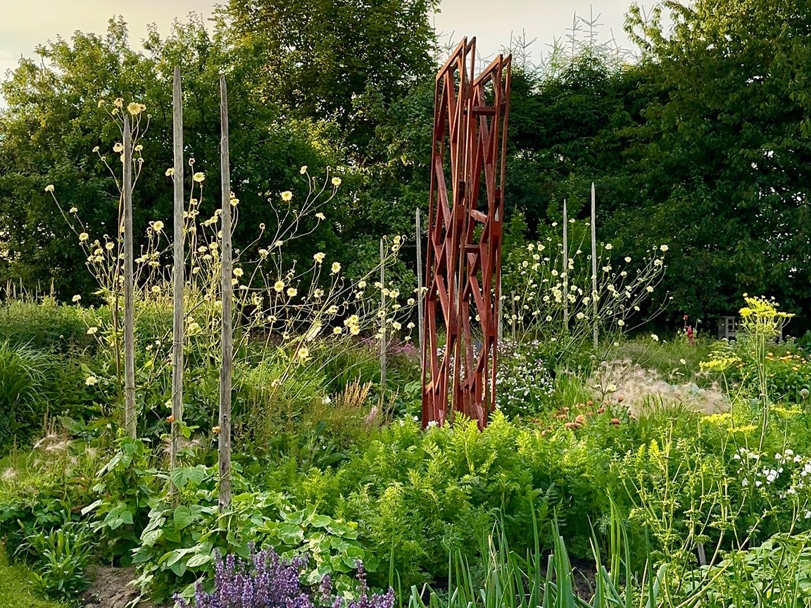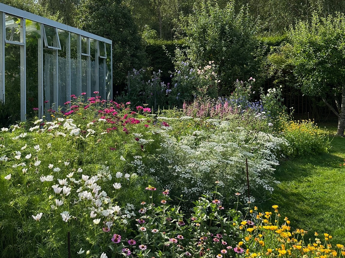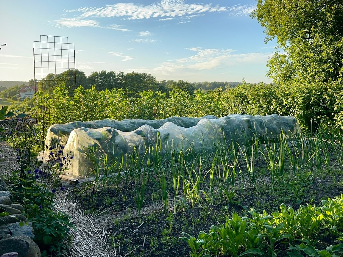 Lite gömd innanför granhäcken ligger vår 3 500 kvm stora trädgård. Här finns grönsaksland och blomsterland i ständig förändring när vi provar nya sorter och kombinationer varje år.