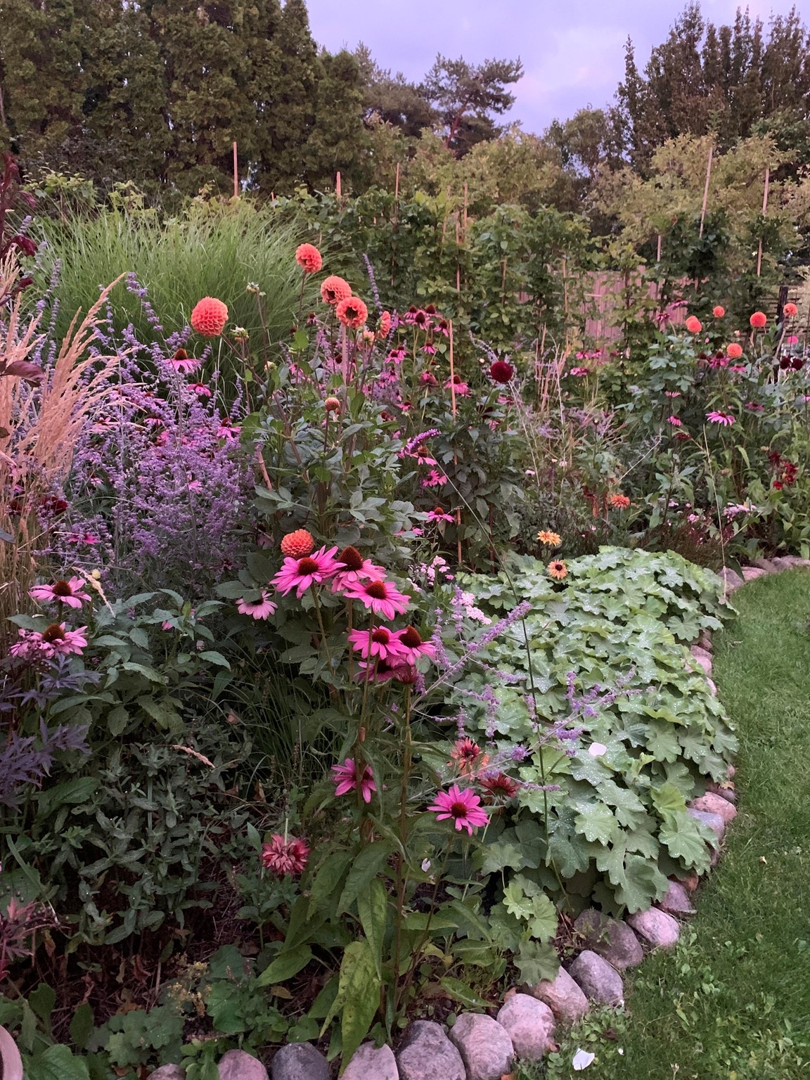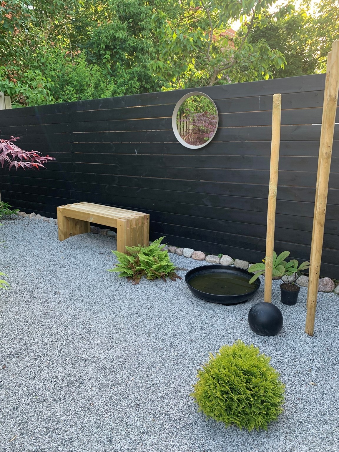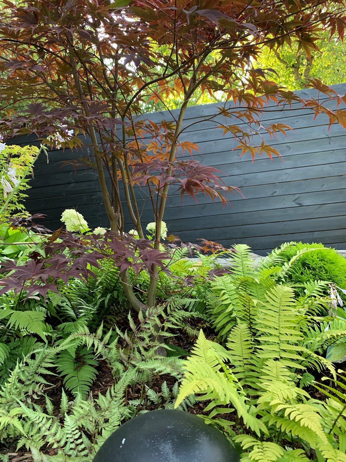 Detta är en trädgård som jag startade att bygga upp från grunden 2019. Från början fanns här ingenting , bara gamla thujor och nåt gammalt äppelträd. Tanken är att trädgården ska ha olika rum, med plats för odling och rum för avkoppling. Det finns flera sittplatser runtom i trädgården. Jag är väldigt glad i kontraster och bladformer, men även i blommande växter. Här finns det en härlig blandning av japanska lönnar,hostor och olika slags bräken. Jag har också några lite mer spännande träd såsom varigerat Tulpanträd, Ambraträd, Silkesträd och Katsura. Det finns även flera solrabatter med blommor i olika färgteman. Jag försöker skapa en trädgård med så mycket liv som möjligt, och att ha ett hållbart tänk där inget går till spillo. Jag använder mig av flera olika regnvattenstunnor för att samla vatten till trädgården, och även komposter för att göra jord. Mina höns hjälper också till 😊