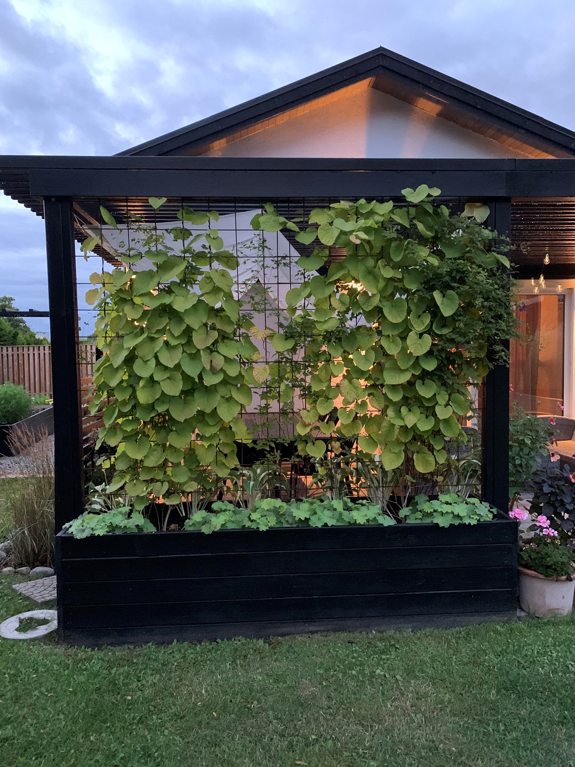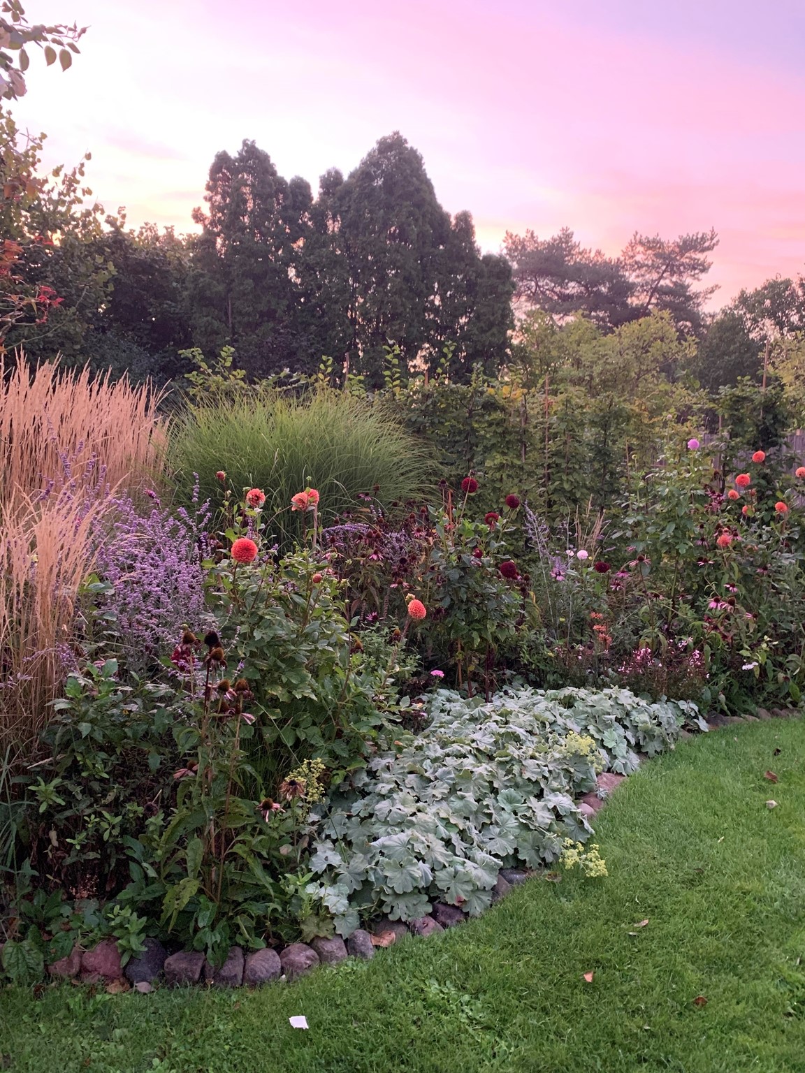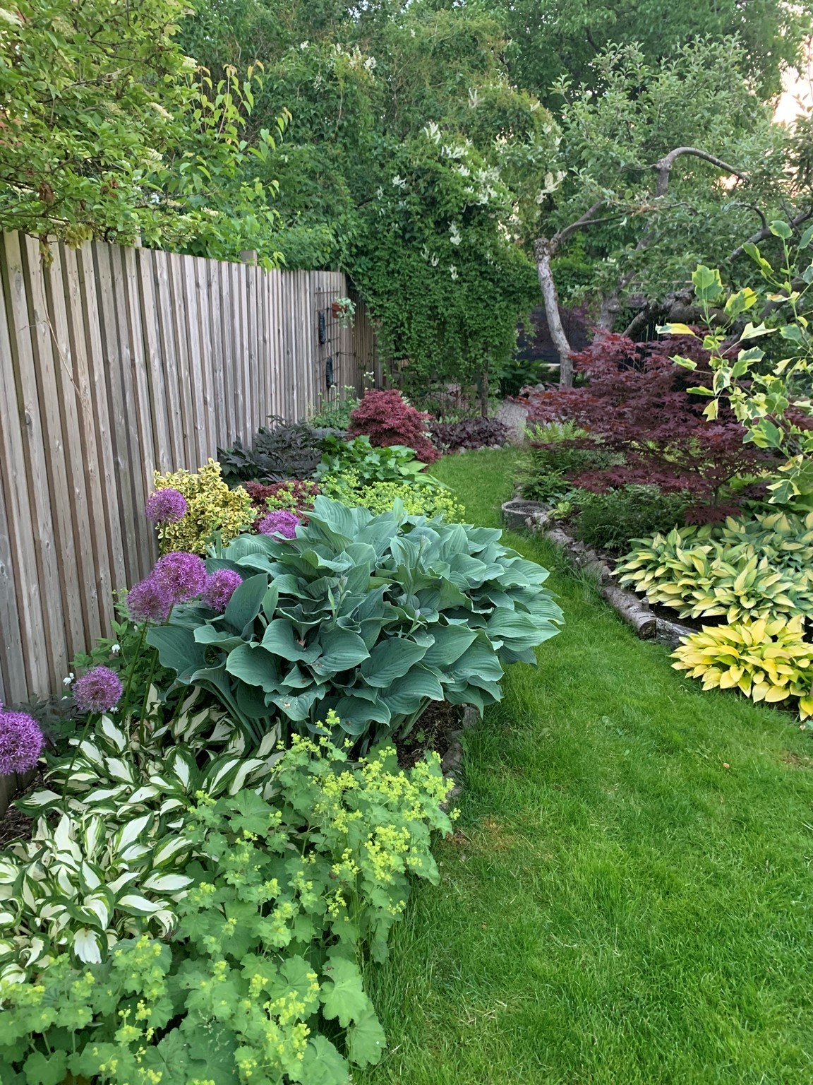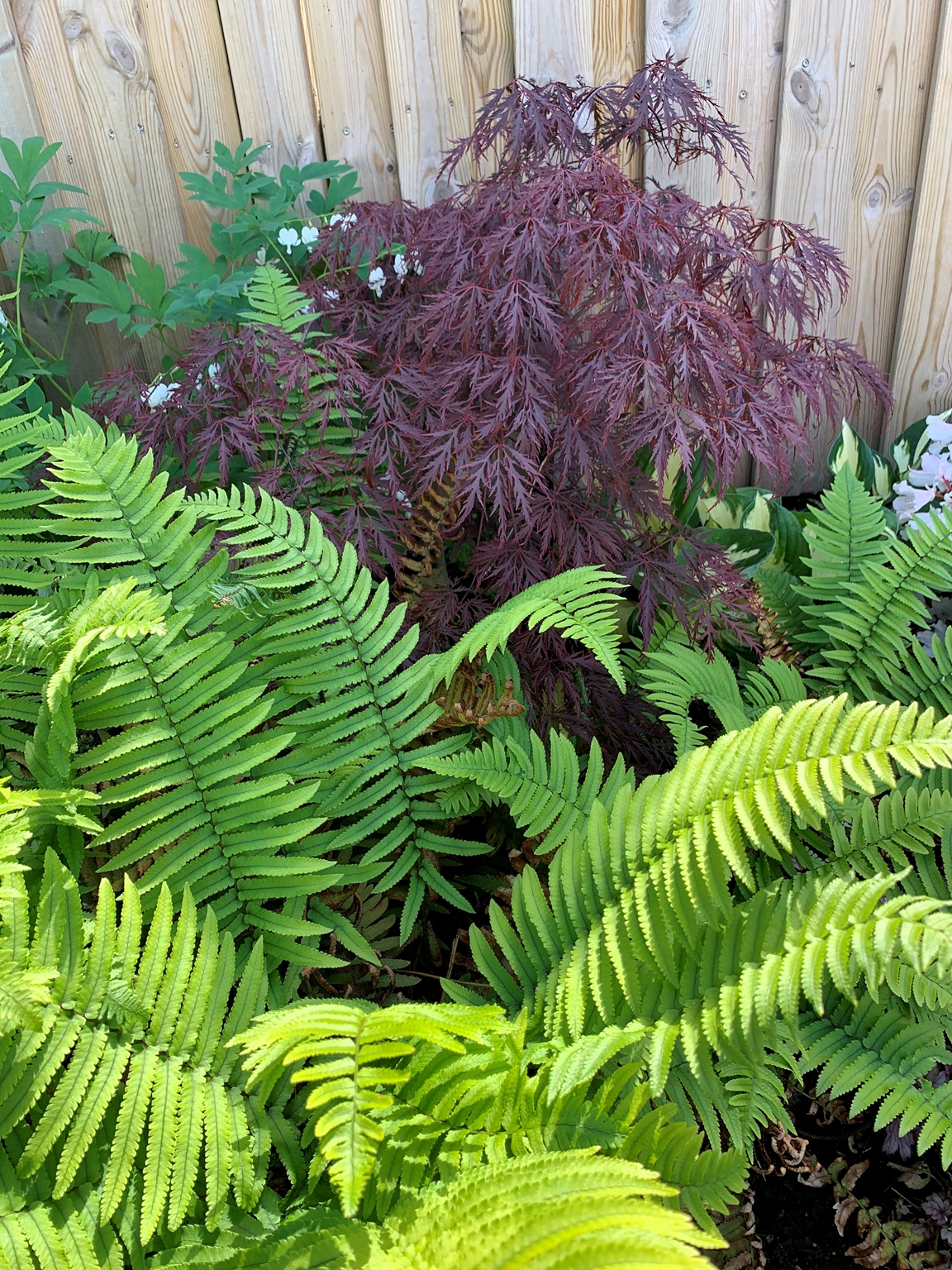 Detta är en trädgård som jag startade att bygga upp från grunden 2019. Från början fanns här ingenting , bara gamla thujor och nåt gammalt äppelträd. Tanken är att trädgården ska ha olika rum, med plats för odling och rum för avkoppling. Det finns flera sittplatser runtom i trädgården. Jag är väldigt glad i kontraster och bladformer, men även i blommande växter. Här finns det en härlig blandning av japanska lönnar,hostor och olika slags bräken. Jag har också några lite mer spännande träd såsom varigerat Tulpanträd, Ambraträd, Silkesträd och Katsura. Det finns även flera solrabatter med blommor i olika färgteman. Jag försöker skapa en trädgård med så mycket liv som möjligt, och att ha ett hållbart tänk där inget går till spillo. Jag använder mig av flera olika regnvattenstunnor för att samla vatten till trädgården, och även komposter för att göra jord. Mina höns hjälper också till 😊