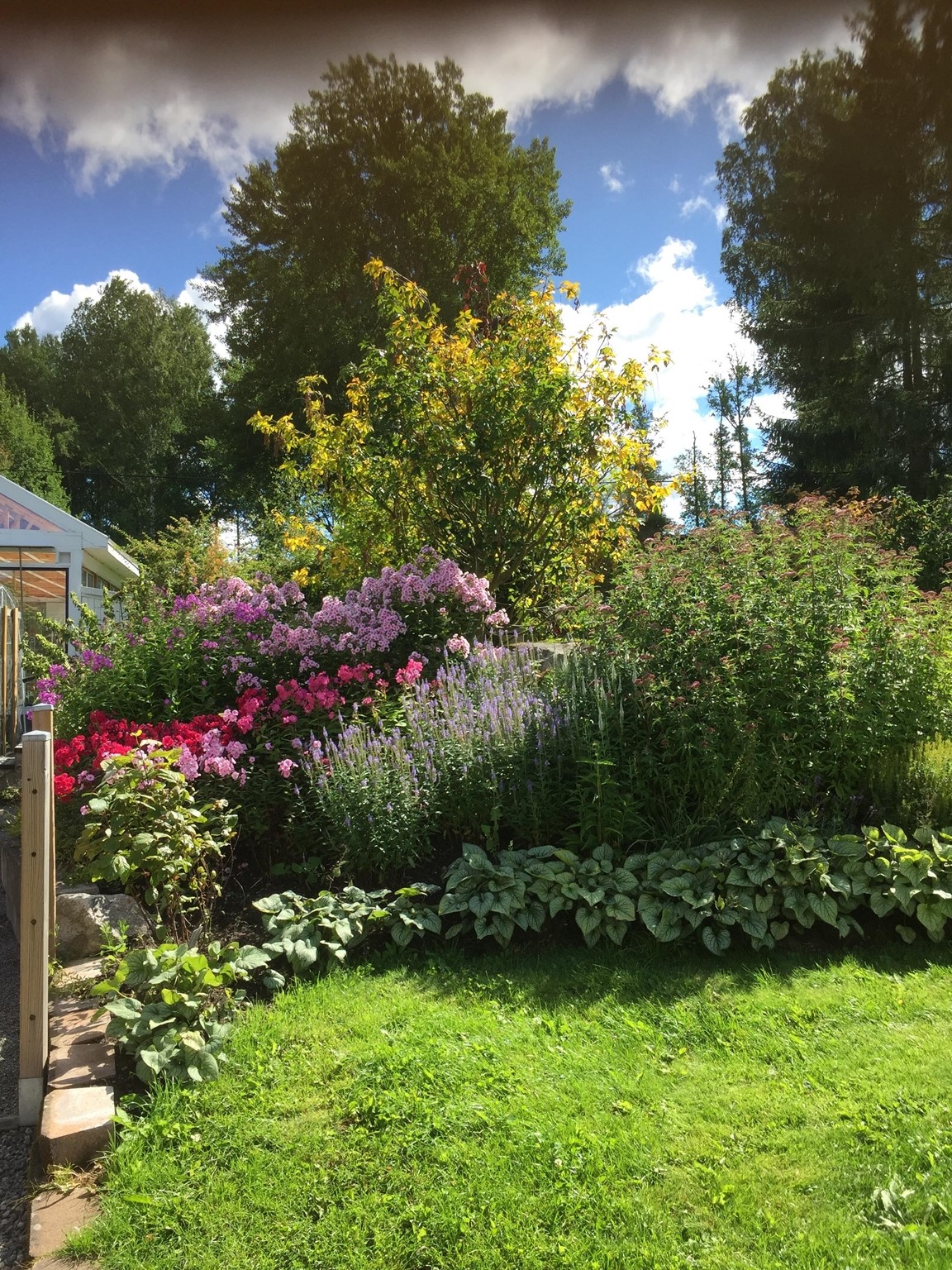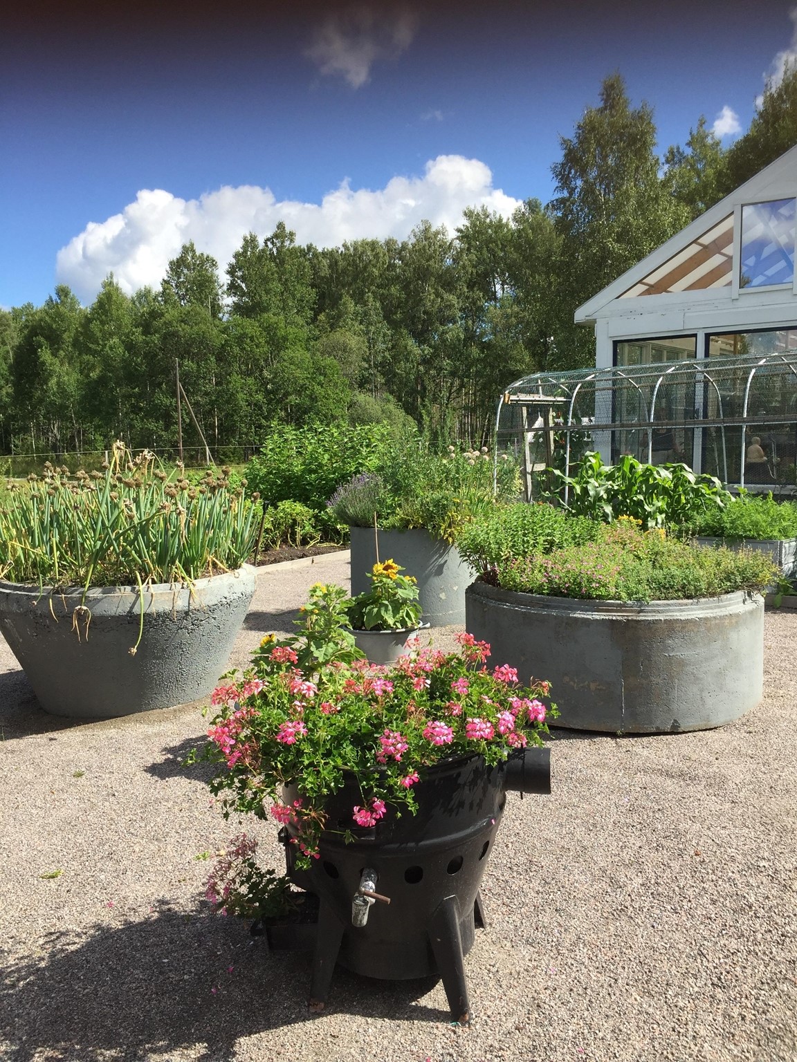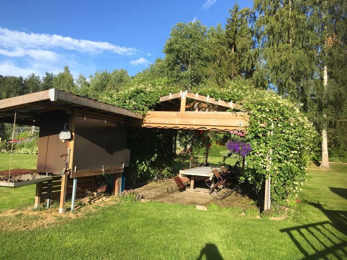 En trädgård på 3000 kvadrat som man kan njuta av och gå runt och äta sig igenom. Ett växthus på 60 kvadrat och ett stort grönsaksland. Många olika bärbuskar och perenna grönsaker. Flera olika fruktträd varav en del är små och behöver växa till sig för att ge full skörd. Vi har även en damm med vackra växter runt och en ”sandstrand” med vilstolar för en stunds avkoppling. Lite olika fikaplatser så man kan välja skugga eller sol. Vi har också en helt otrolig jordkällare med högt i tak och ordning och reda. Naturligtvis har vi 2 stora perenna rabatter varav den ena är mer buskar och marktäckare och den andra mer blommor.
