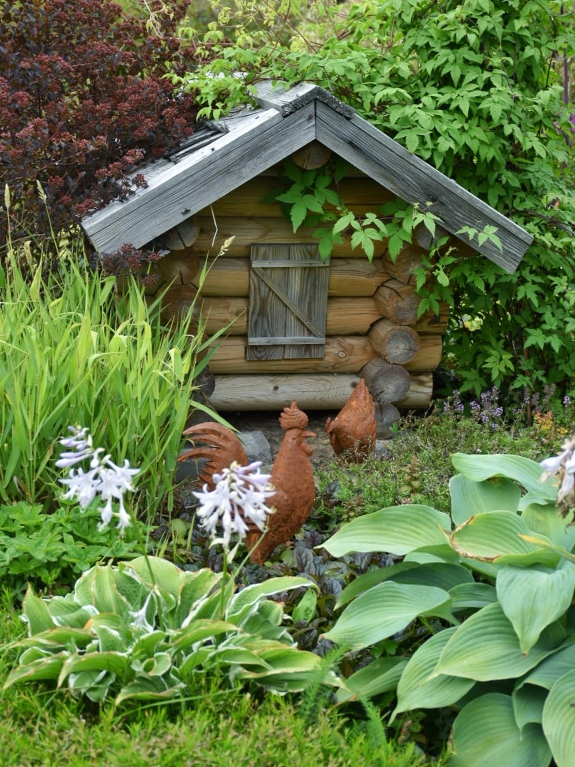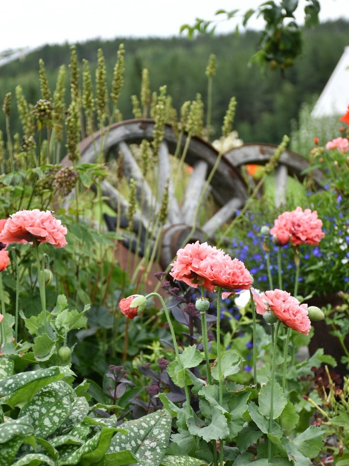 En trädgård uppbyggd med stenar från naturen och återbruk av bl a. hässjevirke och stockar.I rabatterna växer perenner i olika färger och storlekar blandat med sommarblommor.