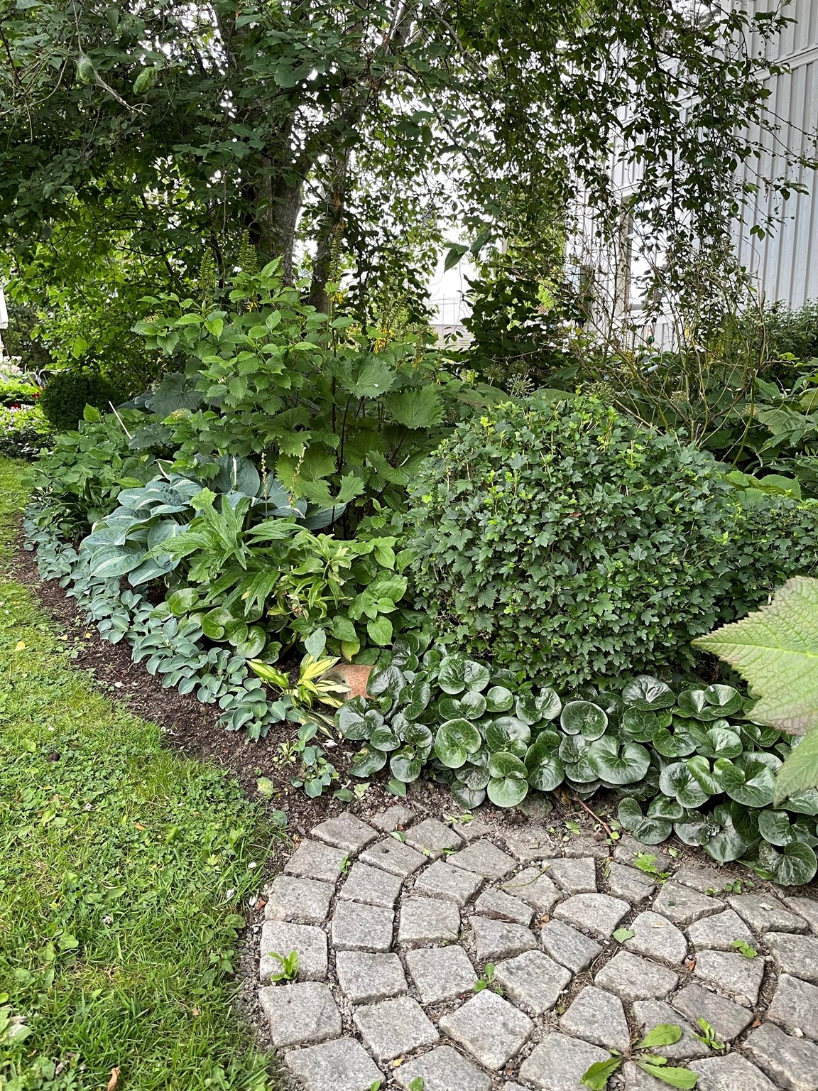 Det finns en stor gemensam skuggrabatt som sträcker sig över tomtgränsen och knyter samman trädgårdarna.