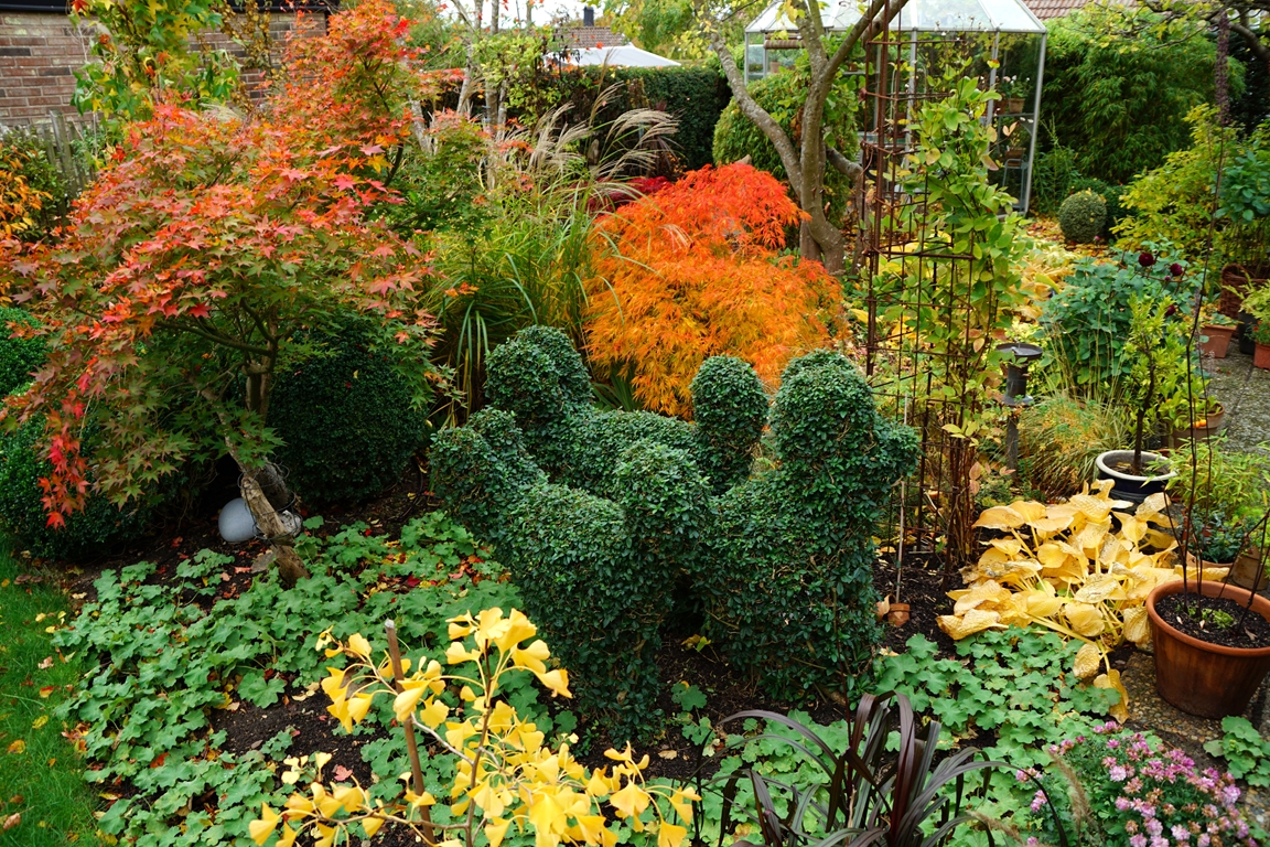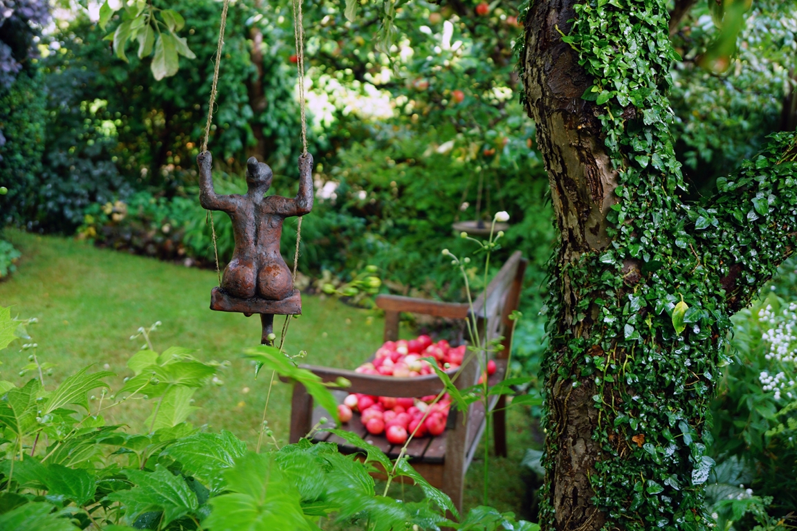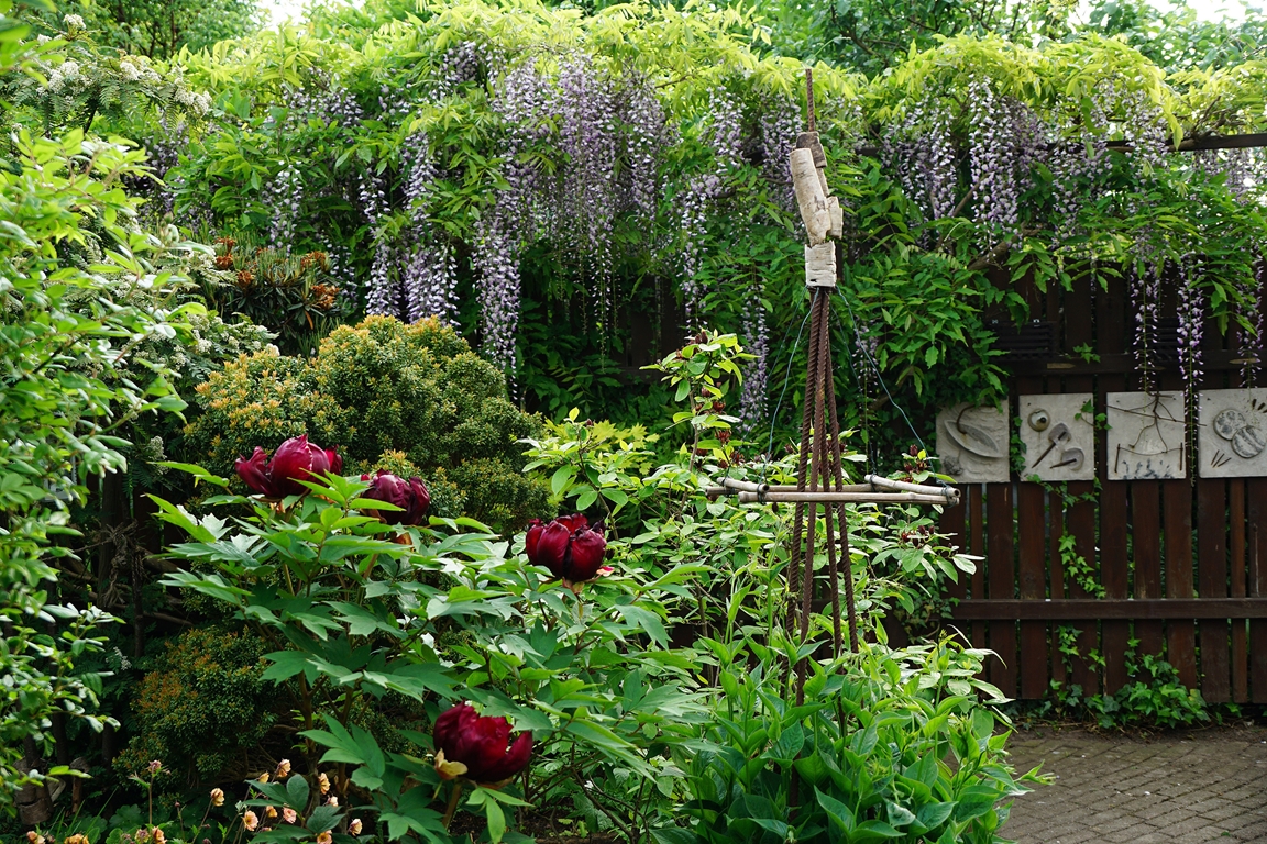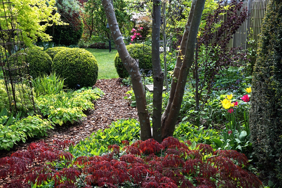 Även en liten trädgård tillåter spännande träd och buskar. Lönnar med vackra stammar och blad tillhör favoriterna. Vi har även planterat ett ambraträd, en rödbladig katsura, ett japanskt gaffelolvon, en kryddbuske och en skenkamelia. Ett nytt intressse är ormbunkar och ett antal olika har planterats. Växthuset omgivet av grönska ger en fin utblick över delar av trädgården. Det finns också ett litet stenparti. Flera olika uteplatser finns för sol och skugga. Under plommonträden finner vi behaglig skugga en varm sommardag.