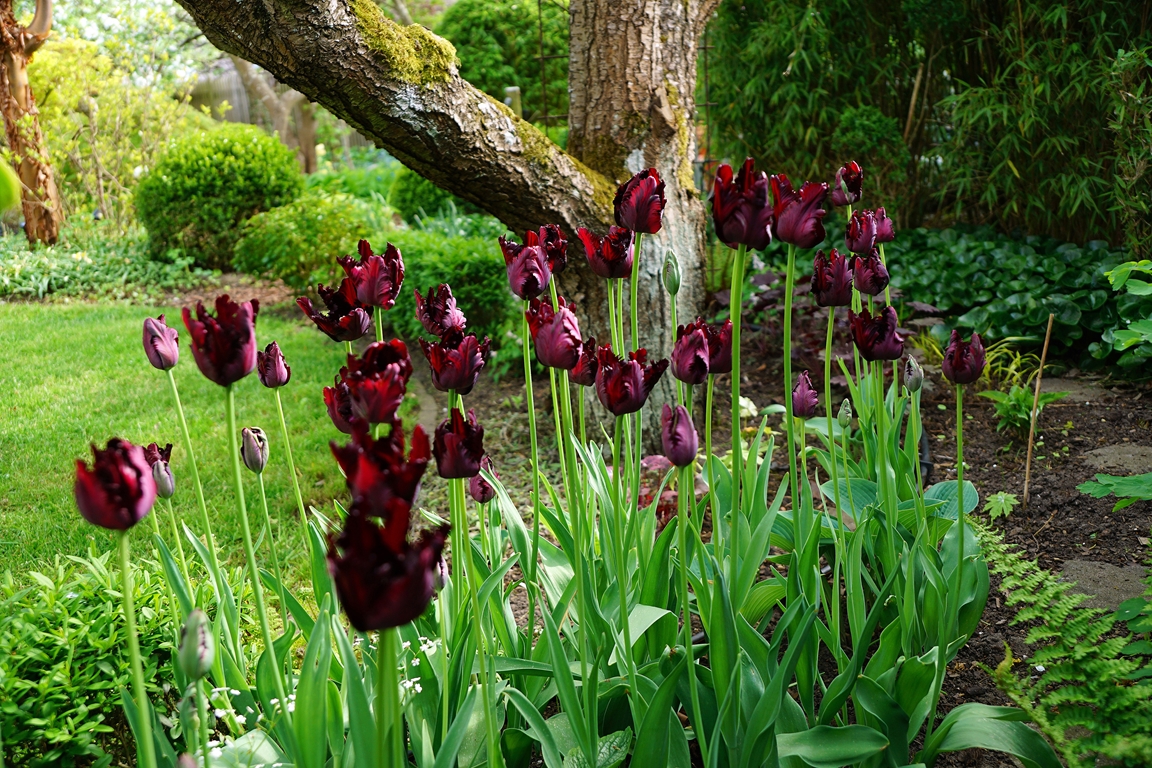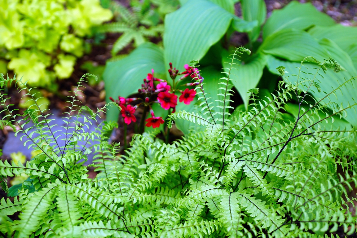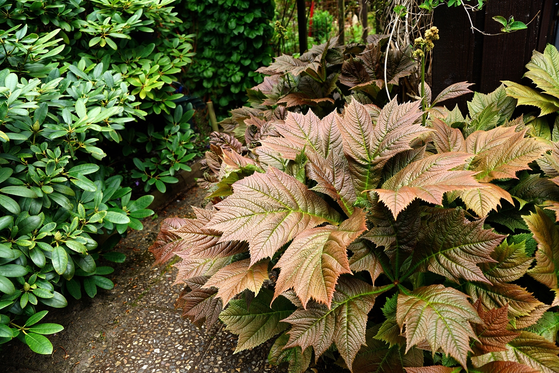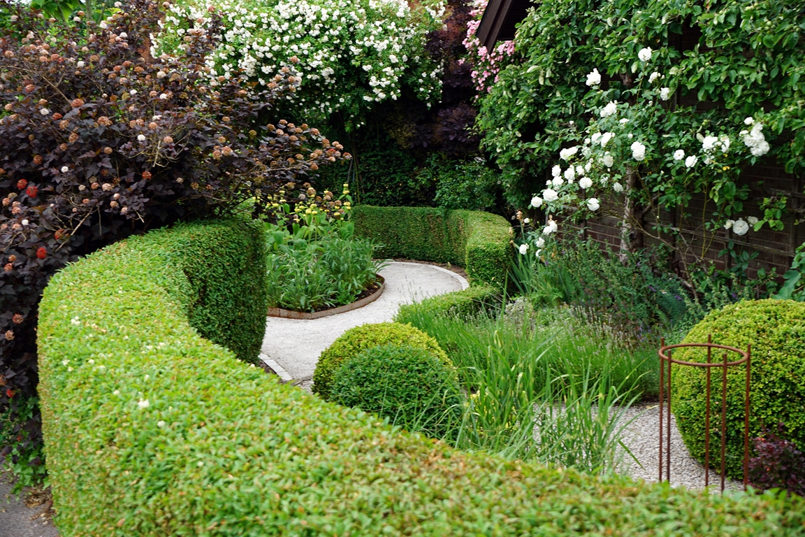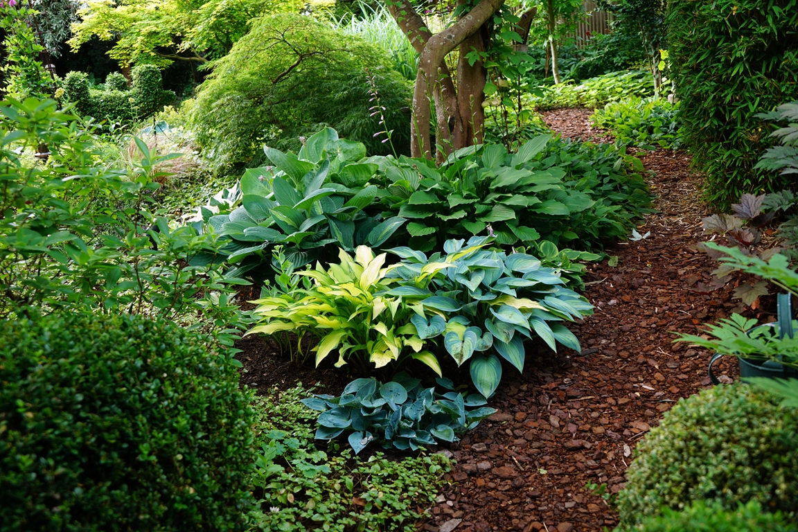 Även en liten trädgård tillåter spännande träd och buskar. Lönnar med vackra stammar och blad tillhör favoriterna. Vi har även planterat ett ambraträd, en rödbladig katsura, ett japanskt gaffelolvon, en kryddbuske och en skenkamelia. Ett nytt intressse är ormbunkar och ett antal olika har planterats. Växthuset omgivet av grönska ger en fin utblick över delar av trädgården. Det finns också ett litet stenparti. Flera olika uteplatser finns för sol och skugga. Under plommonträden finner vi behaglig skugga en varm sommardag.