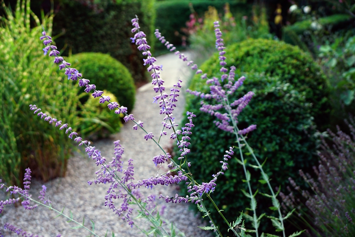 Vi har en liten (ca 600 m2) villaträdgård som vi delat in i olika rum. Trädgården försöker balansera form och färg på ett harmoniskt sätt. Folke tycker om att formklippa. Förutom klot och andra geometriska former möter du ligusterhundar omgivna av daggkåpa. Jag, Margareta, väljer gärna olika bladväxter och prydnadsgräs. Även om växtintressset ibland tar överhanden söker jag en sammanhållande enhet. Bland allt det gröna kan du hitta Folkes betongarbeten såväl på mark som på vägg.