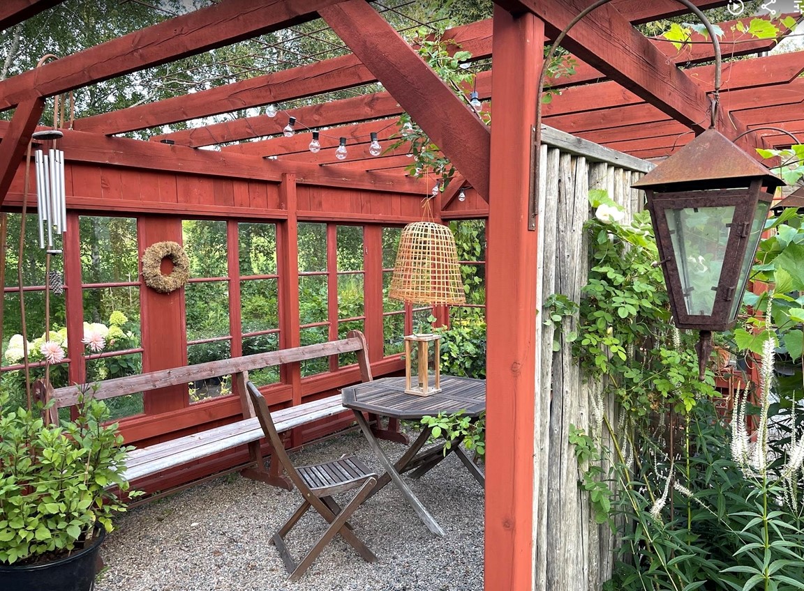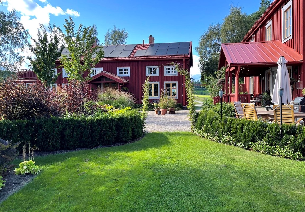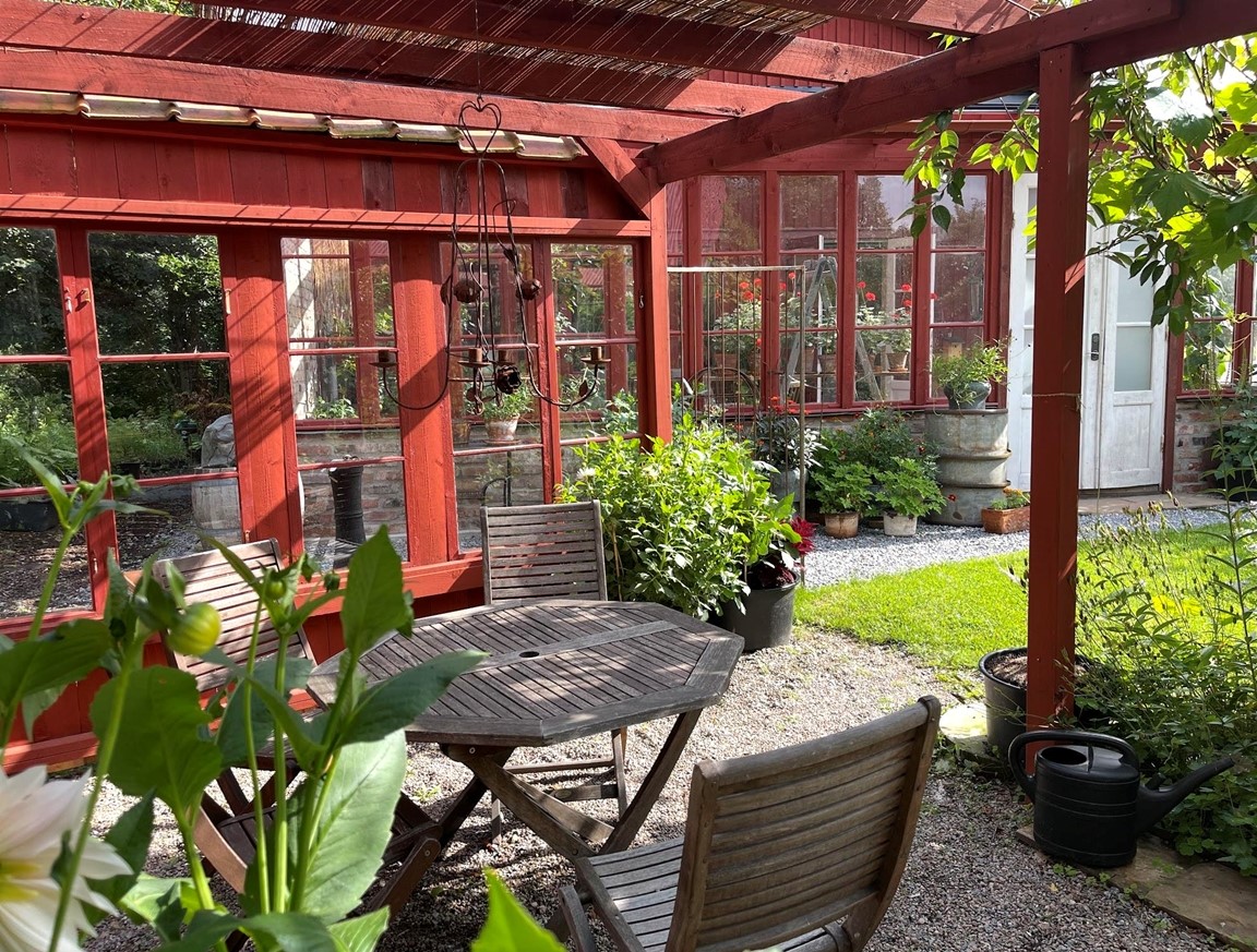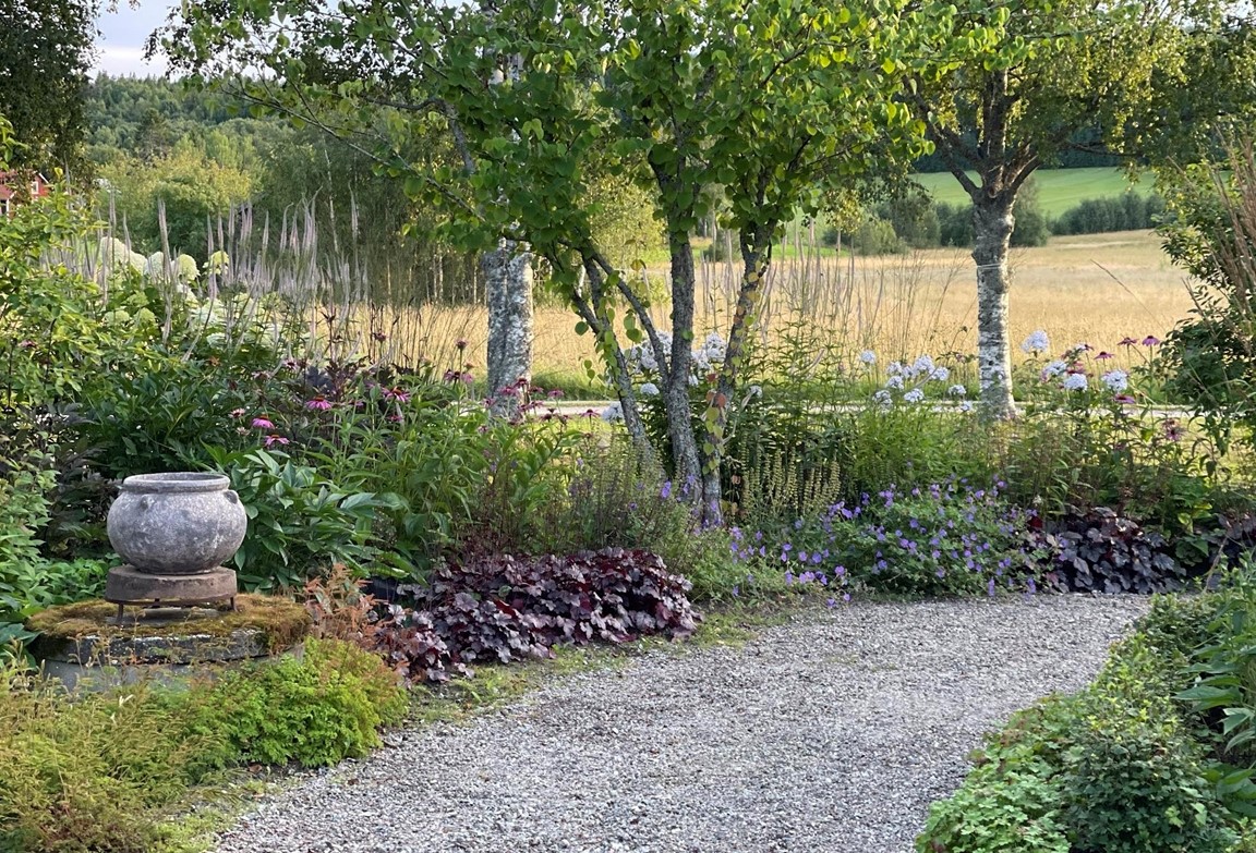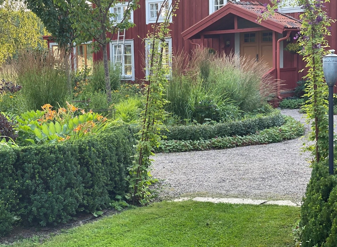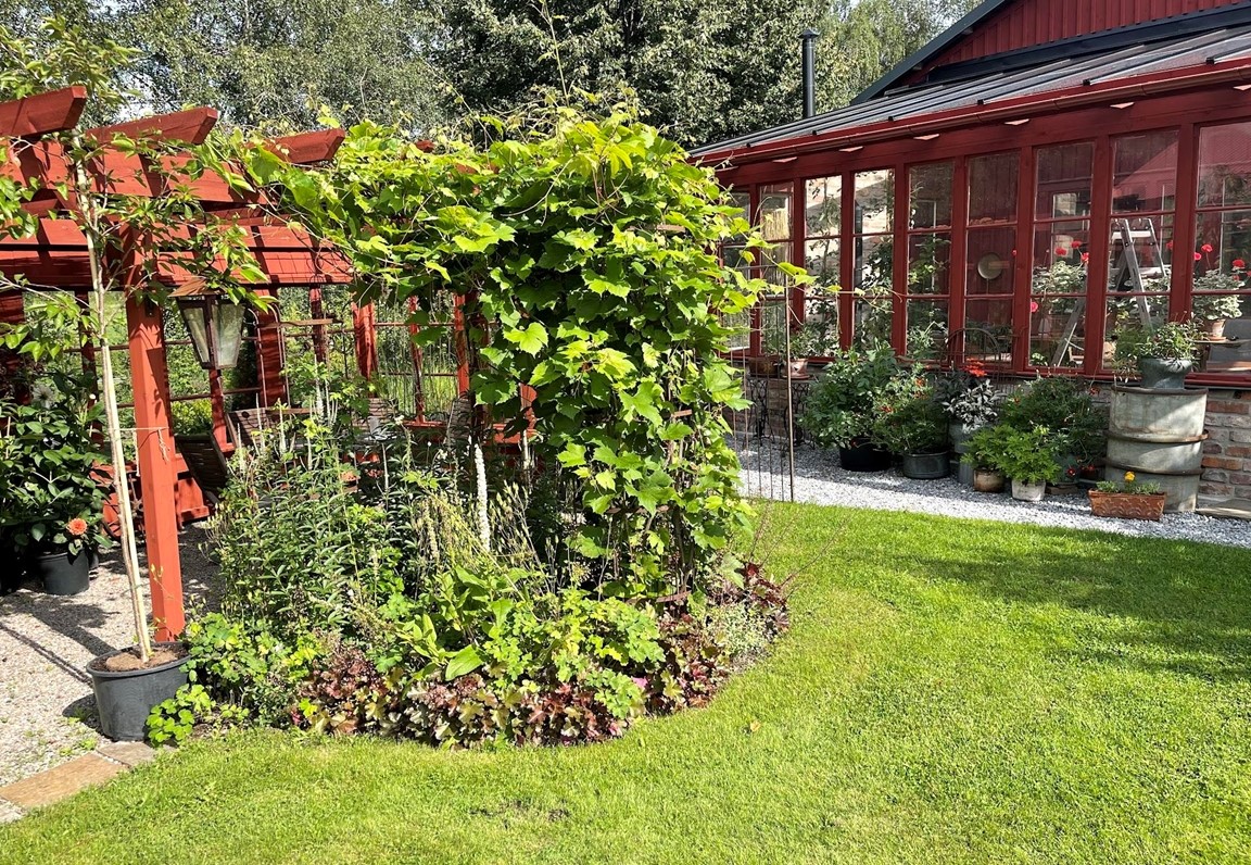 Trädgård vid äldre Hälsingegård. Grusgångar, stödmur i natursten, sittplatser i olika lägen och stora perennaplanteringar. Växthus på tegelmur och en pergola för skugga. Härlig utsikt över åkrar upp mot skogen.