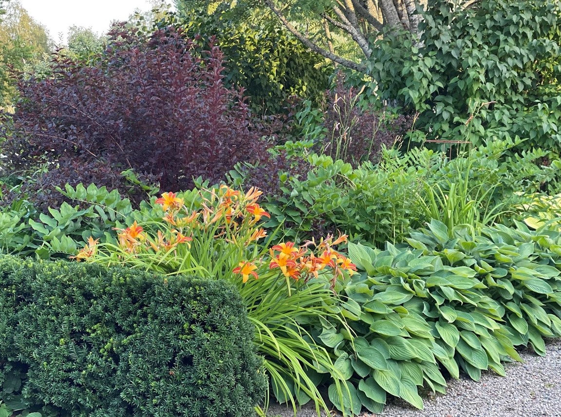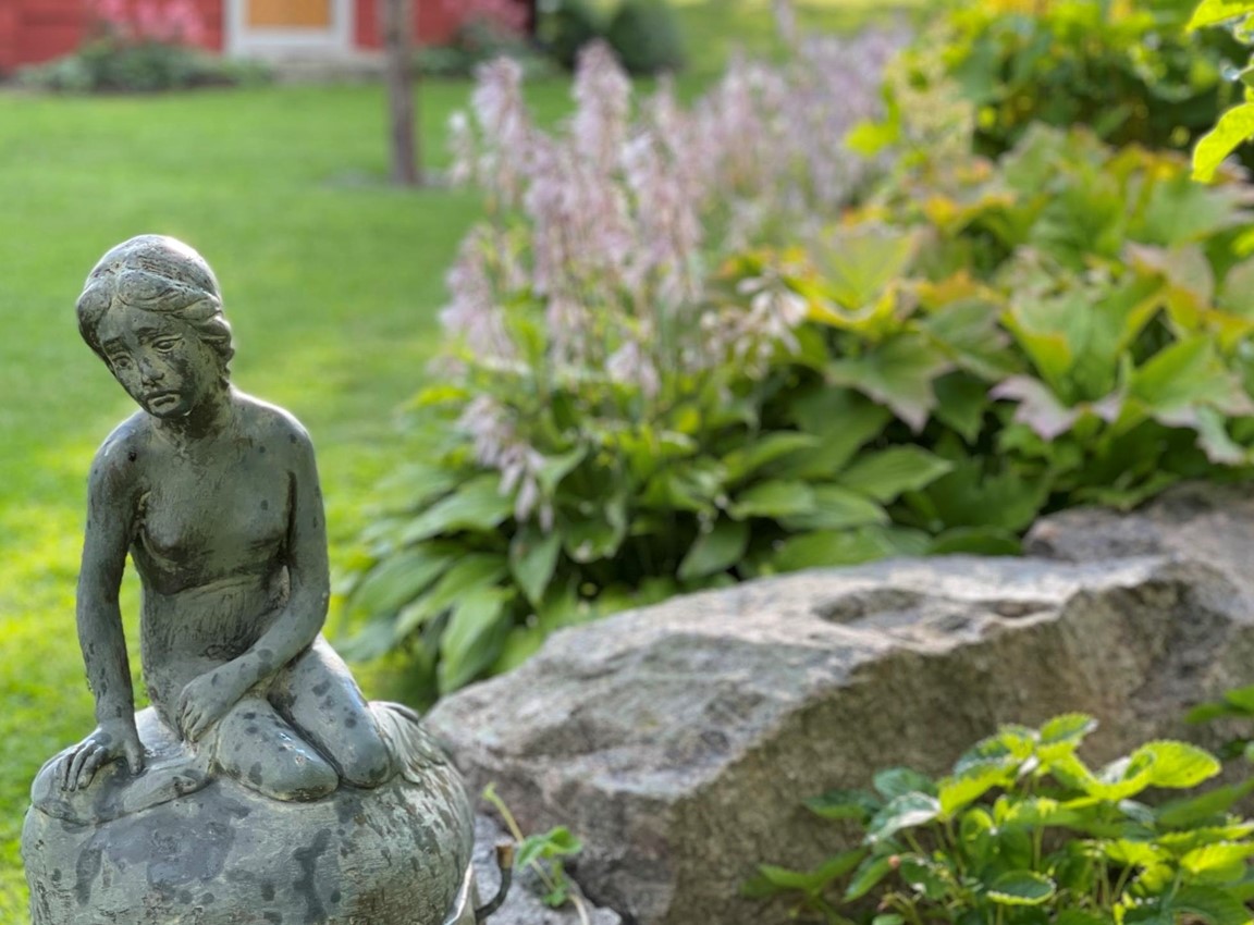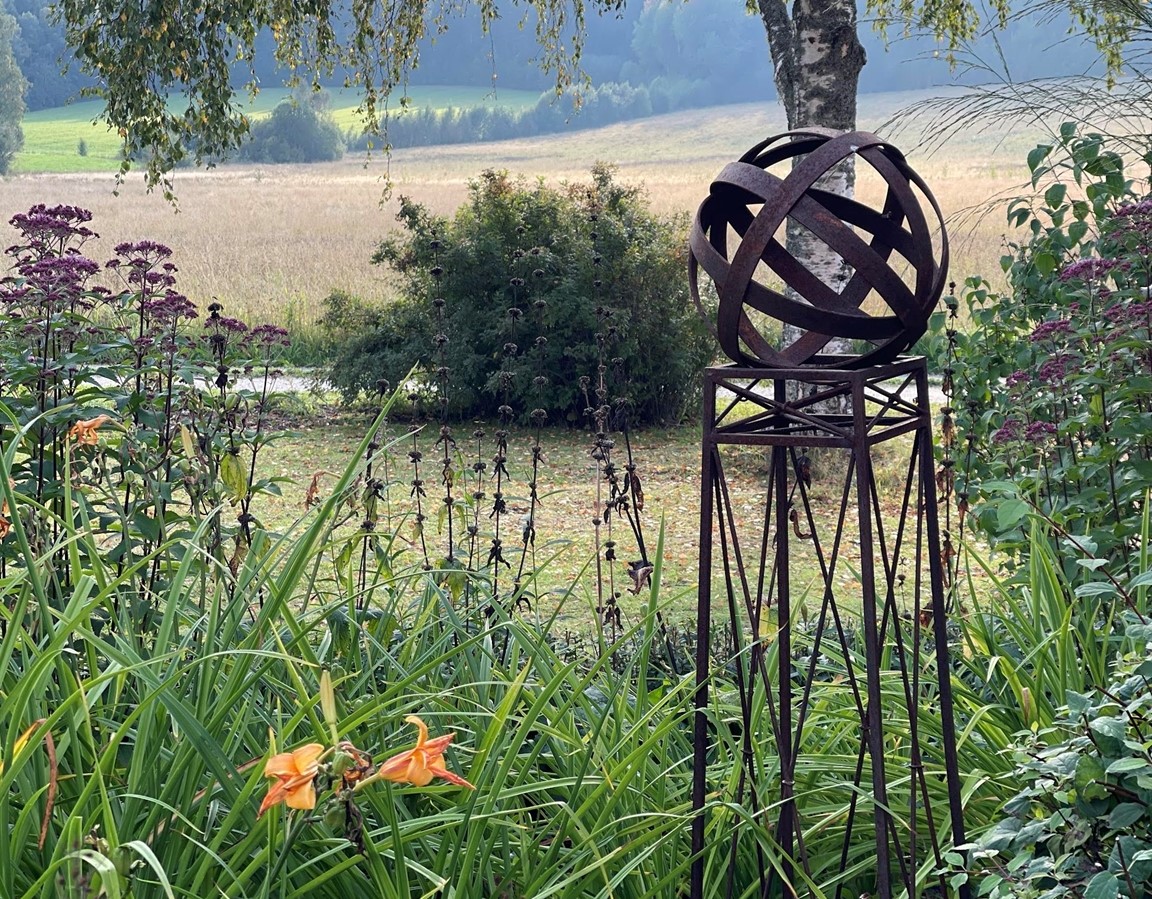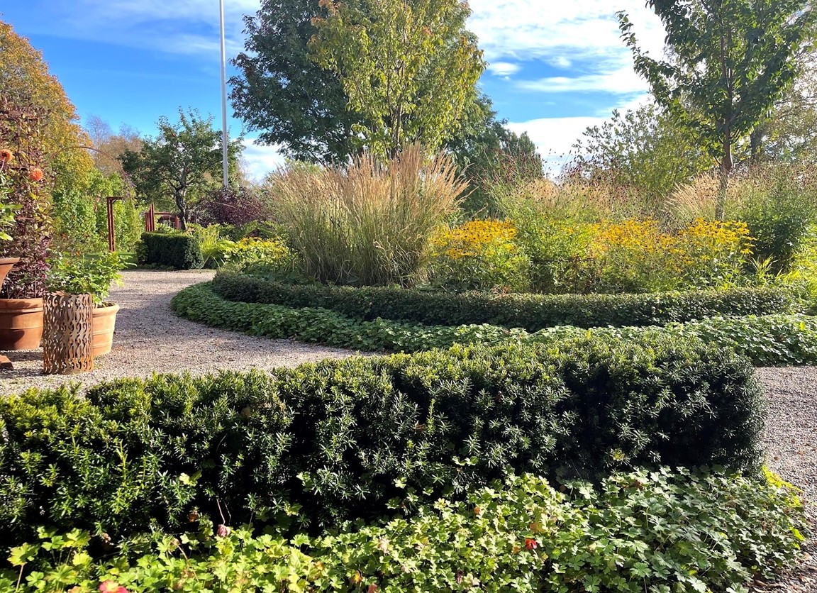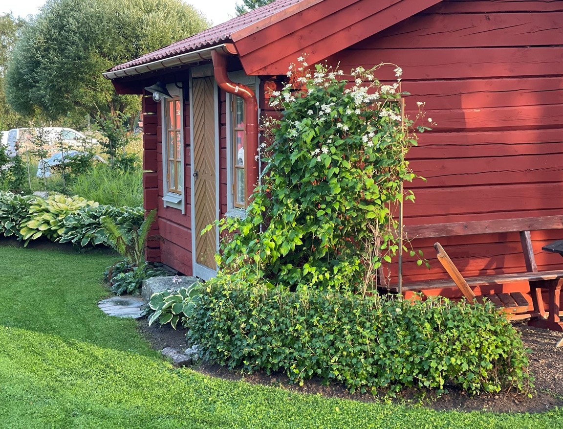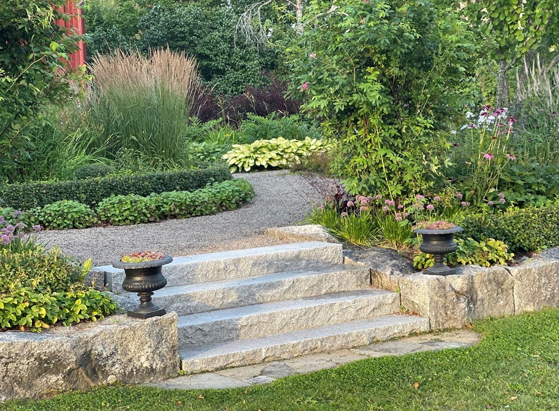 Trädgård vid äldre Hälsingegård. Grusgångar, stödmur i natursten, sittplatser i olika lägen och stora perennaplanteringar. Växthus på tegelmur och en pergola för skugga. Härlig utsikt över åkrar upp mot skogen.