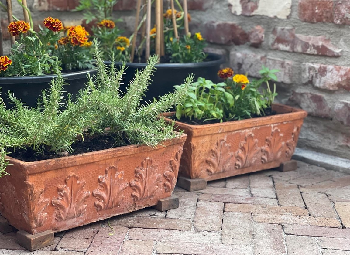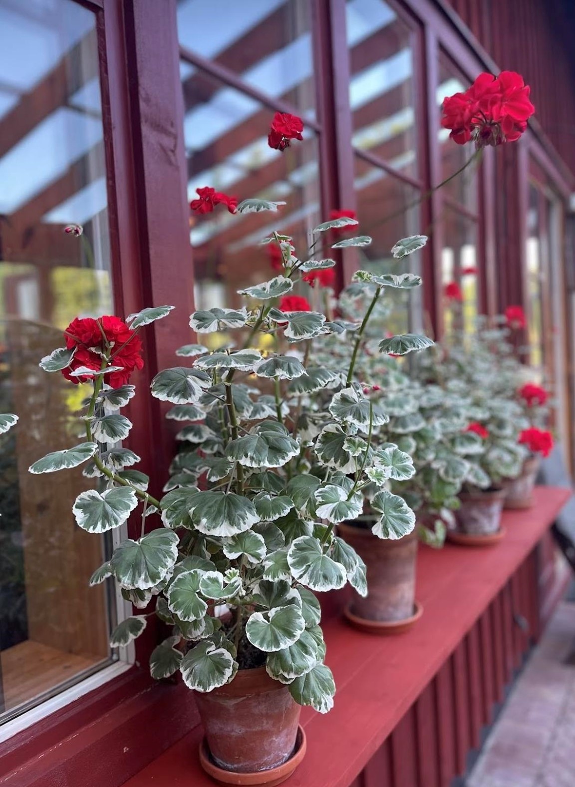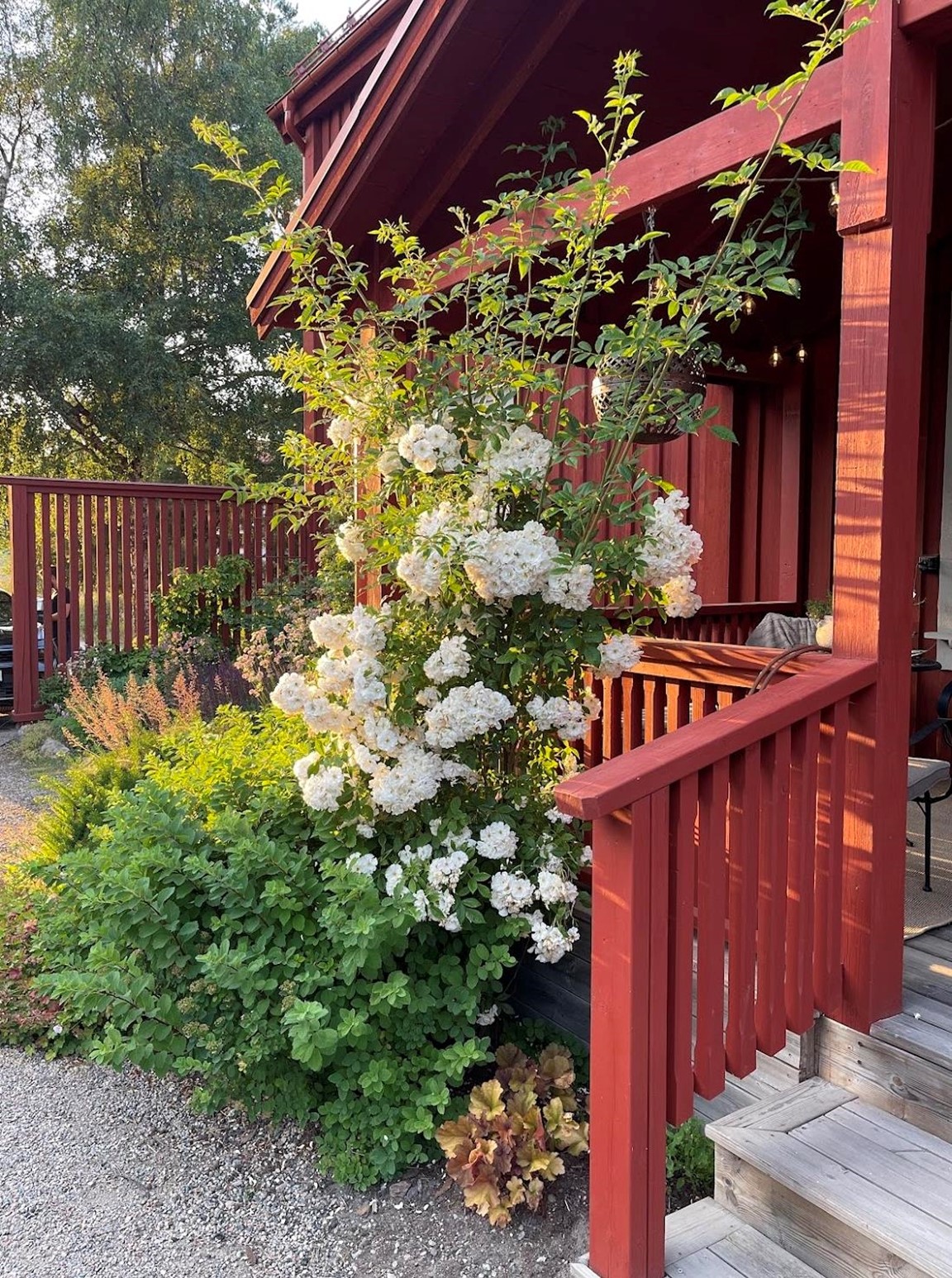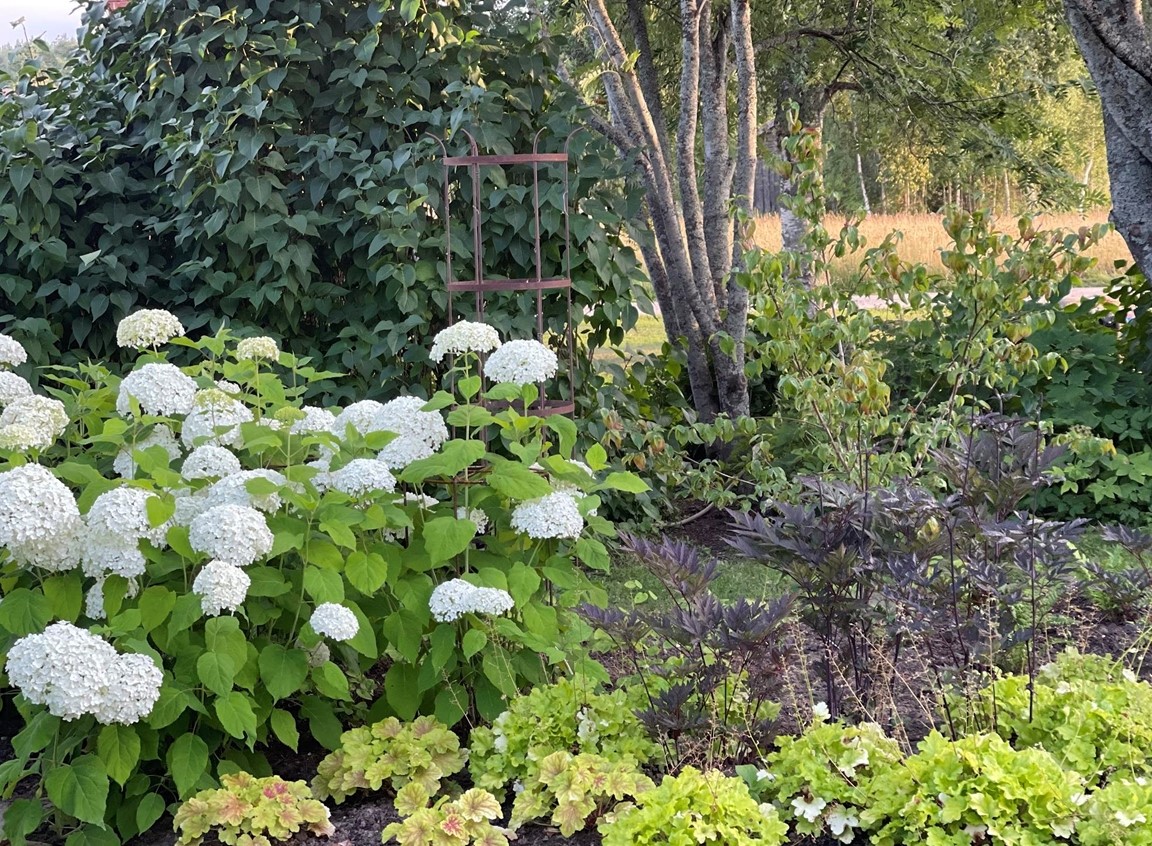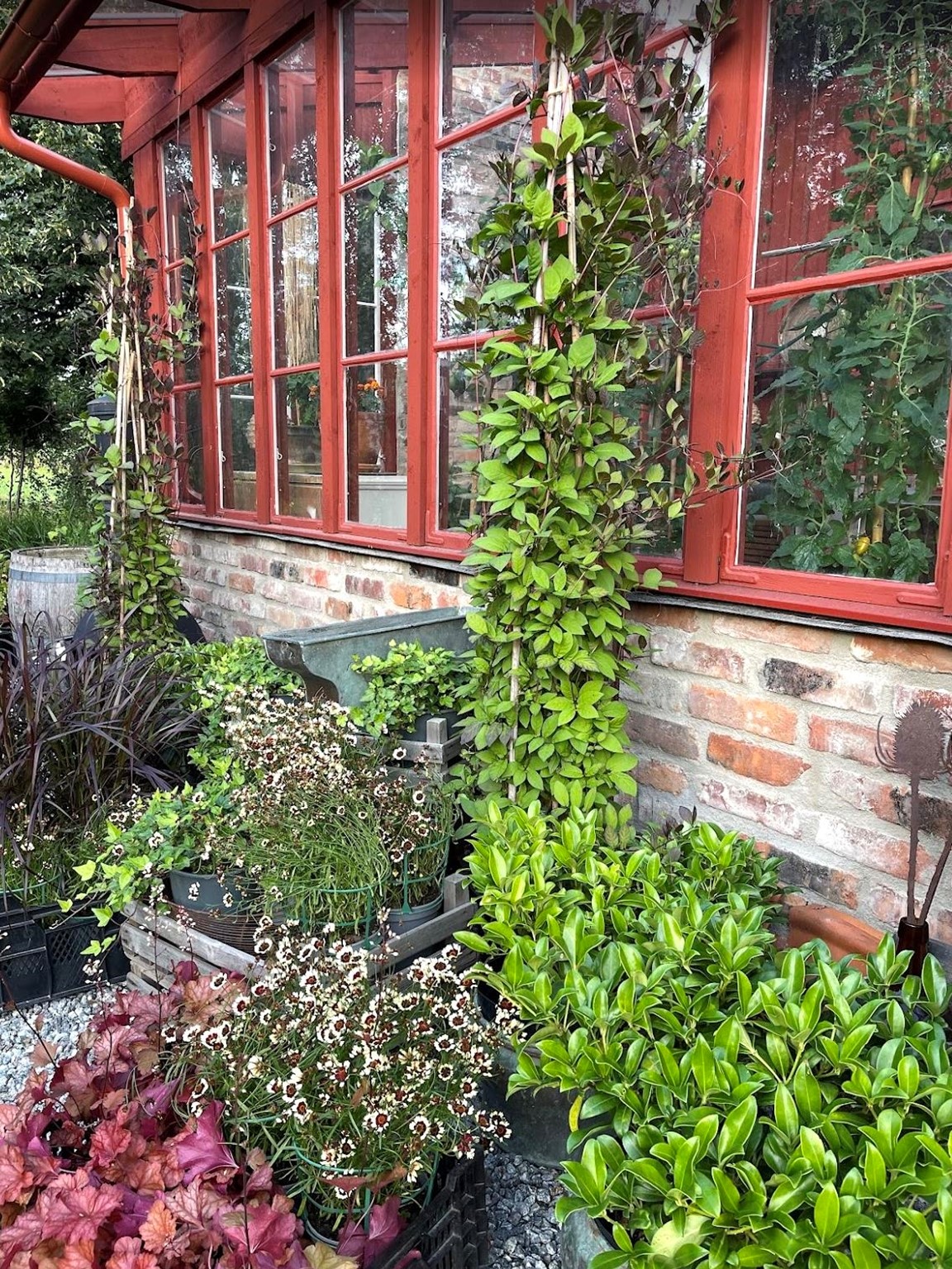 Trädgård vid äldre Hälsingegård. Grusgångar, stödmur i natursten, sittplatser i olika lägen och stora perennaplanteringar. Växthus på tegelmur och en pergola för skugga. Härlig utsikt över åkrar upp mot skogen.